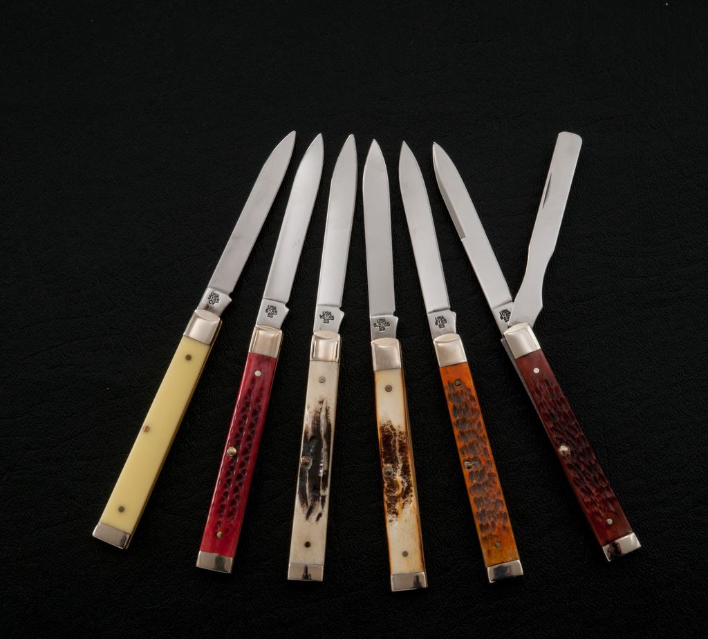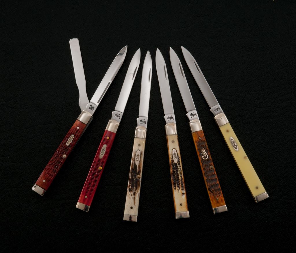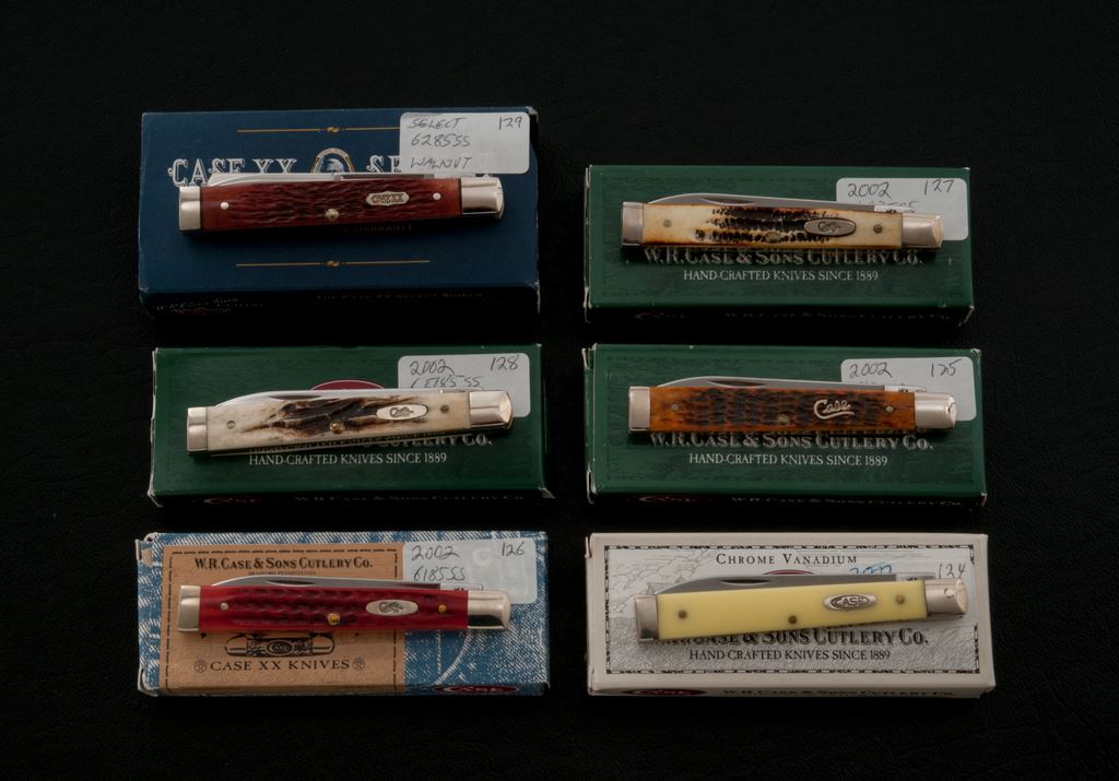 Lot of Six (6) New-in-the-Box Case ''Doctors'' Folding Knives, including the following models and handle material: Model #3185 CV, Chrome Vanadium Series, smooth yellow composition; #6185 SS, autumn bone; #6185 SS, Pocket Worn Series, ''Old Red'' bone; #V6185 SS, vintage bone; #6.5185 SS, bonestag; and a Case XX Select Series, #6285 SS, walnut bone. All but the last knife comes in its original box with folding pamphlet and brown tissue paper. The Select Series knife comes in the original black case with the original slip cover. All are mfg'd in 2002. All are in excellent as new condition, never carried or sharpened. Est.: $200-$300/lot.