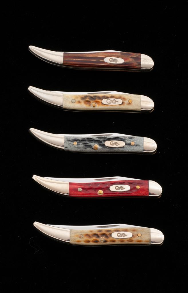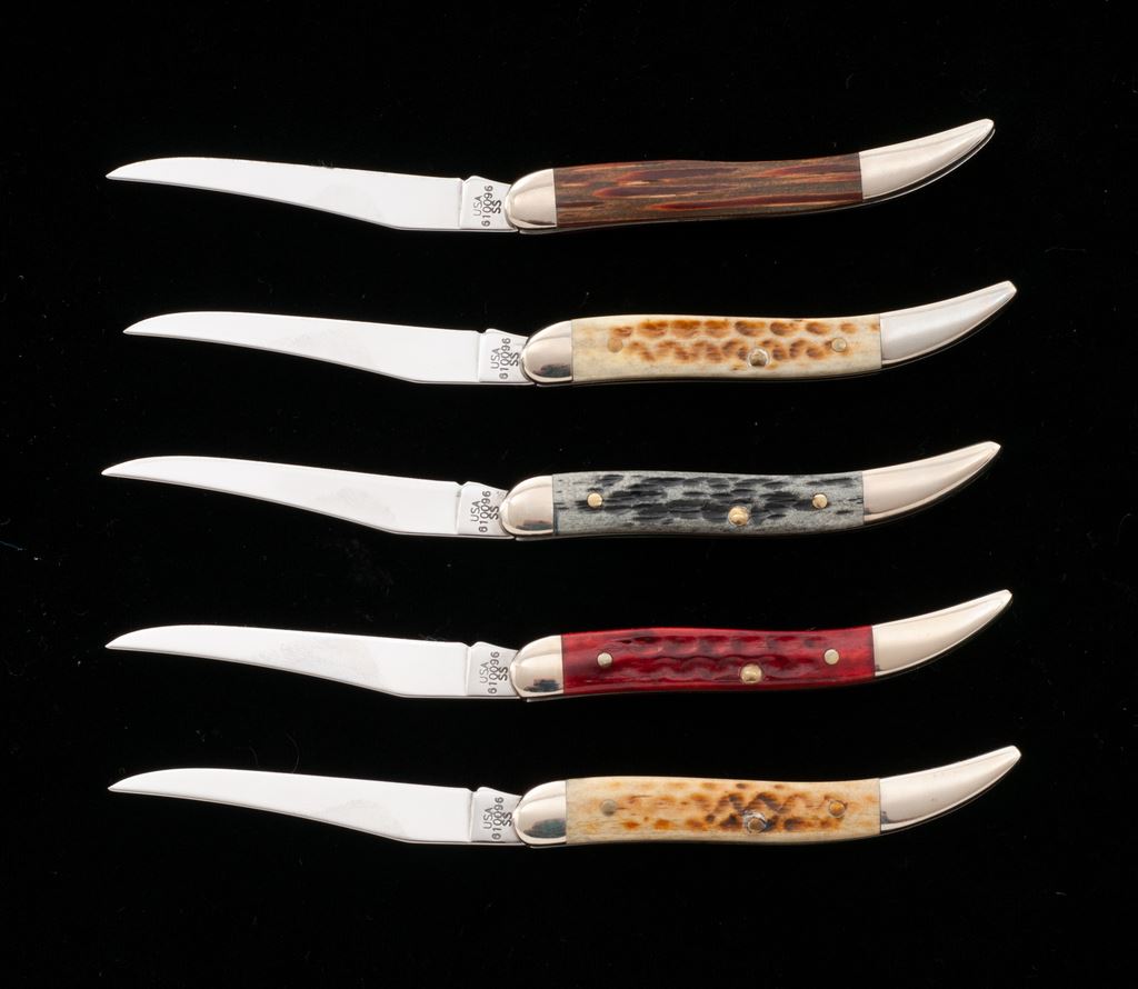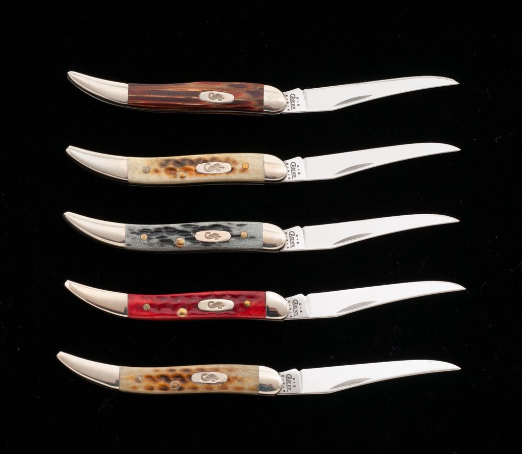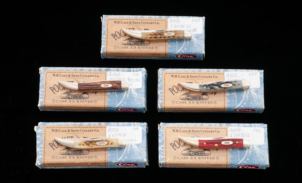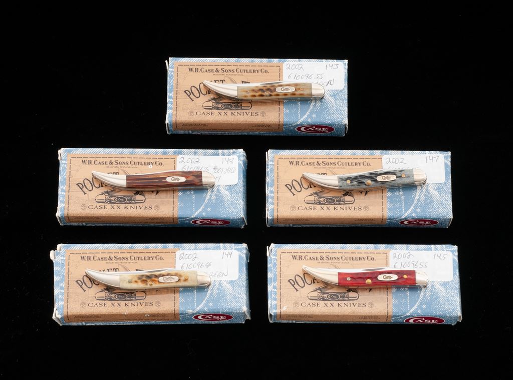 Lot of Five (5) New-in-the-Box Case ''Pocket Worn'' Series ''Texas Toothpick'' Folding Knives, including one with handles that are listed as ''Royal Palm''. In this lot you will find one each of the following models and handle material: Model #610096 SS, olive green bone; #610096 SS, olive green bone; #610096 SS, ''old red'' bone; #610096 SS, black bone; #610096 SS, Royal Palm. This knife is numbered #001 on one of the bolsters. The box is for the same model of knife but is listed with ''old red'' bone handles. A label has been added to the bottom of the box that reads ''#001, 1 of 100, Royal Palm''. Knives #1-4 come in their original box with folding pamphlet and brown tissue paper. All were manufactured in 2002. All are in excellent as new condition, never carried or sharpened. Est.: $200-$300/lot.