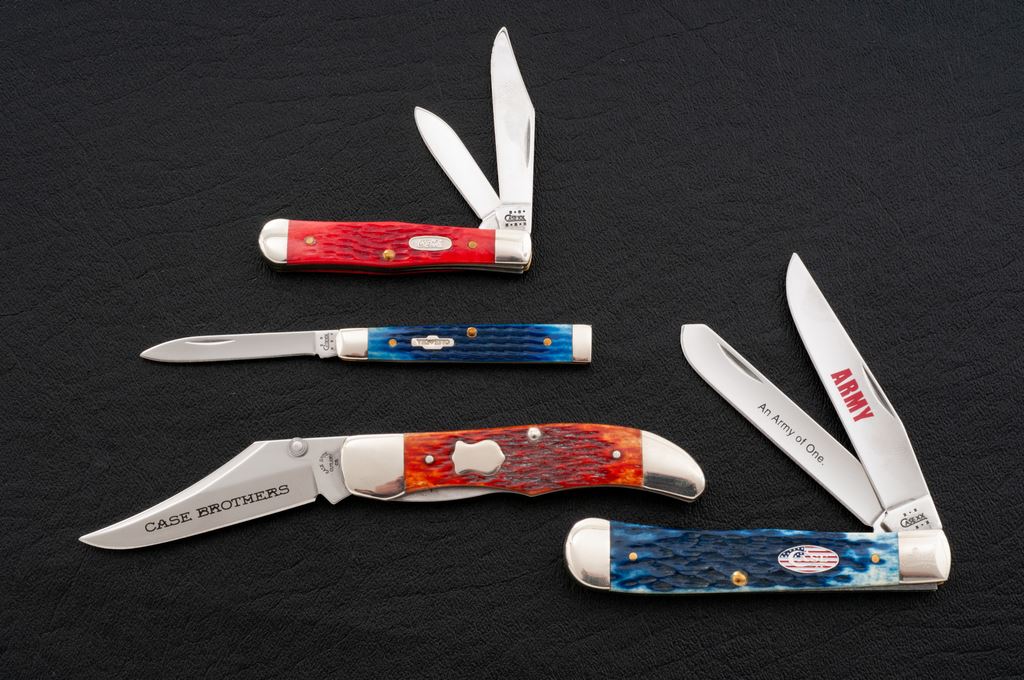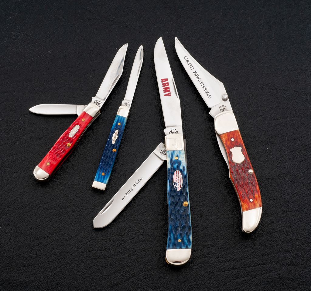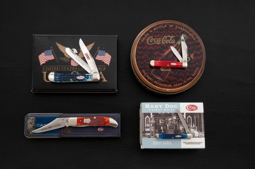 Lot of Four (4) Collectible Case Folding Knives: 1.) #62251/2 SS, ''Coke Bottle'' pattern, red bone handles, in Coca-Cola collector's tin, with standard Case knife paperwork. Condition is excellent, appearing as new, never carried or sharpened. 2.) #6254 SS, U.S. Army Commemorative, ''Trapper'' pattern, blue bone handles, red/white/blue Case shield, in original display box, with slipcover. Condition is excellent, appearing as new, never carried or sharpened. 3.) #6182 SS ''Baby Doc'' pattern, blue bone handles, in display tin, with slipcover and warranty paperwork. Condition is excellent, appearing as new, never carried or sharpened. 4.) #61265LC SS, Case Brothers Commemorative, ''Folding Hunter'' pattern, chestnut bone handles, in collector's tin, with slipcover, warranty card, and thin pouch. Condition is excellent, never carried or sharpened, metal with a few very fine scratches and small marks from handling. Est.: $160-$260/lot.