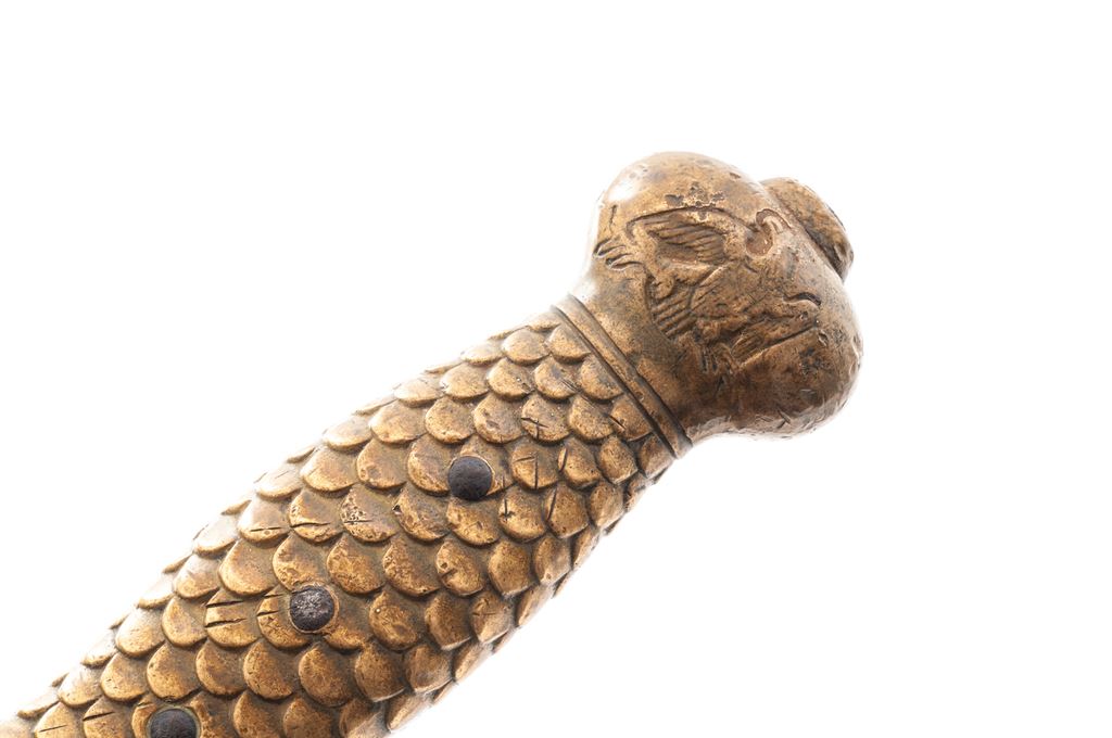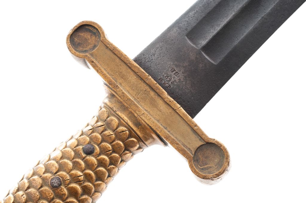 U.S. Ames Model 1832 Artillery Short Sword, 18.75'' blade, 24.75'' overall, scalloped brass handle with ''(American Eagle/Shield/Arrows'' on each side of the pommel. Brass guard is marked in italic ''WAT''. Blade is marked ''US / 184? / NWP''; opposite side with an ''(American Eagle)'', rn but visible. With a magnifier you can make out part of ''N.P. AMES / CABOTVILLE''. No scabbard. In good overall antique condition, with the handle grading higher than the blade which is dark and shows general light to medium pitting with a rounded tip and intermittent small nicks to the cutting edges; maker's marks are partially visible. Handle shows moderate toning and normal small surface dents, etc. Est.: $300-$600.