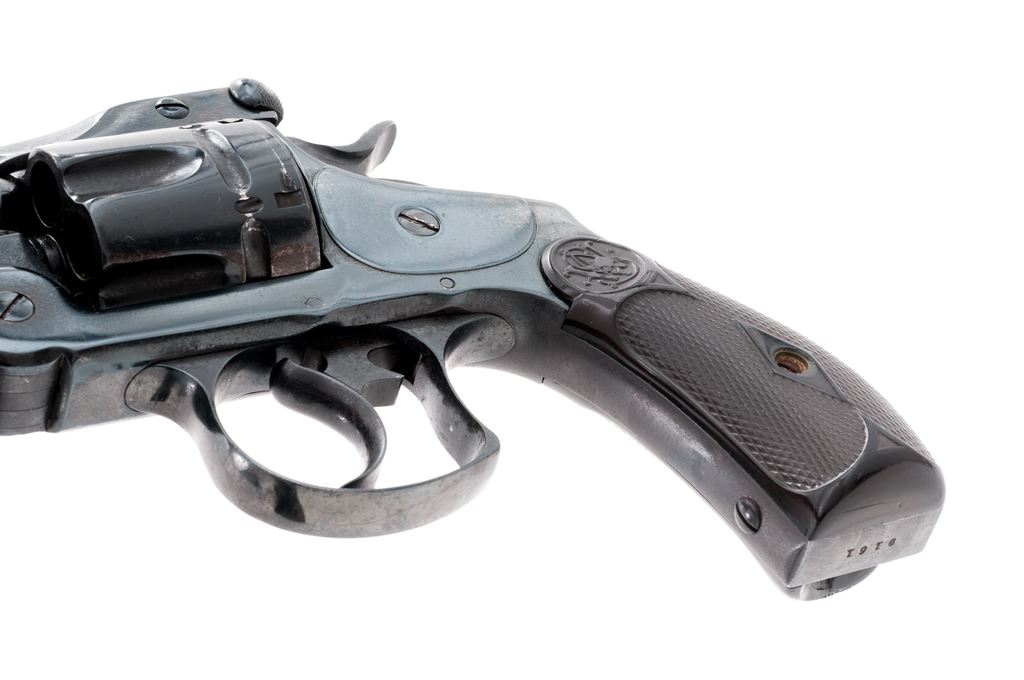 Smith & Wesson 44 Double Action First Model Cartridge Revolver, #9161, .44 S&W Russian CF cal., 5'' round barrel with full-length top rib marked in two lines ''Smith & Wesson Springfield, Mass. U.S.A.'' over 1865 through 1880 patent dates, scarce late-production 1-9/16'' length cylinder, S&W logo on right frame above juncture with grips, full blued finish, two-piece checkered black hard rubber grips having the circular S&W logo at top. Likely of early 20th century assembly, but considered antique as all frames were mfg'd 1898 or before. Condition is good as refinished over light pitting in places, retaining virtually all the blue with legible but softened markings as expected. Grips are very good, having sharp checkering and logo but with a piece missing from bottom of right grip. Action is smooth and sure; bore is shiny with sharp rifling. Est.: $650-$950. (Antique)