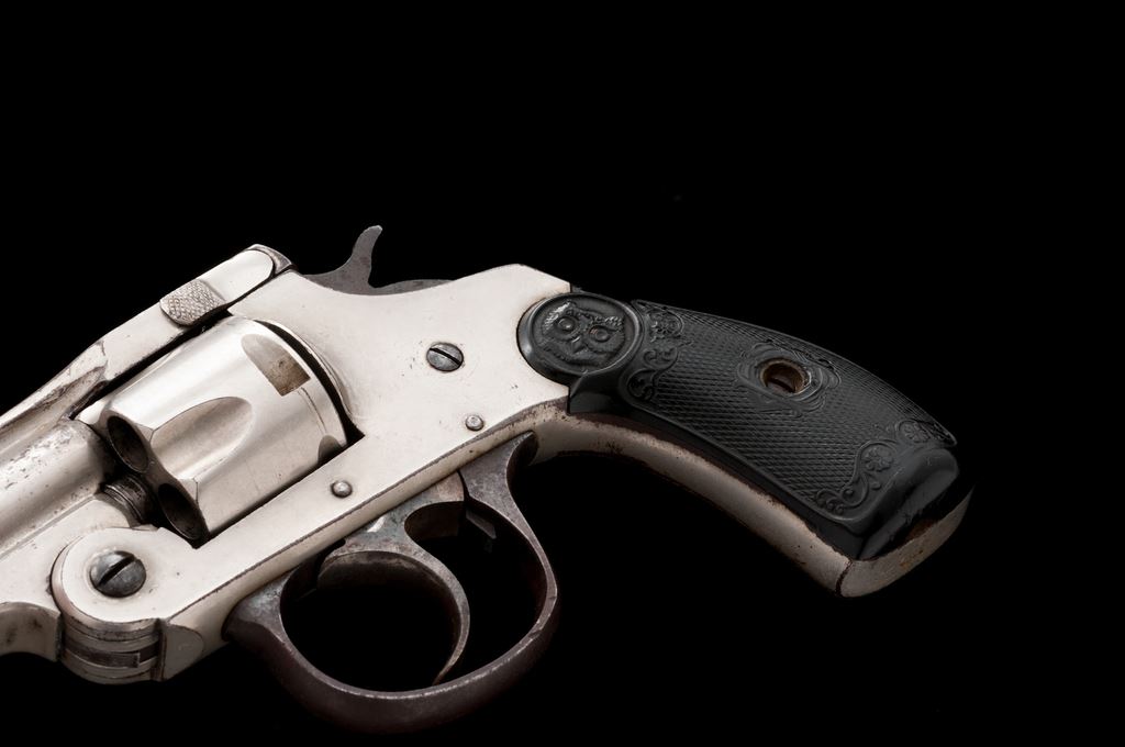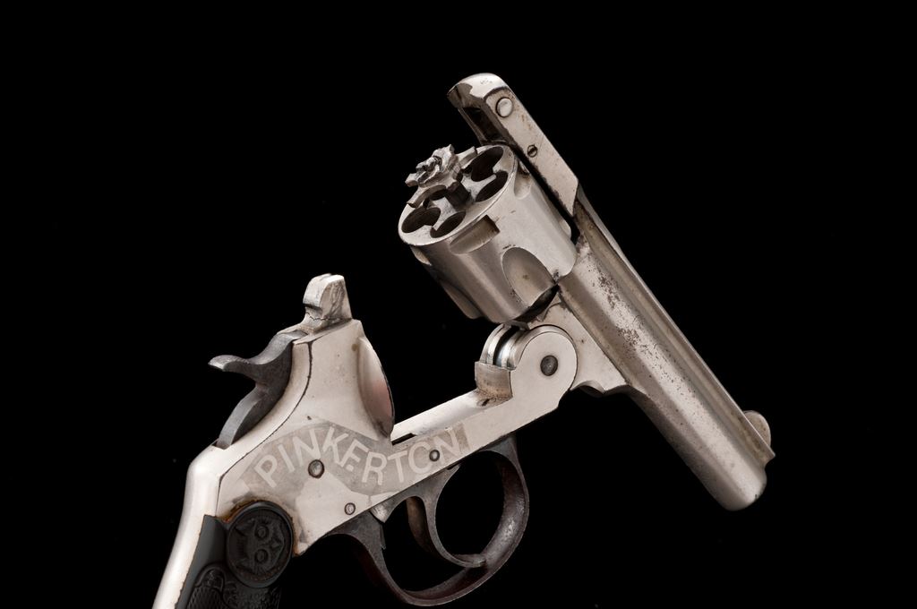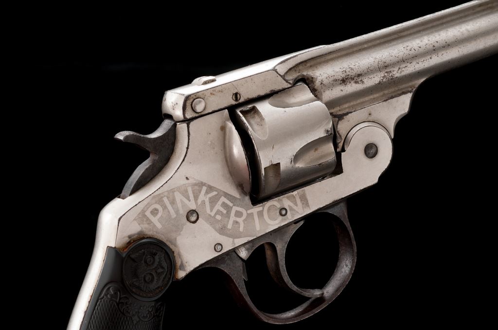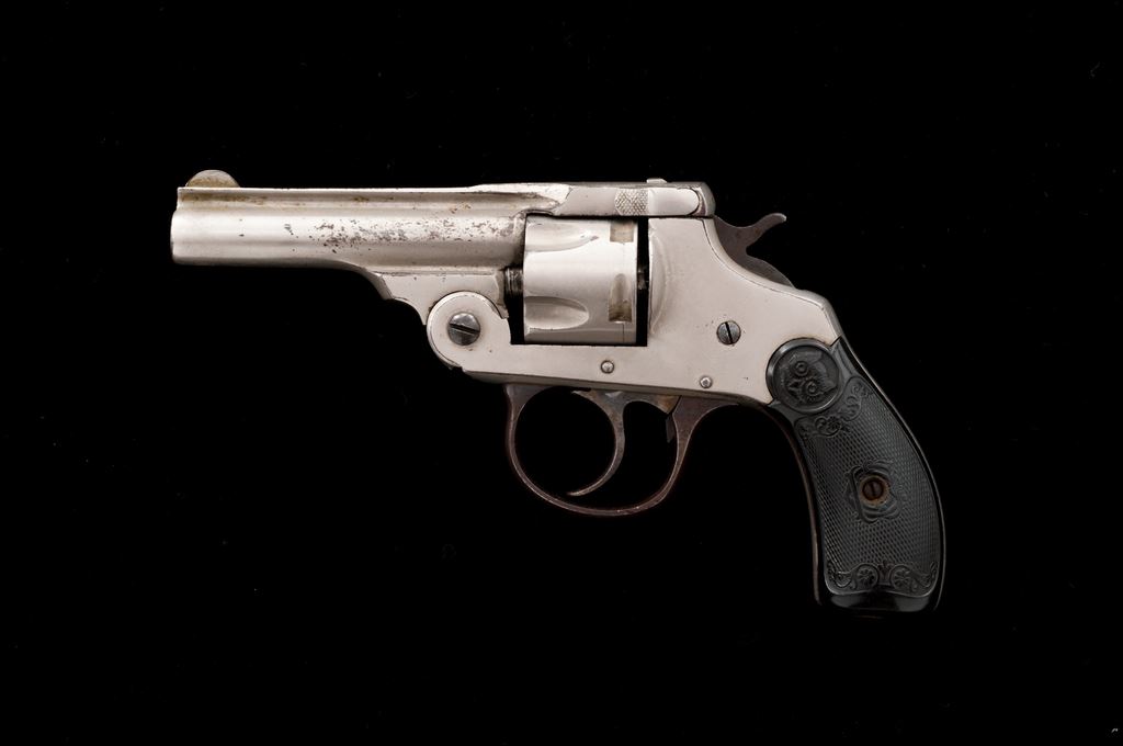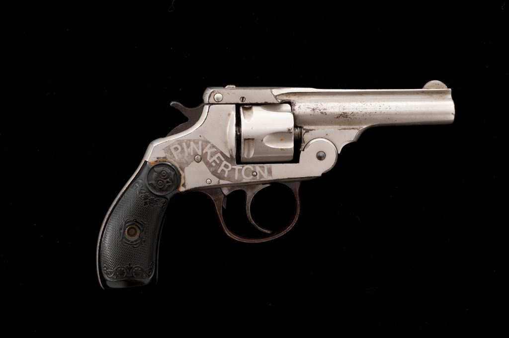 Iver Johnson ''Pinkerton'' Double Action Cartridge Revolver, with associated beaded leather holster, NVSN, .32 RF cal., 3'' round hinged top-break barrel with full-length rib marked ''Iver Johnson's Arms & Cycle Works, Fitchburg, Mass. U.S.A. / Patd. Apr. 6 66, Feb. 15 67, May 10 87, Dec. 26 93, Pat's Pending'' in two lines, fluted 5-shot cylinder, fancy checkered hard rubber two-piece grips having the Iver Johnson ''Owl's Head'' logo in a circular cartouche at top. ''Pinkerton'' is etched in large block letters within a flowing riband on right side of frame. Originally finished in full nickel plating, with a blued triggerguard and case hardened hammer and trigger. Condition is very good+, retaining approx. 80%-85% original nickel, the losses mainly confined to left side of the barrel; triggerguard has turned to brown with traces of blue and some case colors showing. Grips are very good with mostly sharp checkering and decorative motifs. Action is smooth and tight; bore appears clean. Holster is very good and complete, with sound beading decoration. Est.: $500-$750. (Antique)