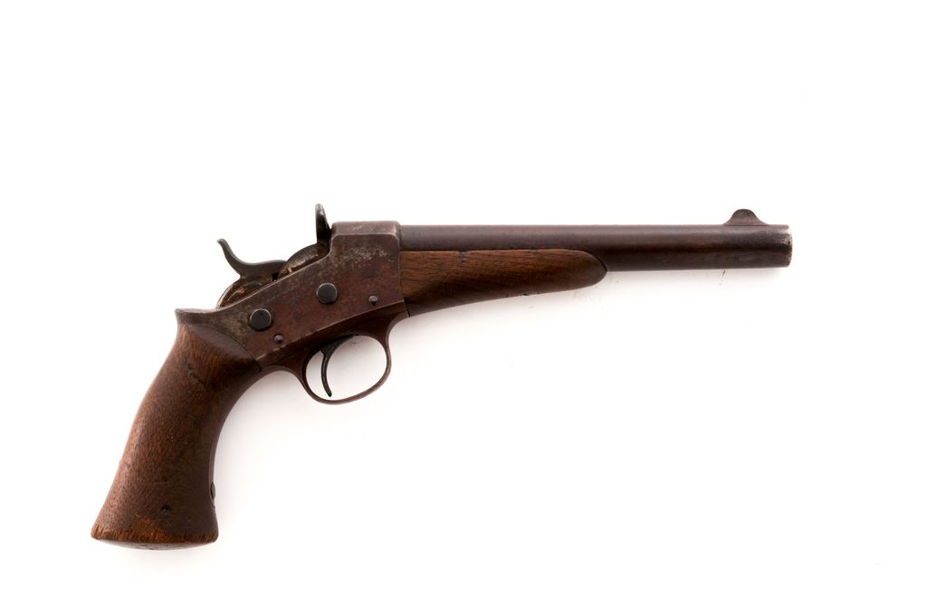 Remington Model 1871 Army Rolling Block Single Shot Cartridge Pistol, NVSN, .50 CF cal., 8'' unmarked round barrel, left frame with two-line ''Remington's Ilion N.Y. U.S.A. / Pat. May 3d Nov. 15th 1864 April 17th 1866'' marking; a ''P'' and ''S'' appear above the front frame screw; with one-piece oil-finished walnut grips. Originally blued barrel with case hardened frame and triggerguard, ''bright'' hammer and breechblock. Condition is good to very good showing no original finish, with a dark untouched and uncleaned ''attic'' patina having light rust in places that should clean. Wood is solid showing a few blemishes of martial use, and a vestigial rectangular military inspector's cartouche to left grip. Action is crisp; bore is dark with traces of rifling. Est.: $450-$750. (Antique)