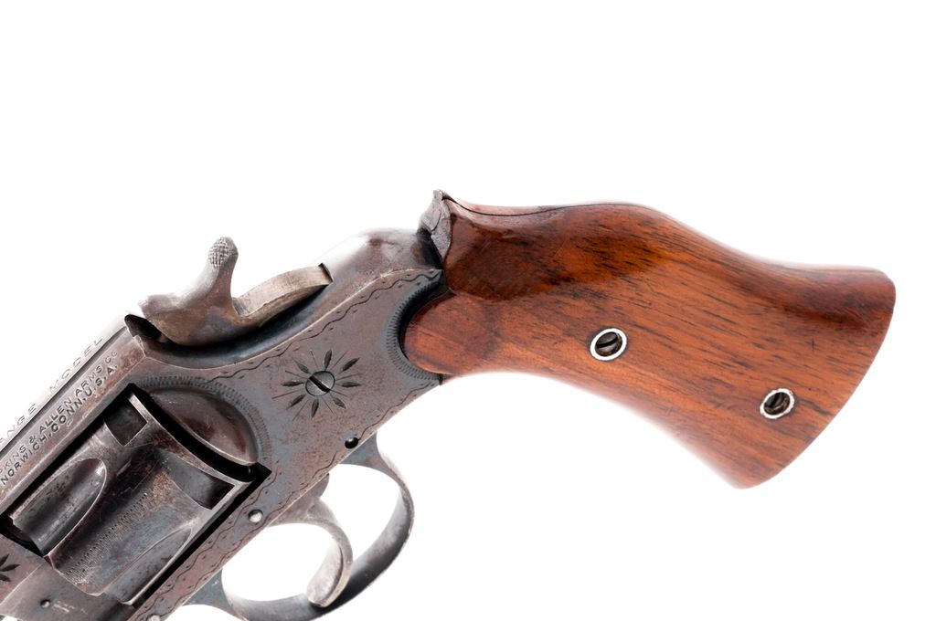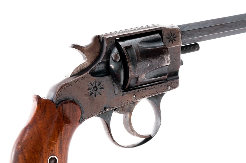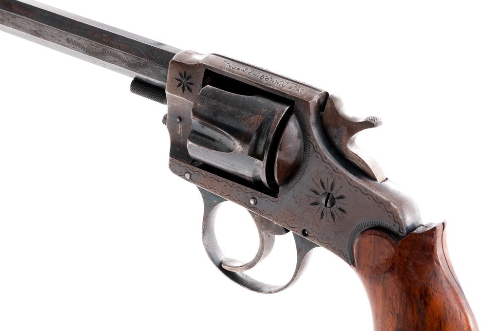Hopkins and Allen Punch-Dot Engraved Range Model Double Action Revolver, #6313, .32 S&W cal., 6'' octagonal barrel, blue finish, long Beakart type grips. Condition is very good retaining approx. 85% blue with nice sunburst and border motifs. Smooth grips are excellent with only light impressions, no losses. Good action, fine bore. Est.: $200-$300. (C&R/PPT)