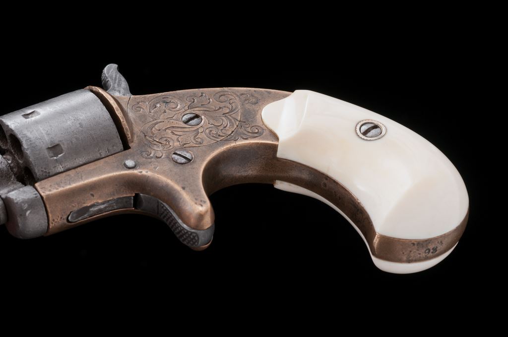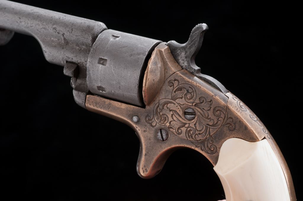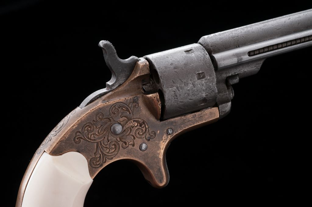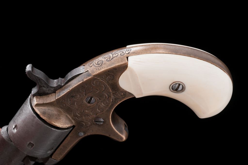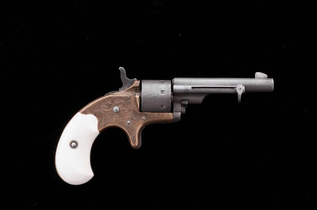 Colt Open-Top Spurtrigger Cartridge Pocket Revolver, #93, .22 RF cal., desirable early 2-7/8'' round barrel with ejector marked ''+Colt's Pt. F.A. Mfg. Co. / Hartford, CT. U.S.A.+'' on top in two lines, 7-shot plain round cylinder, with two-piece ivory grips. Mfg'd 1871-1877. Brass (or bronze) frame with scrolling floral engraving. Condition is very good retaining no original finish, the steel parts apparently having been chemically cleaned and showing light nicks and pitting; frame with sharp engraving. Ivory grips are near perfect, showing lovely color and fit well. Action is crisp and tight but does not revolve cylinder; bore appears clean with faint rifling. This gun is the rare, early variation having a tapered firing pin that enters the frame through a circular hole (rather than a narrow slot). Est.: $450-$650. (Antique)