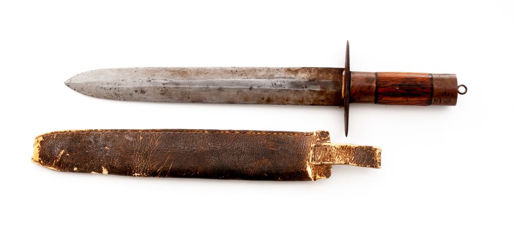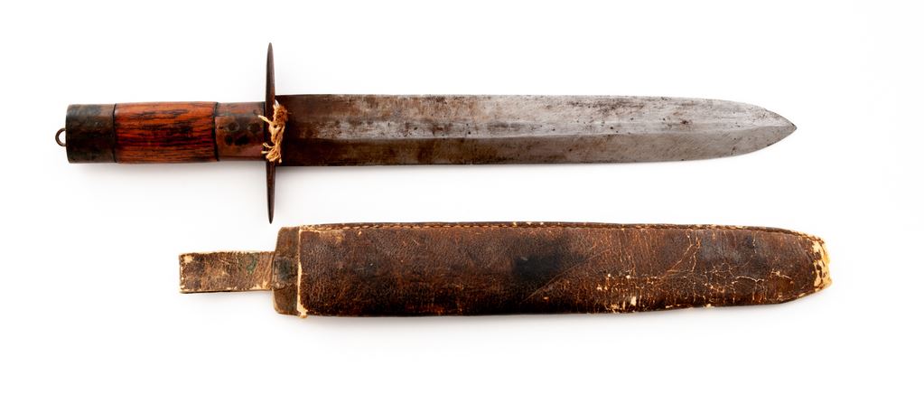 Home-Forged Double-Edged Frontier Knife, 12.75'' blade, 18'' overall, with iron crossguard, brass and hickory grips, in buffalo leather scabbard. Blade crudely stamped ''Danial Boon. 1796''. Condition is good, with carbon spotting to blade and minor split to wood portion of grip from shrinkage. Scabbard with wear at both ends. Est.: $150-$250.