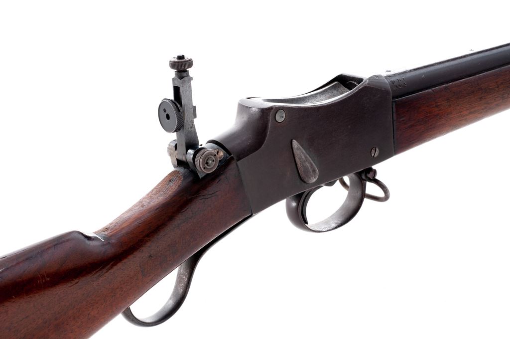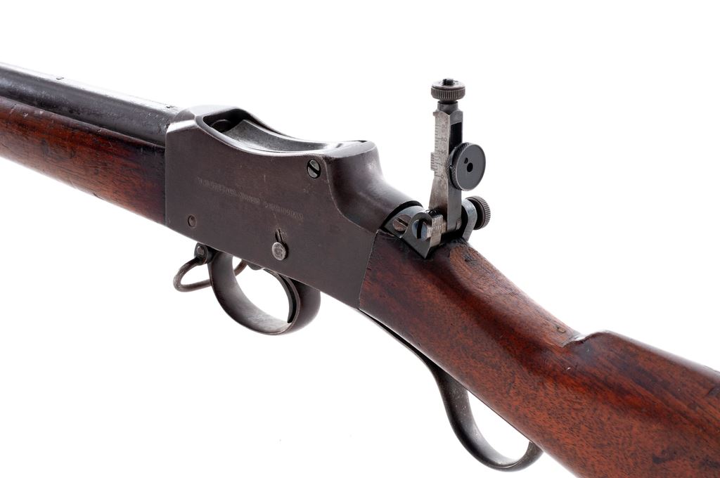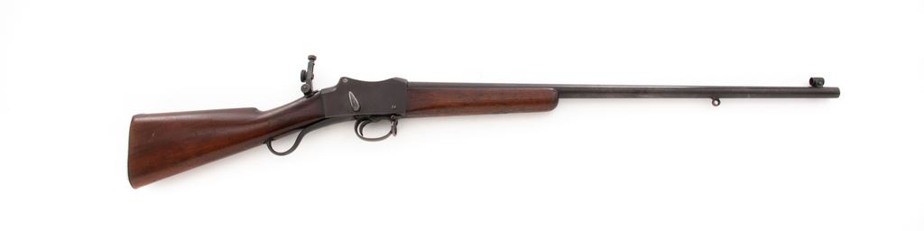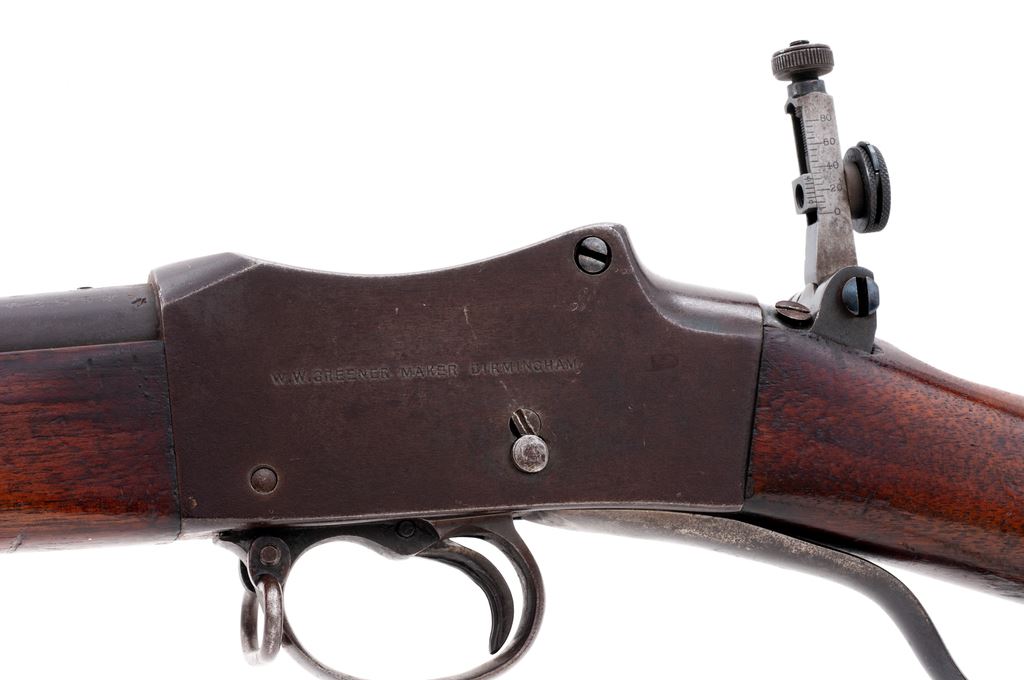 Martini Action Single Shot Rifle, by Greener, #025546, .22 LR cal., 26'' sleeved barrel, blue finish, walnut stock and forend, aluminum buttplate, with globe front and adjustable tang rear sight. Condition is very good retaining approx. 75% thinning and toning blue. Stock with some handling marks, and clearance cut to top of pistol grip area to clear tang sight. Good action, very good bore. Est.: $250-$450. (C&R)