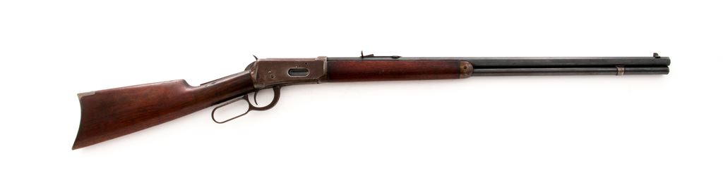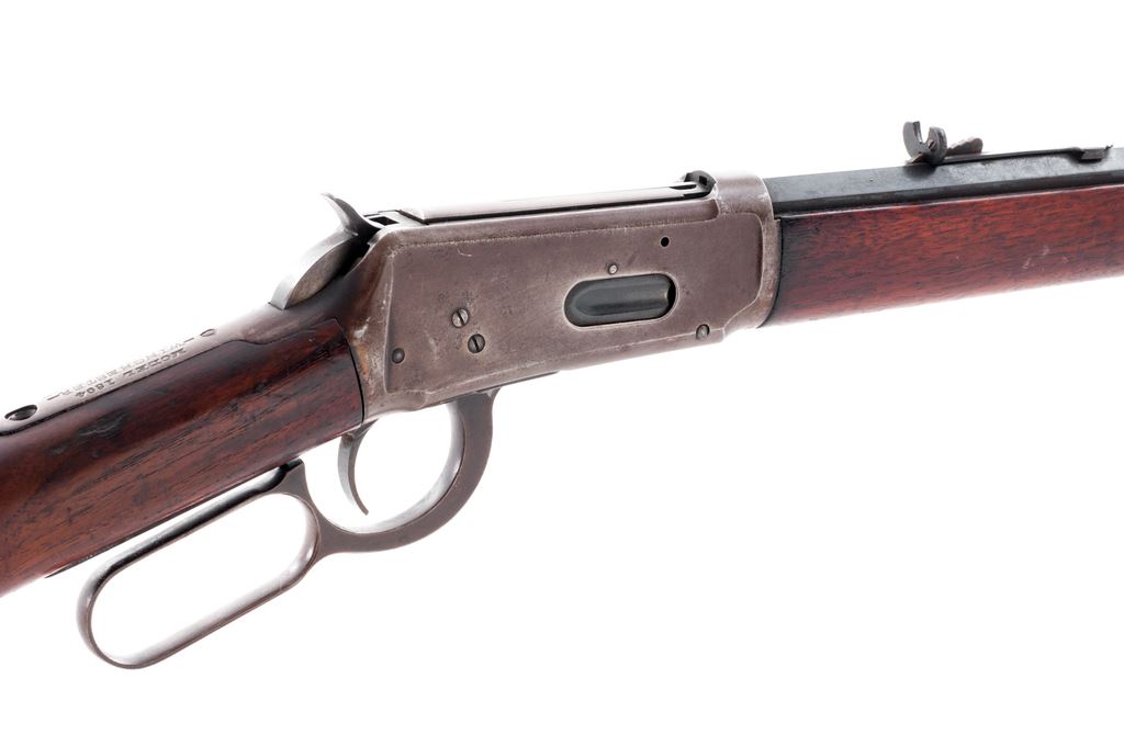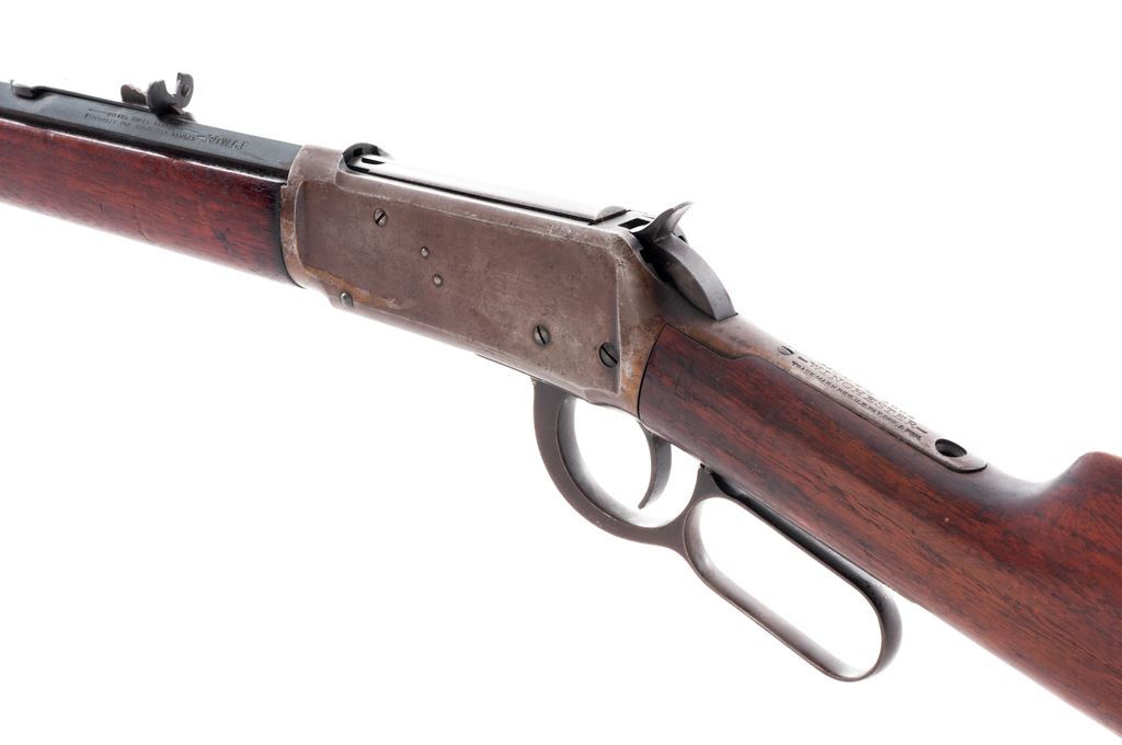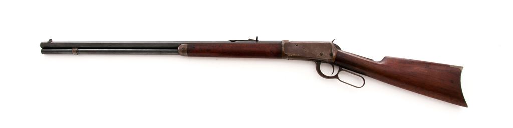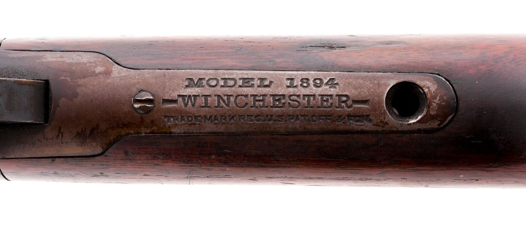 Winchester Model 1894 Lever Action Rifle, #816141, .30 WCF cal., 26'' nickel steel octagon barrel, blue finish, straight grip walnut stock, crescent steel buttplate, dovetailed blade front sight, with semi-buckhorn rear sight. Barrel with two-line ''August 21, 1894'' patent date address and is additionally marked on the left barrel flat ''NICKEL STEEL BARREL / ESPECIALLY FOR SMOKELESS POWDER'' - ''30 W.C.F.'' Top of barrel and receiver are Winchester proofed. Mfg'd 1917. Condition is good overall. Barrel and magazine tube with approx. 94% toning blue finish which appears original; also with scattered light surface freckling; protected areas with small spots of built-up dust and debris from prolonged storage and would improve with a thorough cleaning; barrel address is clear. Magazine tube band dovetail is a little loose. Receiver, buttplate, etc. are mostly silvery gray in appearance with some cloudy reddish brown darkening. Lever is also dark. Buttstock and forend fit nicely at the adjoining metal surfaces, but one of upper tang stock screws is missing; overall the wood shows age and wear consistent with the rest of the rifle, including scattered scratches and impressions and an older coat of added finish; some of the added finish bled onto the metal when it was applied and would improve with a good cleaning. Action is crisp with a smooth hammer and trigger. Bore rates good as very lightly frosted. Est.: $600-$800. (C&R)