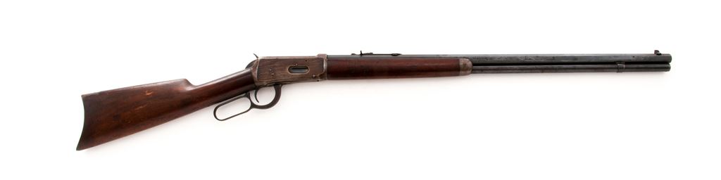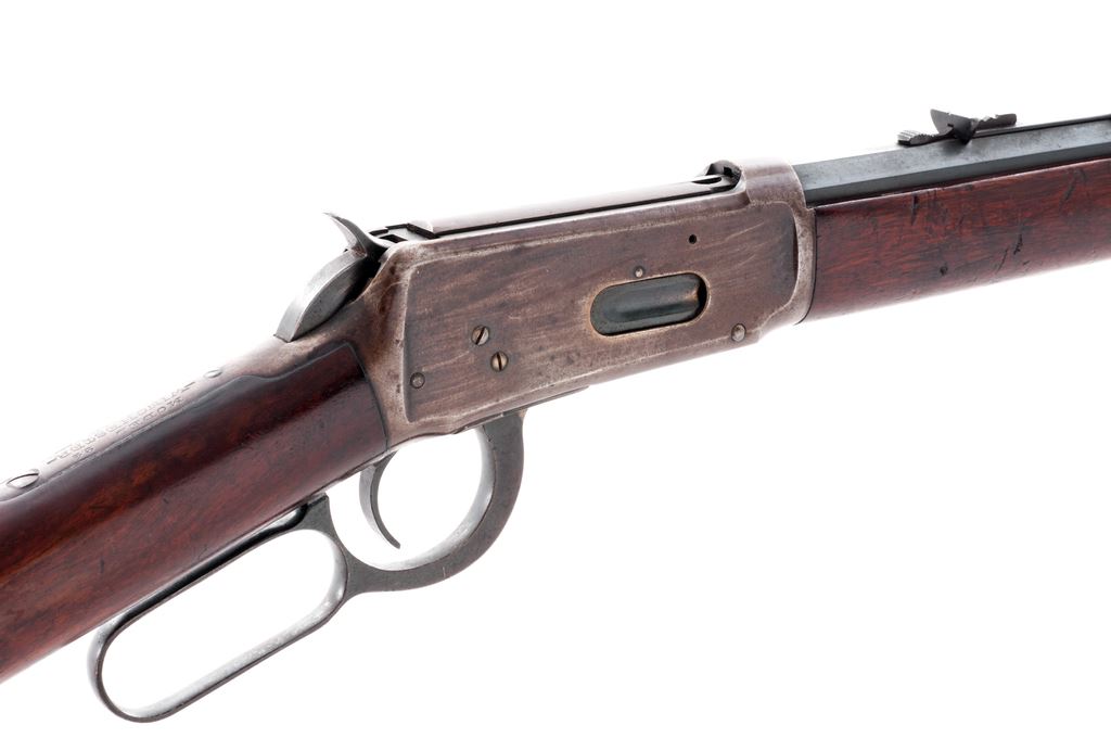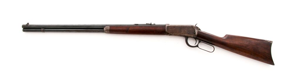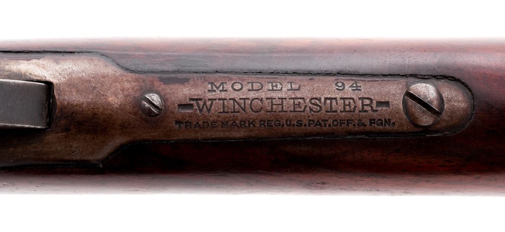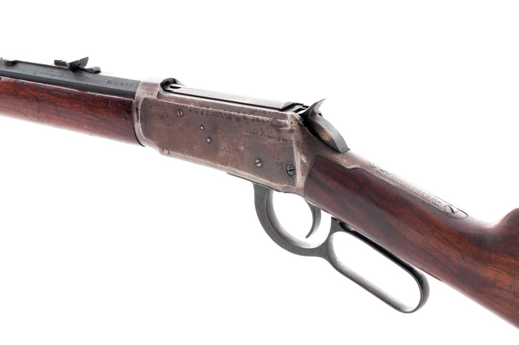 Winchester Model 1894 Lever Action Rifle, #904300, .25-35 cal., 26'' nickel steel octagon barrel, blue finish, straight grip walnut stock, crescent steel buttplate, dovetailed blade front sight, with flat-top sporting rear sight. Barrel with two-line ''August 21, 1894'' patent date address and is additionally marked on the left barrel flat ''NICKEL STEEL BARREL / ESPECIALLY FOR SMOKELESS POWDER'' - ''25-35 W.C.F.'' Top of barrel and receiver are Winchester proofed. Mfg'd 1921. Condition is good overall. Barrel and magazine tube with approx. 85%-90% original blue finish and scattered surface freckling and some spots of very fine pitting; protected areas with built-up dust and grime from prolonged storage and would improve with a thorough cleaning; barrel address is clear. Receiver, buttplate, etc. are silvery gray metal with darker brown patina. Buttstock and forend fit nicely at the adjoining metal surfaces; overall the wood shows age and wear consistent with the rest of the rifle, including scattered scratches and impressions and an older coat of added finish. Action is crisp. Bore rates as near excellent and looks good for its age. Est.: $600-$900. (C&R)