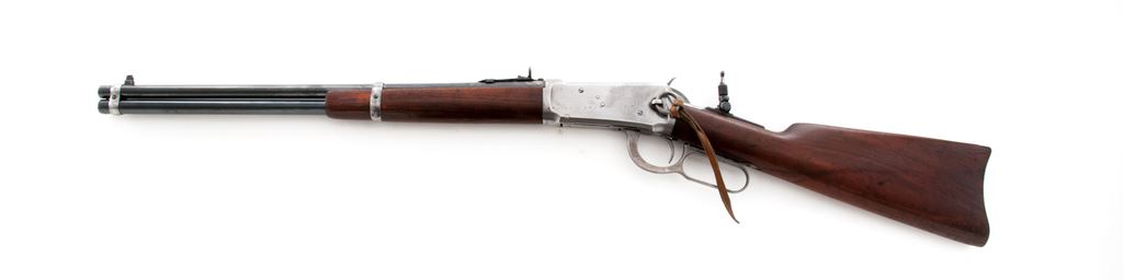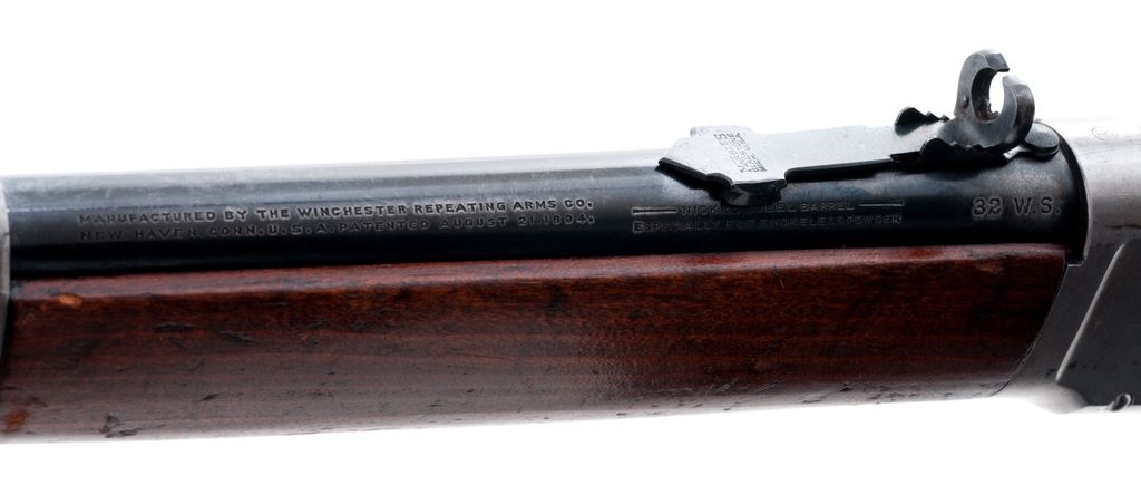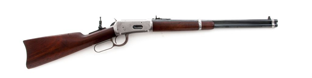 Pre-War Winchester Model 1894 Saddle Ring Carbine, #517020, .32 WS cal., 20'' barrel, blue finish, gumwood stock and forend, high brass bead Marbles front sight, Marbles rear full buckhorn sight and Lyman tang sight. Mfg'd 1911. Condition is about fine. Barrel and mag tube retain approx. 90% blue; frame and barrel bands with little blue. Mild impressions to stock. Good action, fair bore. Est.: $500-$750. (C&R)