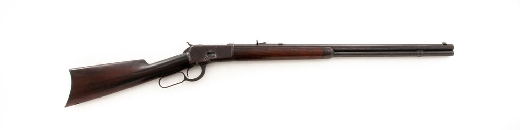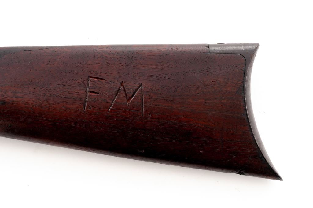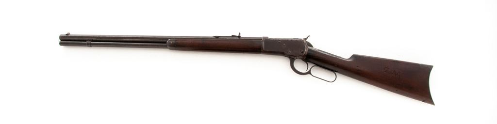 Antique Winchester Model 1892 Lever Action Rifle, #29922, .38-40 cal., 24'' octagonal barrel, blue finish, smooth walnut stock and forend, with standard sights. Mfg'd 1893. Condition is very good retaining approx. 65%-70% toning factory blue. Stock has darkened considerably with small dings and bruises. Cheekpiece area with the initials ''FM'' added. Good action, very good bore. Est.: $600-$800. (Antique)