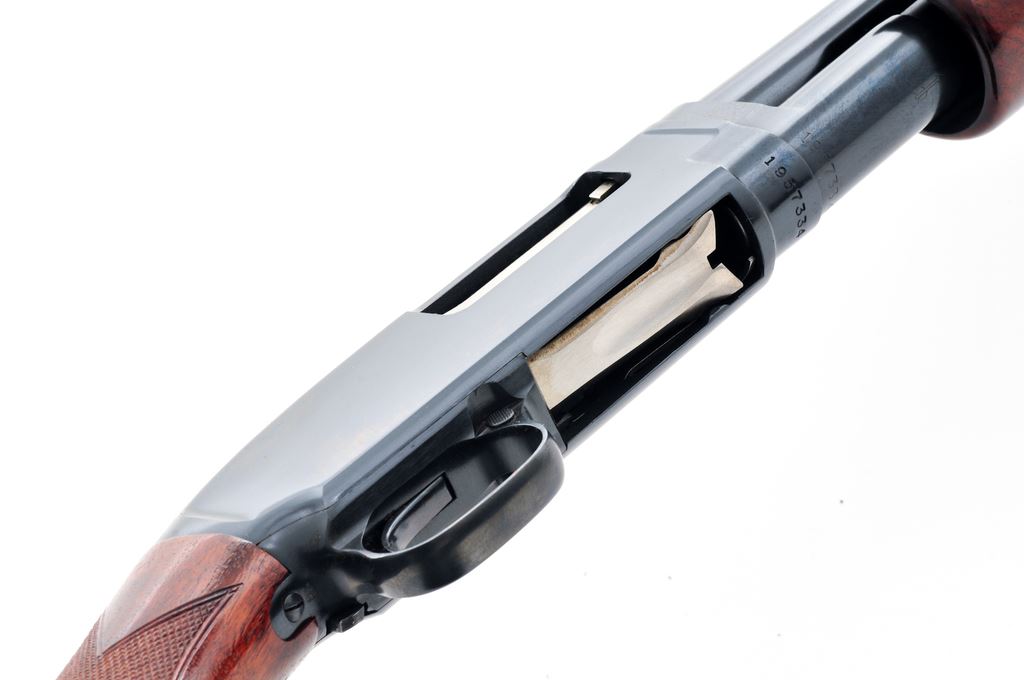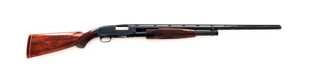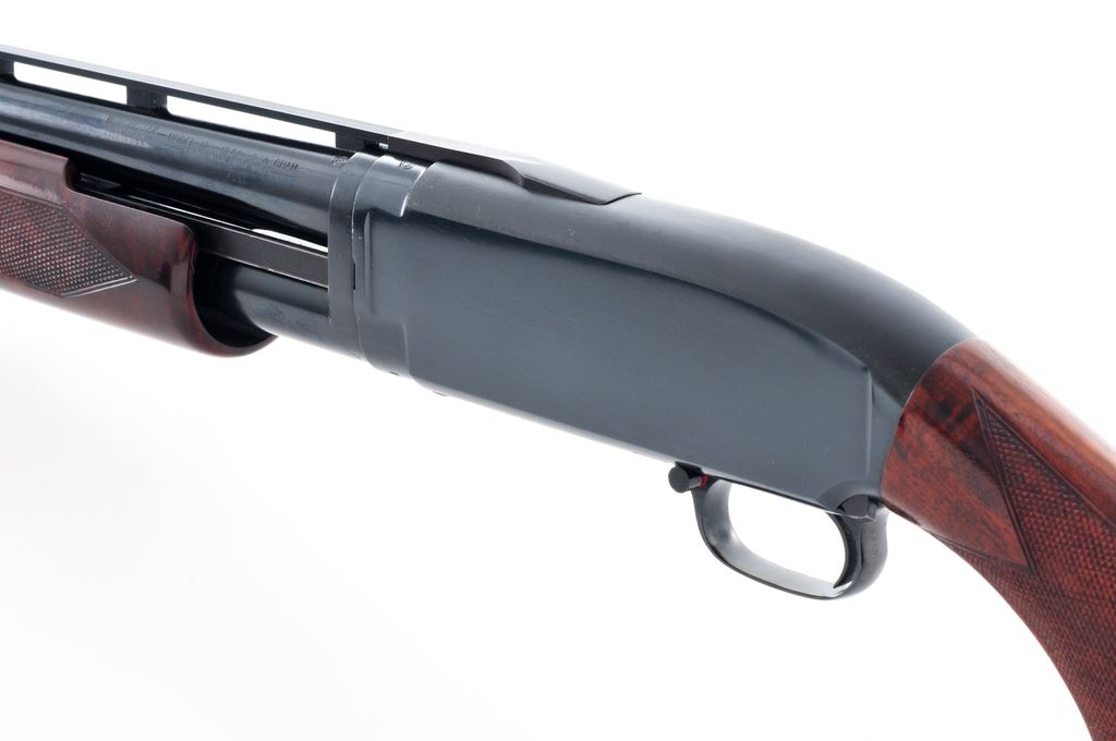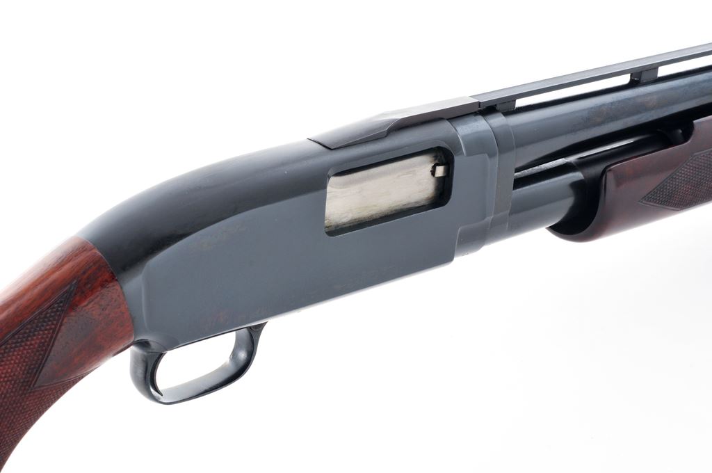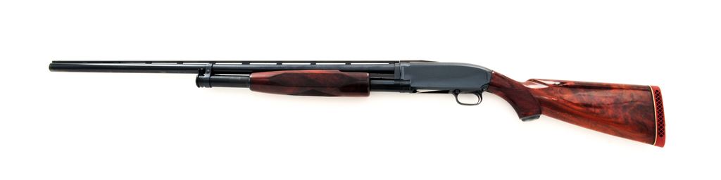 Very Late Winchester Model 12 Standard Grade Slide-Action Trap Gun, #1957334. 12 ga. 30'' barrel has a 2-3/4'' chamber, target beads, Full choke, and is fitted with the late ''New'' Winchester ventilated rib, with rectangular posts and ''duck bill'' extension onto the receiver. Appears to be a ''Deluxe Field'' version, with fancy walnut, full forend, extensive checkering, metal grip cap and Red Winchester Whiteline recoil pad. Stock dimensions are 14.5''x1.5''x2''. Mfg'd 1963. Condition is near excellent, with numerous handling marks to wood but little wear to receiver, which is possibly reblued. Action functions correctly and lock up tight, bore is bright, stock needs tightening. A nice original Model 12 Trap. Est.: $450-$750. (C&R)