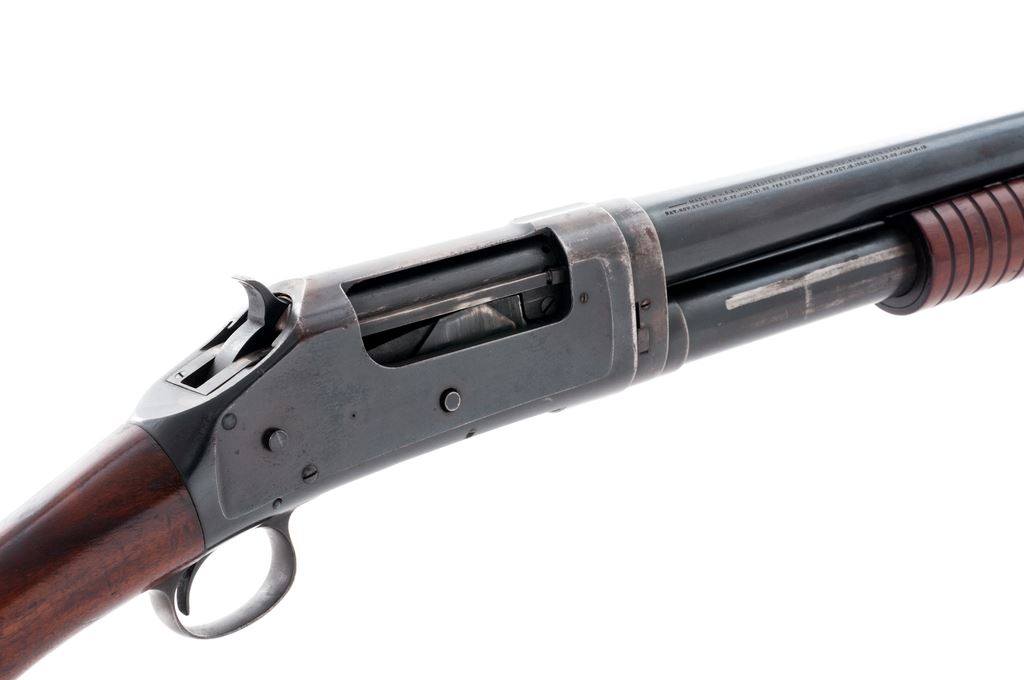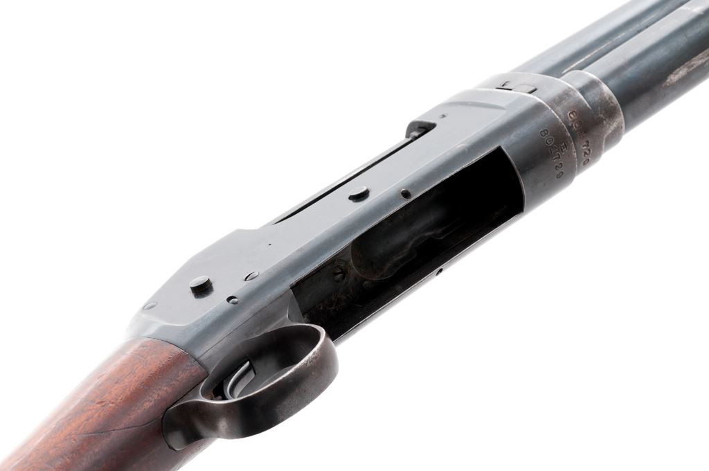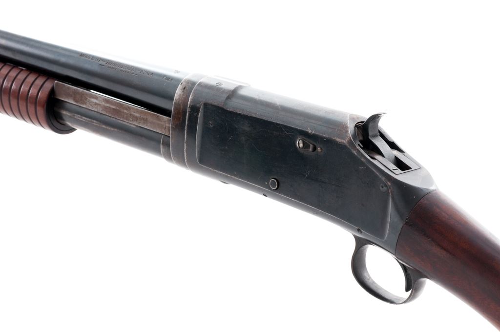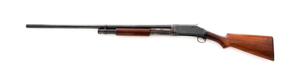 Winchester Model 97 Standard Grade Takedown Slide-Action Shotgun, #801729. 12 ga. 32'' plain barrel choked Full, chamber length not marked. Forend is early 18-groove ''tootsie roll'' variation; pistol-grip buttstock is uncheckered with no grip cap and pre-1959 Winchester plastic buttplate. Receiver is standard, with improvements through ''E'' modifications. Mfg'd 1929. Condition is very good, with all original parts functioning correctly. Numerous handling marks to wood, much wear to bluing from carry/use. Action is sluggish and would benefit from a good cleaning; bore is very good. Chamber length should be checked before firing. Est.: $250-$350. (C&R)