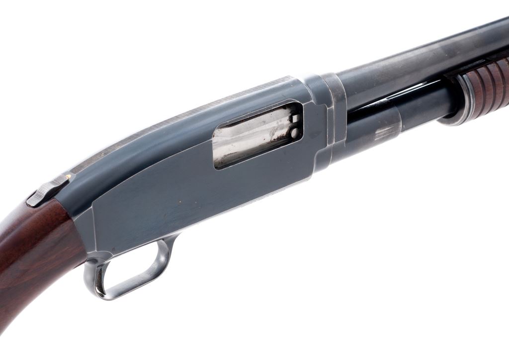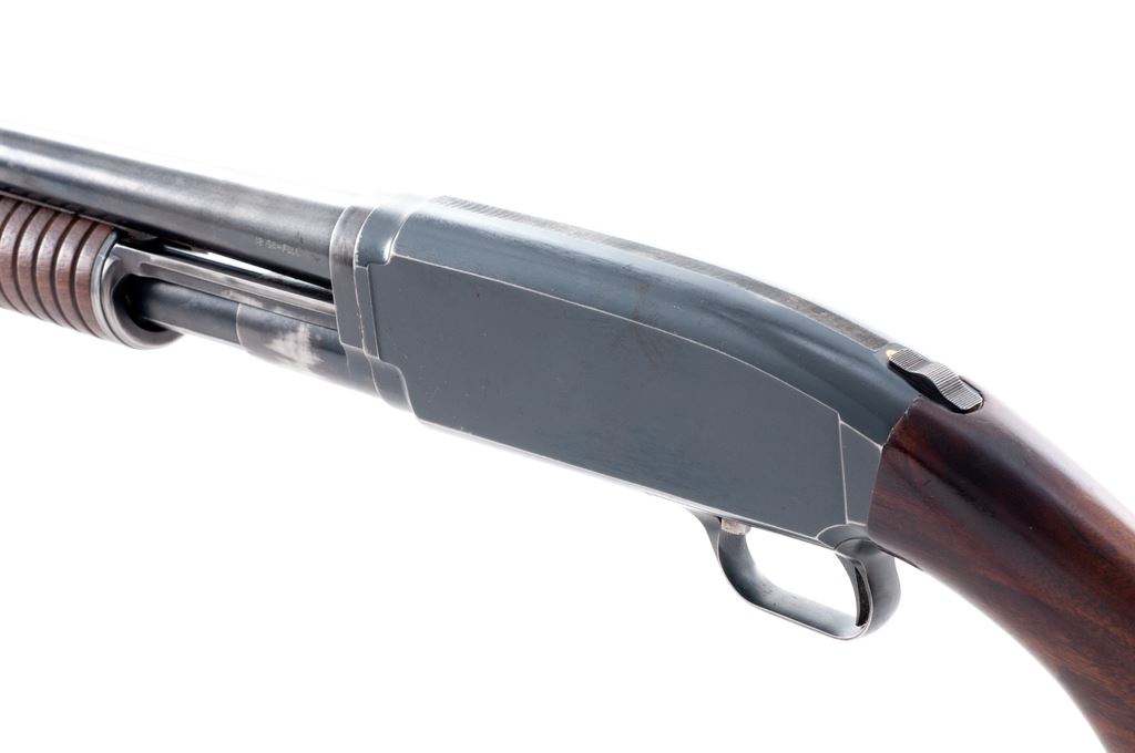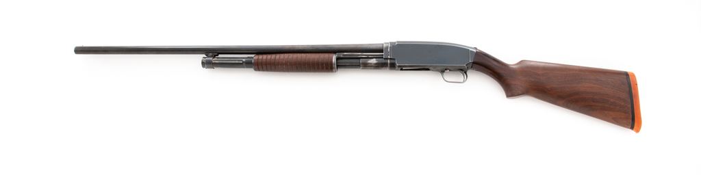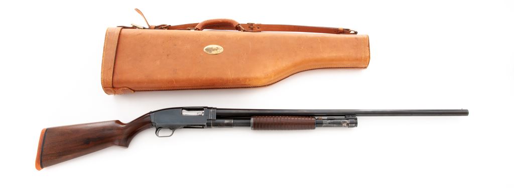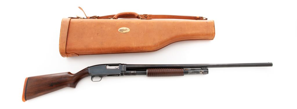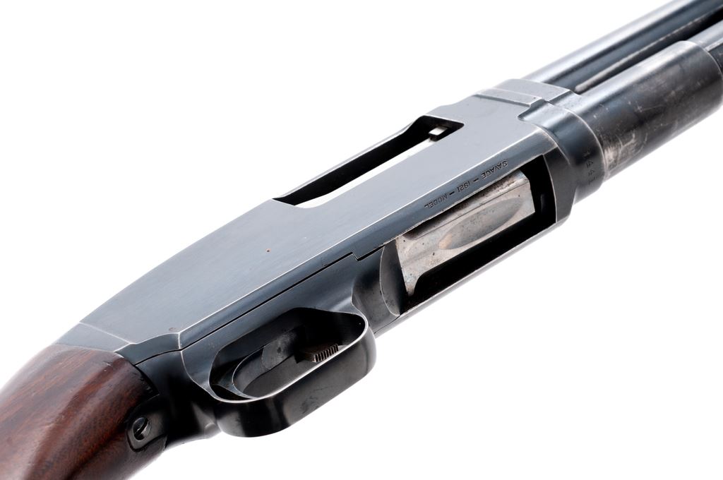 Savage Model 1921 ('21) Field Grade Slide-Action Shotgun, #1441. 12 ga. 30'' plain barrel is choked Full. Ribbed circular forend and pistol-grip buttstock are standard walnut without grip cap or checkering but with solid red butt pad. Housed in leather leg-o-mutton takedown case. Mfg'd 1920s. Condition is good retaining approx. 85% thinning blue with expected wear to wood and metal. Piece of metal braised just in front of forend. Action appears to function correctly but could use a thorough cleaning; bore is without damage. Butt pad needs replacement. An uncommon Savage Model. Est.: $200-$400. (C&R)