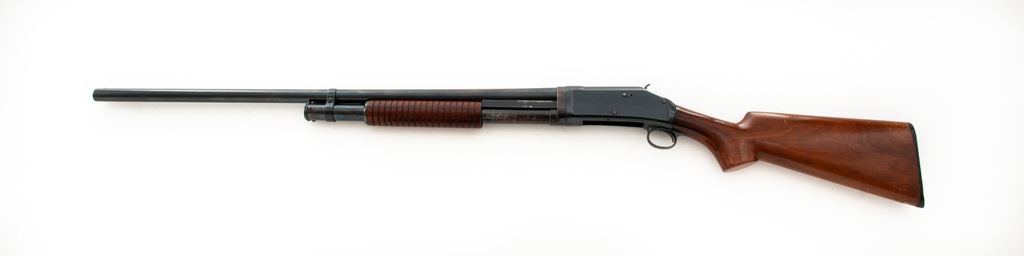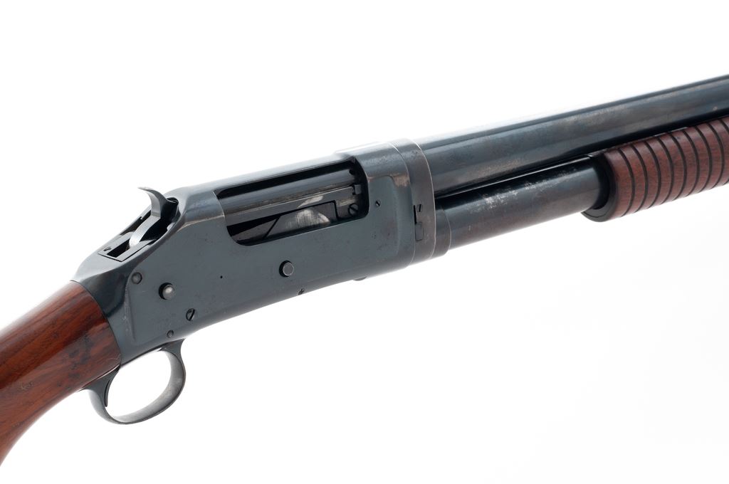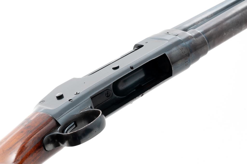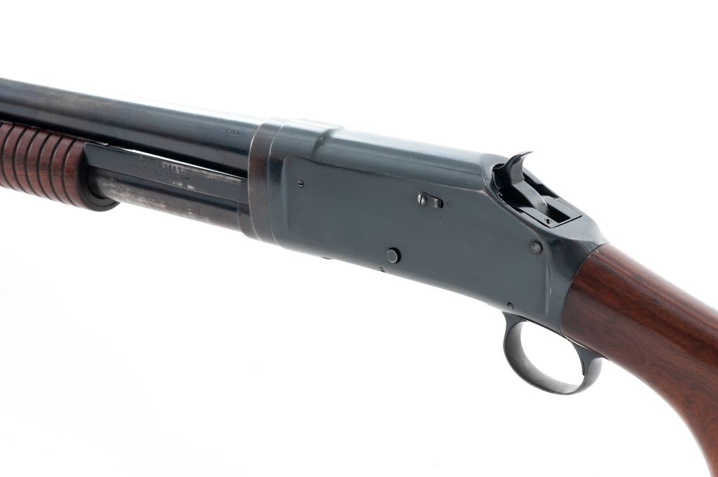 Winchester Model 1897 Takedown Pump Action Shotgun, #537210, 12 ga., 30'' round barrel choked Full, blue finish, walnut stock and forend. Mfg'd 1914. Condition is near excellent retaining approx. 90% original factory blue, with most of the losses in actioning areas of bar slide and mag tube, as well as bolt and lifter. Stock has not been sanded, shows mild impressions, and an additional coat of finish. Action is crisp, bore is mirror bright. Est.: $500-$750. (C&)