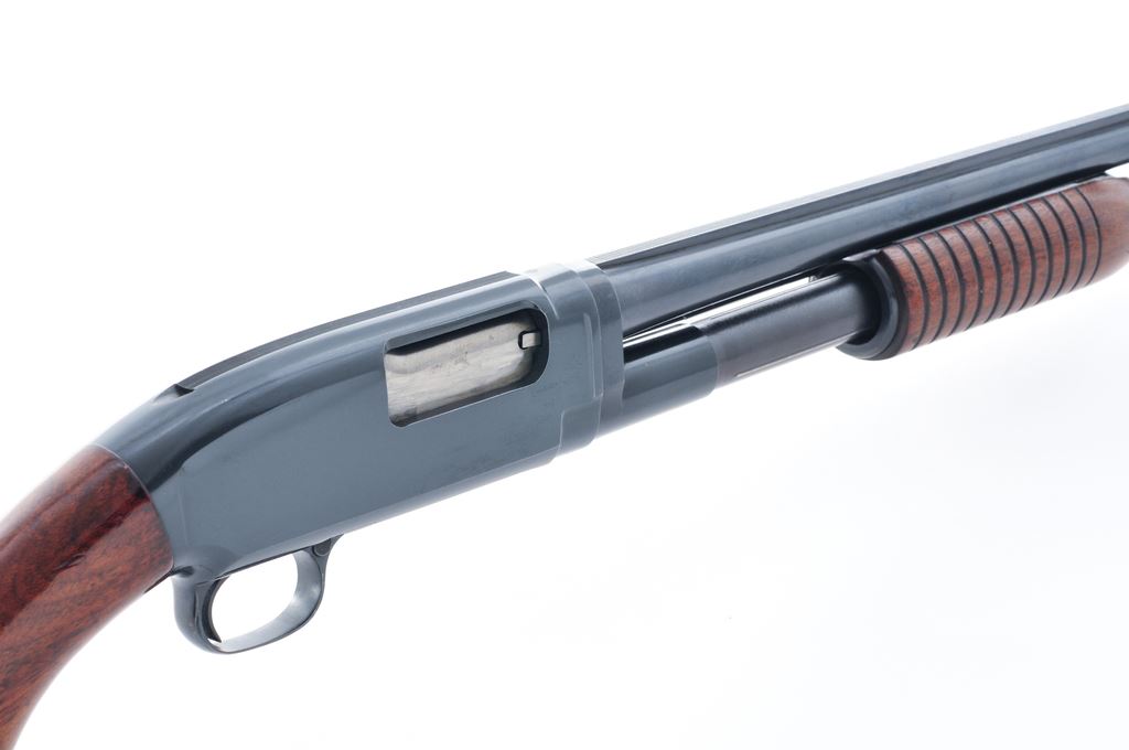 Early 1950's Winchester Model 12 Pump Action Shotgun, #1259969, 20 ga., 2-3/4'' chamber, 28'' solid rib barrel choked Full, pistol-grip walnut stock and 11-groove forend, brown rubber Pachmayr recoil pad, with white bead front sight. LOP is 14-1/16''. Barrel and receiver are both Winchester proofed. Mfg'd 1951. Metal surfaces rate fine with approx. 96% original blue. Factory lettering is clear with a crisp barrel address. Wood is very good with general shallow impressions and small handling marks, most frequent on the forend and grip, but most of the finish remains. Excellent crisp action and bright bore. Est.: $400-$600. (C&R)