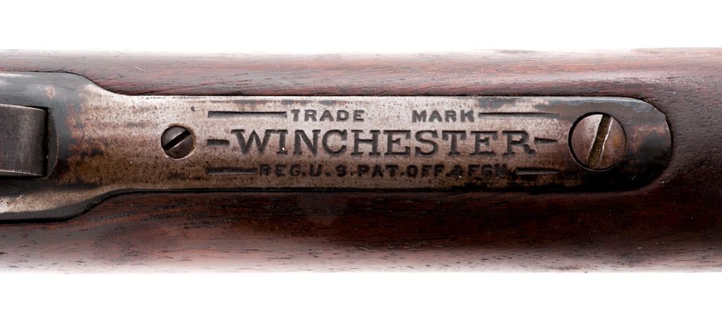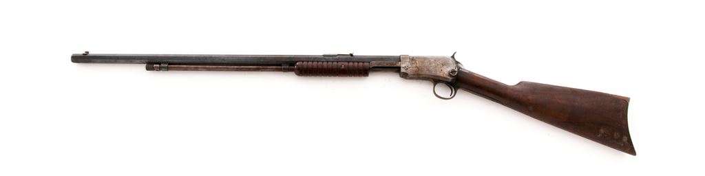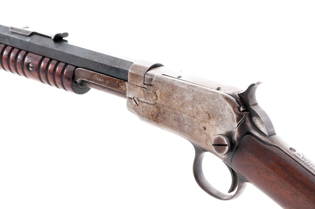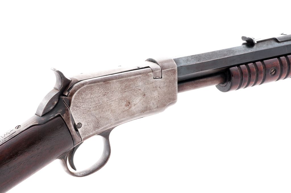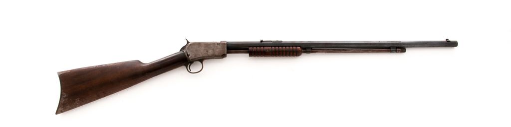 Winchester Model 1890 Third Model Pump Action Rifle, #682476, .22 LR cal., 24'' octagon barrel, straight grip walnut stock, 12-groove forend, crescent steel buttplate, dovetailed front sight, ''V''-notched rear sight with elevation screw. Top of barrel and receiver are both Winchester proofed. Mfg'd 1925. Condition is good. Barrel with a combination blue finish and dark patina with scattered tiny specks of darker freckling and surface rust; address is clear. Receiver is mostly silvery gray bare metal with reddish brown spotting. Buttplate is dark and lightly rusted. Stock shows age and wear consistent with the metal surfaces, with an added coat of finish that has dulled on the lower portion of the buttstock and also shows some moderate mildew staining. Very good action and bore. Est.: $250-$450. (C&R)