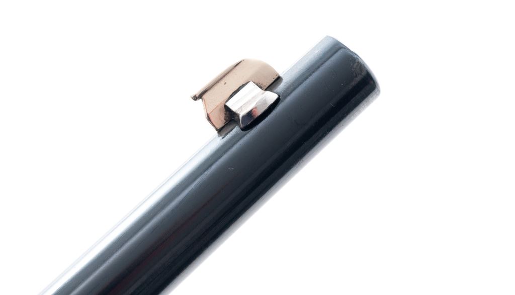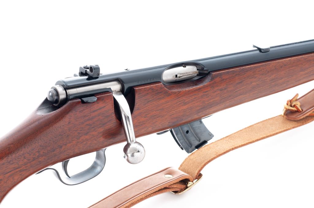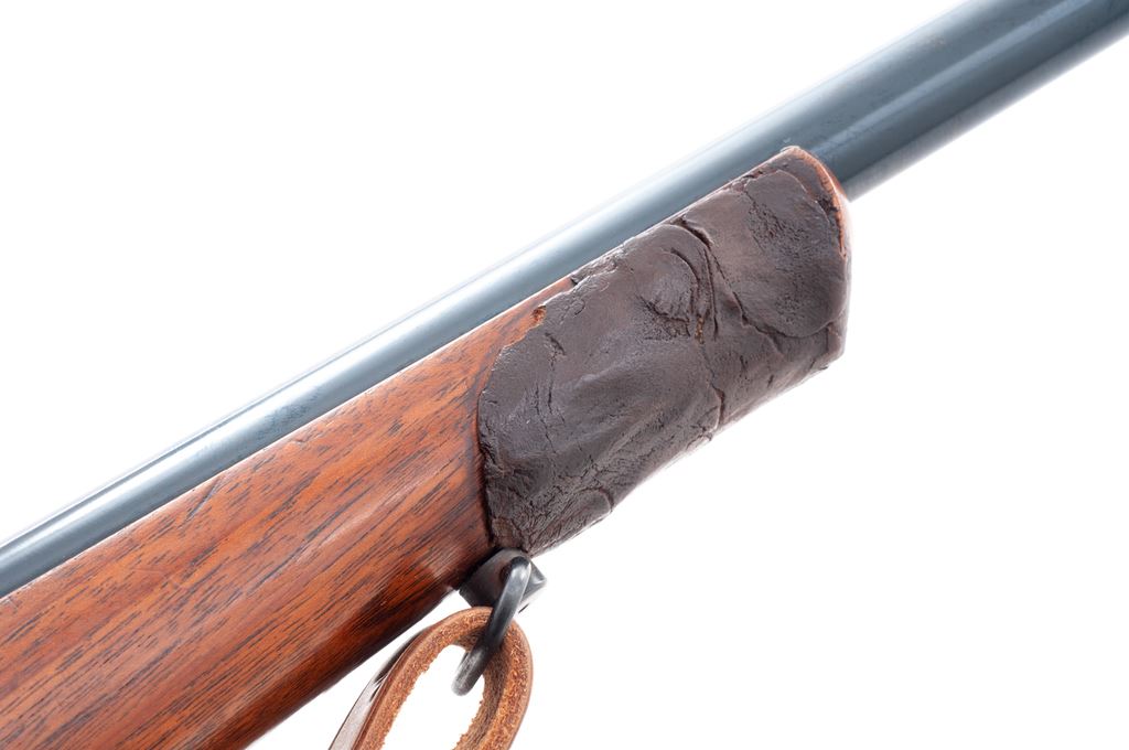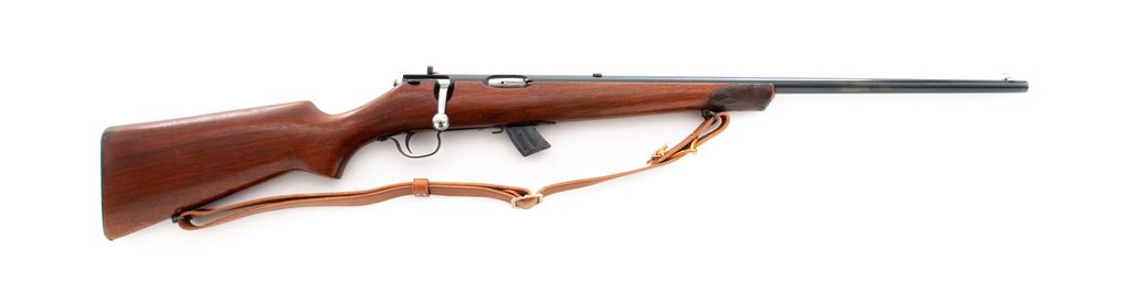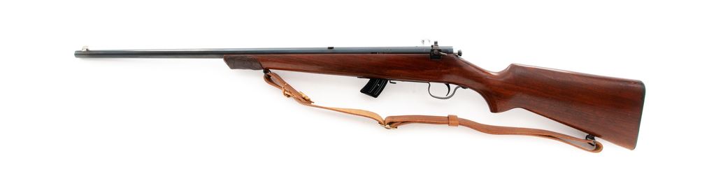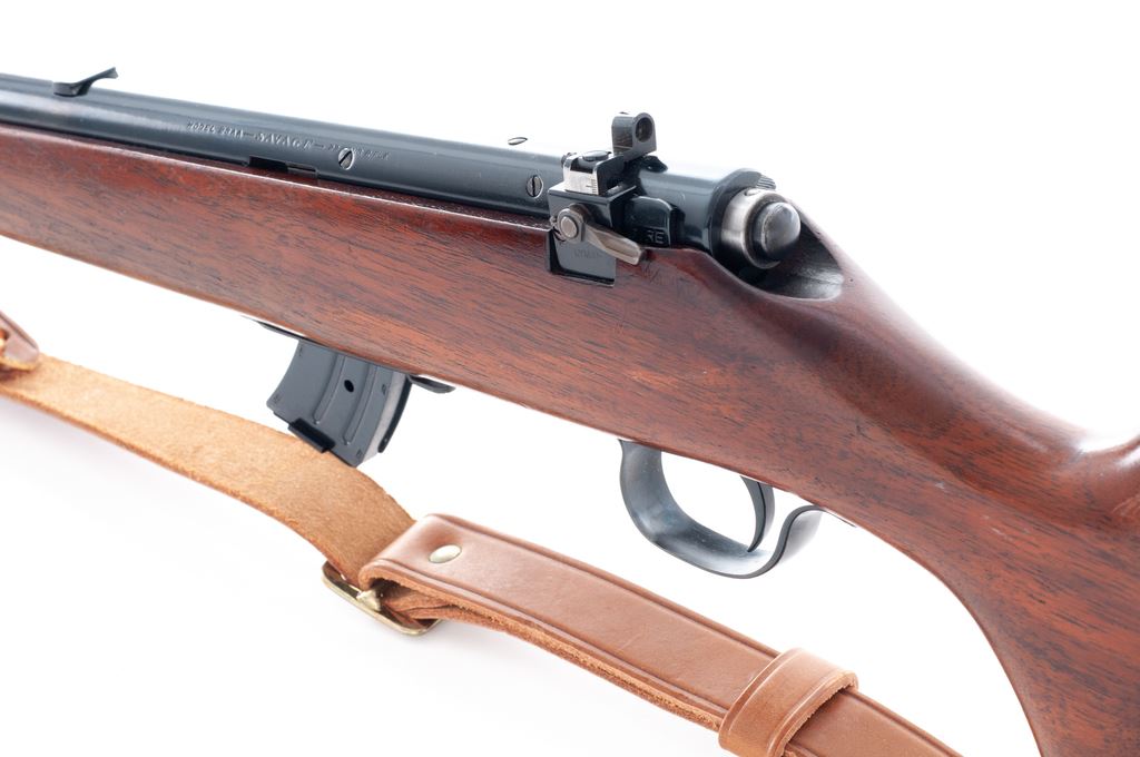 Savage Model 23AA Bolt Action Rifle, #130141, .22 LR cal., 23'' barrel, blue finish, walnut stock, Lyman peep sight and gold bead front sight, with leather sling and one 10-round Savage magazine. Condition is fine as refinished retaining approx. 96% immersion type blue. Stock with light overall scratches, and brown epoxy repair or modification to the end of stock. Good action and bore. Est.: $150-$300. (C&R)