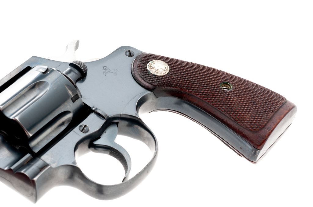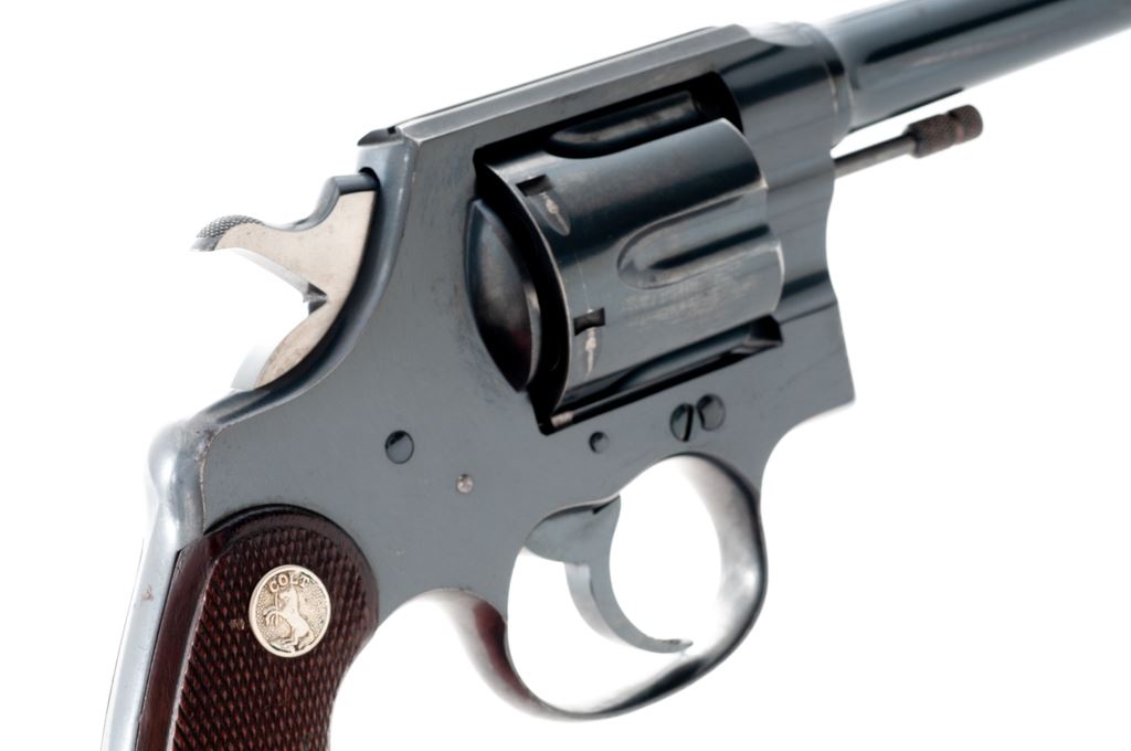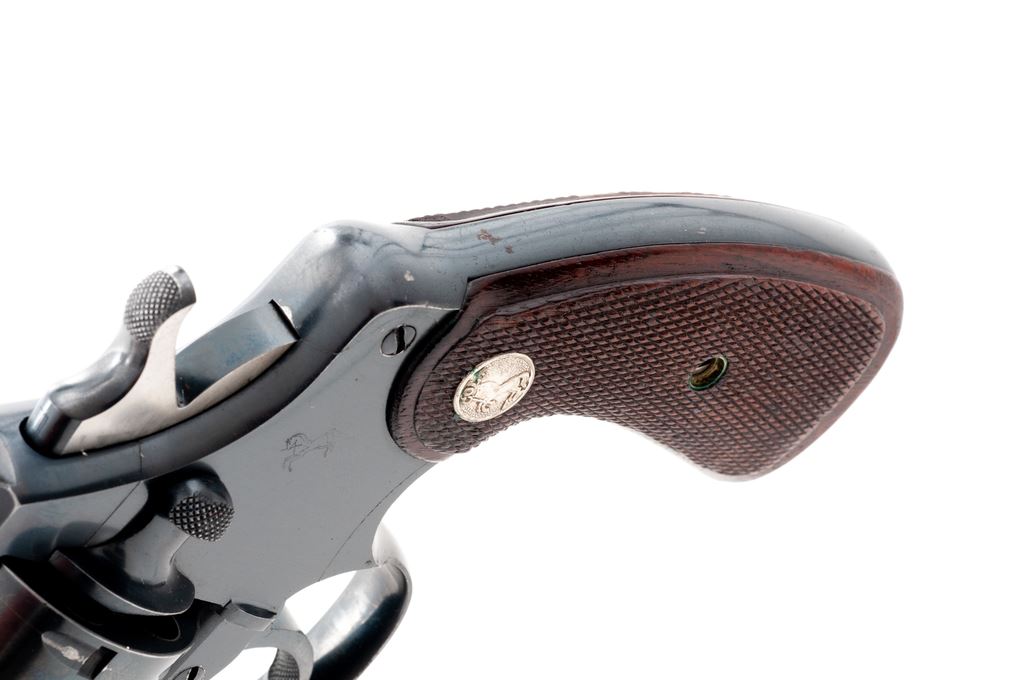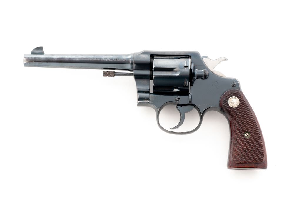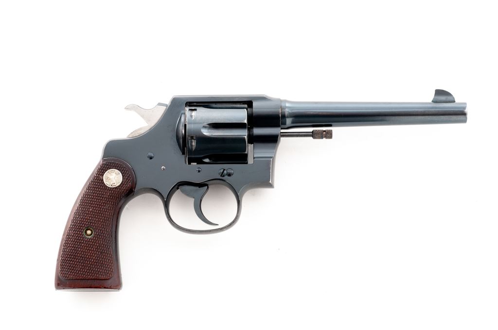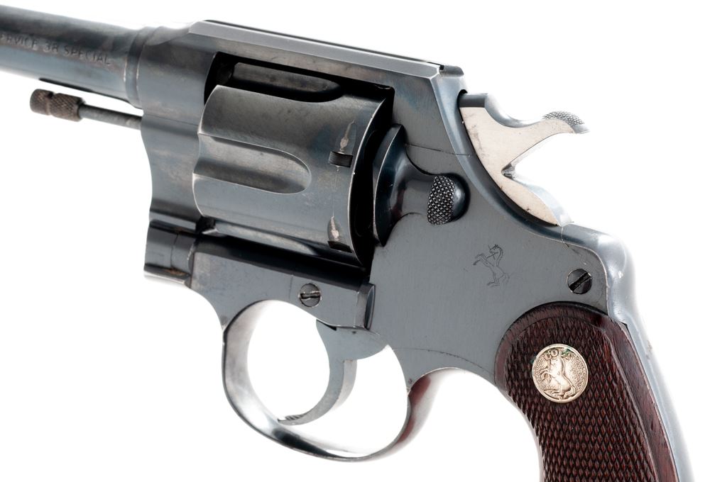 Colt New Service Double Action Revolver, #337624, .38 Spec. cal., 6'' barrel, blue finish, factory checkered walnut grips with Colt medallions. Mfg'd 1933. Condition is near excellent retaining approx. 92% original blue. Grips with mild flattening. Strong front and back strap; light wear at muzzle and forward edges of cylinder. Action is crisp, bore is excellent. Est.: $400-$600. (C&R/PPT)