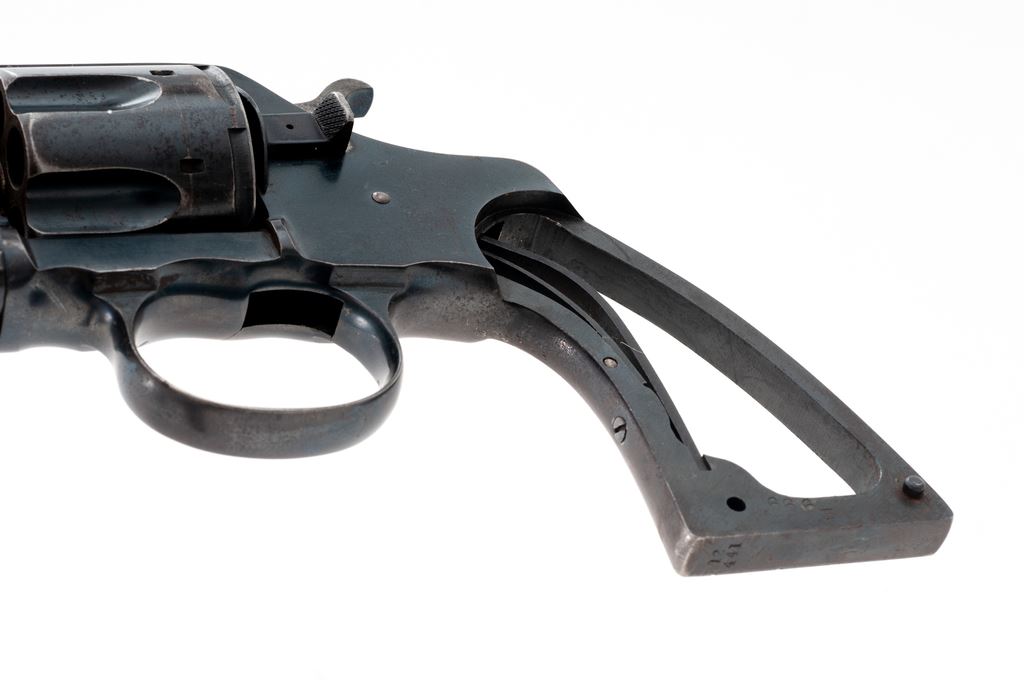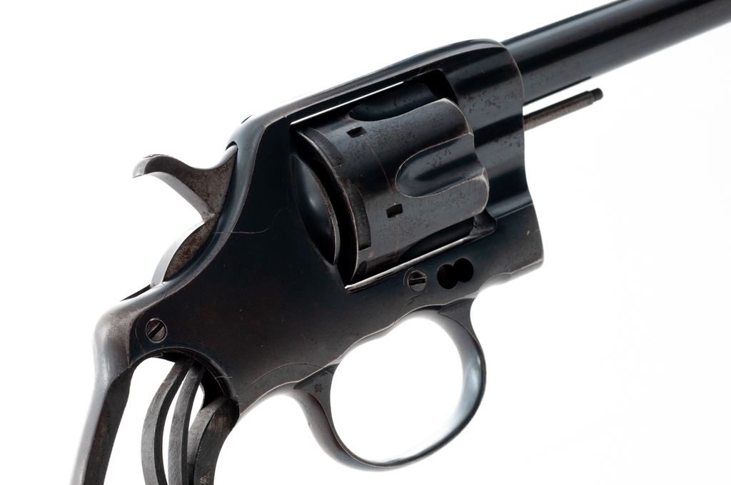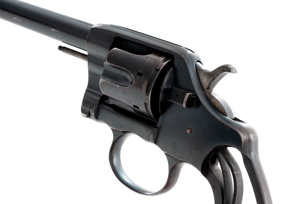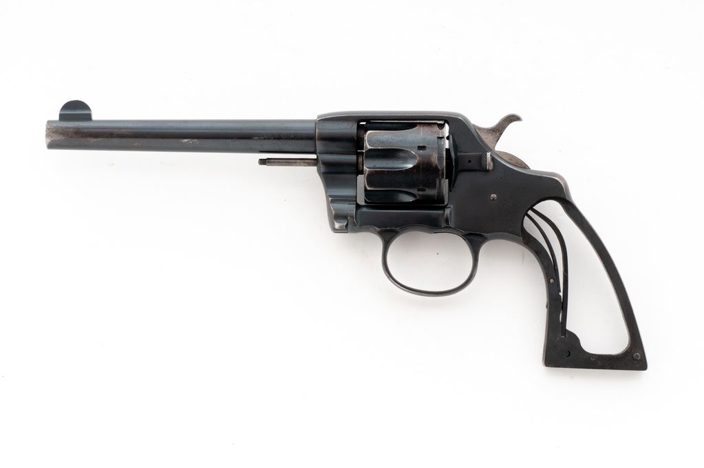Colt Model 1905 Double Action Revolver, #12441, 38 Colt cal., 6'' barrel, factory blue finish. No grips. Condition is fair, still retaining approx. 90% blue, but missing grips, ejector rod tip, cylinder pin screw, trigger, and some internal parts. Bore is fine. Est.: $150-$300. (C&R/PPT)