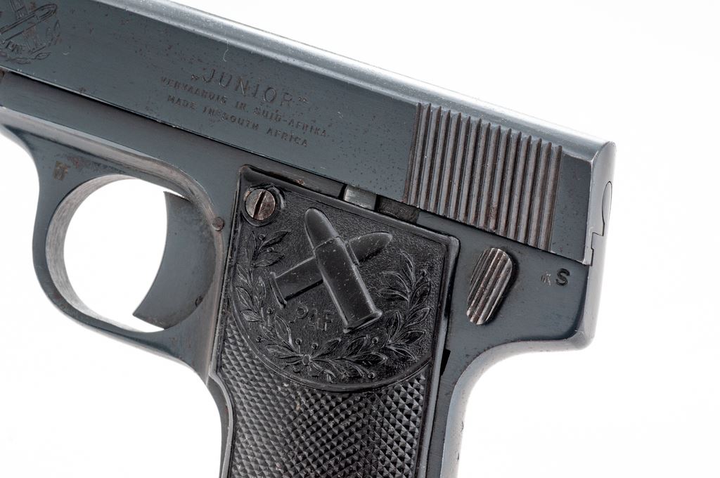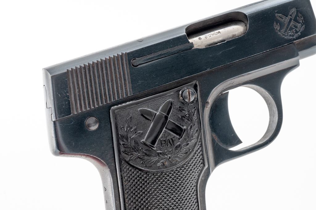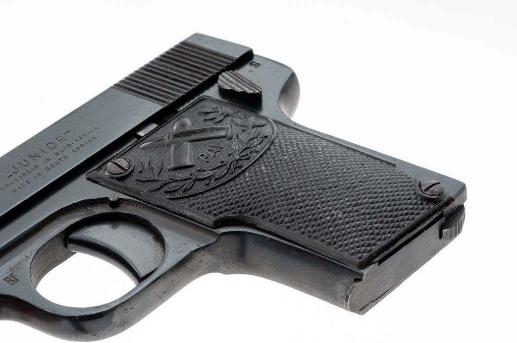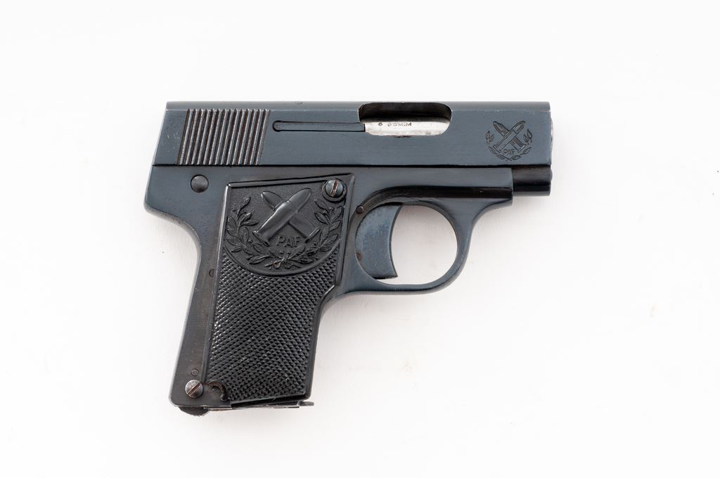 PAF Junior Semi-Automatic Pistol, #A4422, .25 ACP cal., 2.25'' barrel, blue finish, checkered black plastic grips, with one factory magazine. Mfg'd in South Africa and scarce in this country. Condition is near excellent as refinished, retaining approx. 96% blue. Grips show moderate flattening with some losses near bottom grip screw. Good action, bore with some mild pitting. Est.: $250-$400. (C&R/PPT)