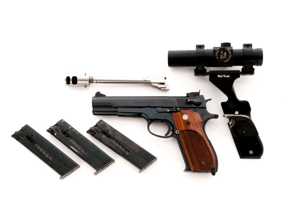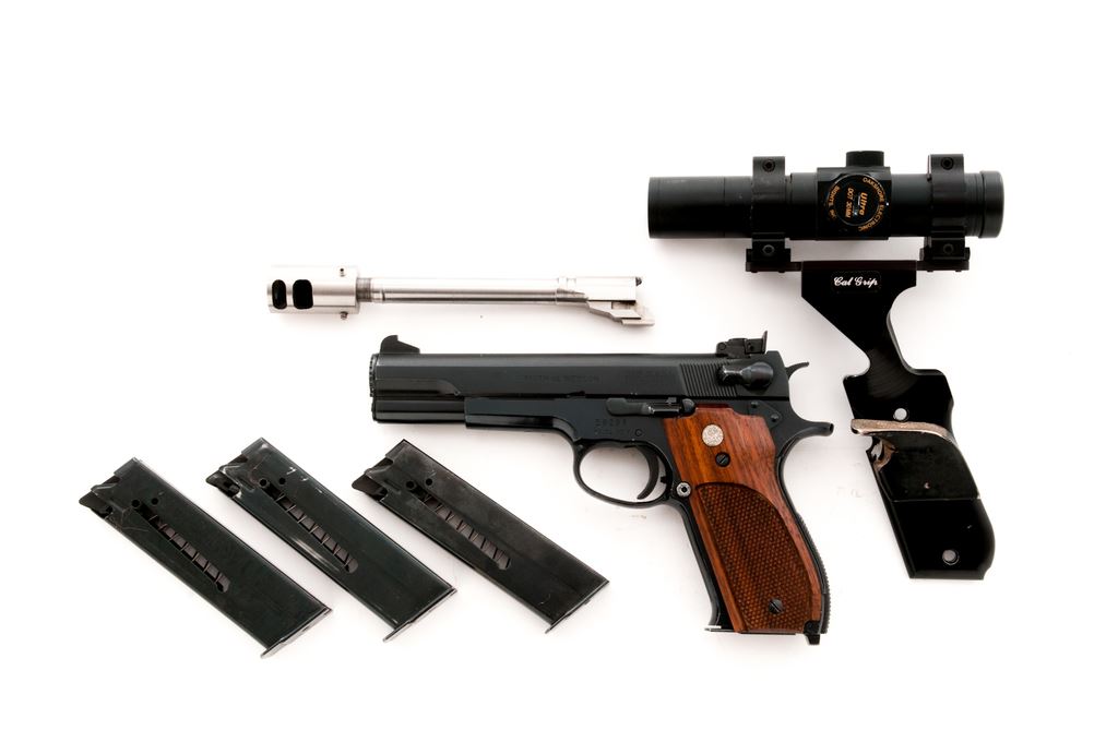 Smith & Wesson Model 52-1 Semi-Automatic Target Pistol, #59298, .38 Spec. Mid-Range Wadcutter cal., 5'' barrel, blue finish, factory checkered walnut grips. Includes three (3) magazines (2 are marked S&W), additional 6'' .38 Spec. Bar-Sto barrel with threaded muzzlebrake, black aluminum Cal Grip with added thumbrest, one walnut thumbrest grip, and an Oakshore Electronic red-dot sight mounted to the Cal Grip. All parts are in very good used condition showing moderate age and wear. Barrel with a bright bore. (Reminder to our local bidders: As it sits this barrel is not legal to install in a handgun in the state of California.) Pistol condition is excellent retaining approx. 96% blue with very minor scratches from range use. Crisp grips, smooth action, bright bore. Est.: $750-$1,000. (C&R/PPT)