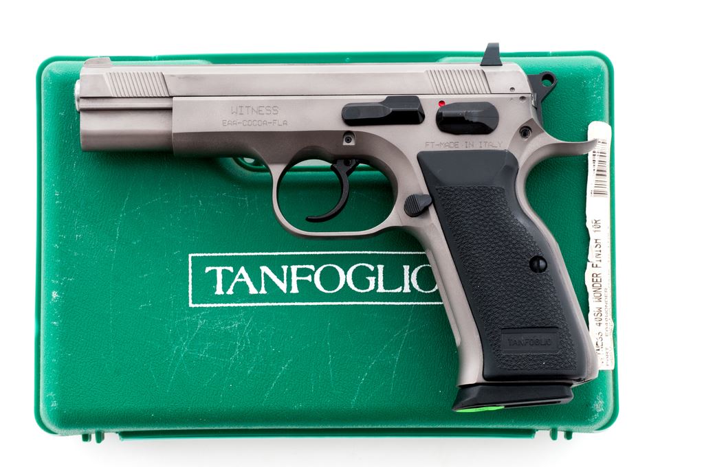 EAA Witness EA 40 Semi-Automatic Pistol, #EA15151, double/single action, .40 S&W cal., 4-3/8'' barrel, ''Wonder'' finish, stippled black rubber grips, red-dot front sight, white two-dot rear sight, with one 10-round magazine. In green plastic Tanfoglio case with matching end label, trigger lock, and owner's manual. Top of slide with intermittent dark spots on the finish, otherwise pistol is in near excellent overall condition and shows only normal light handling marks and signs of range use. Smooth action with an excellent bright bore. Est.: $400-$600. (Modern/PPT)
