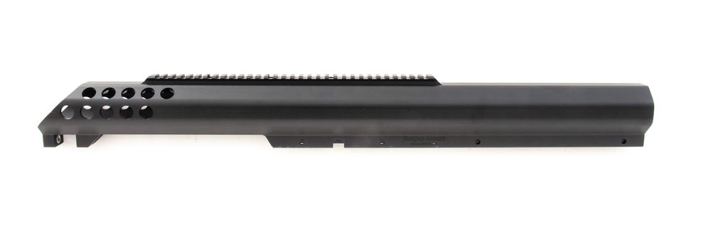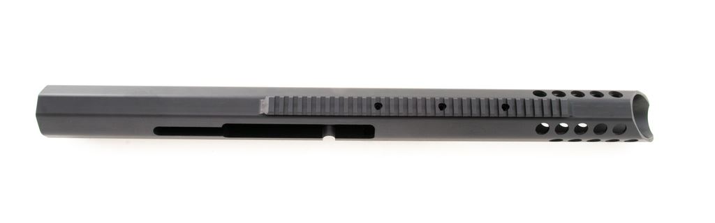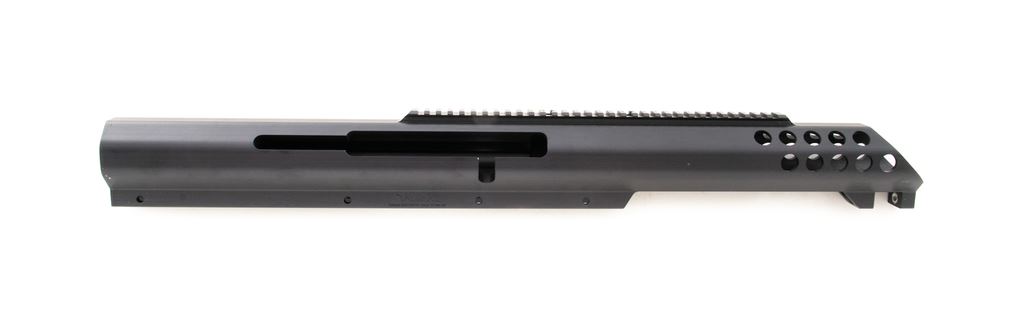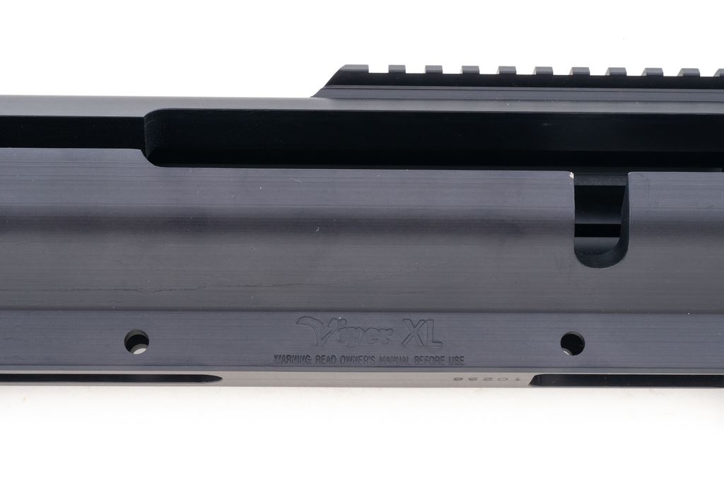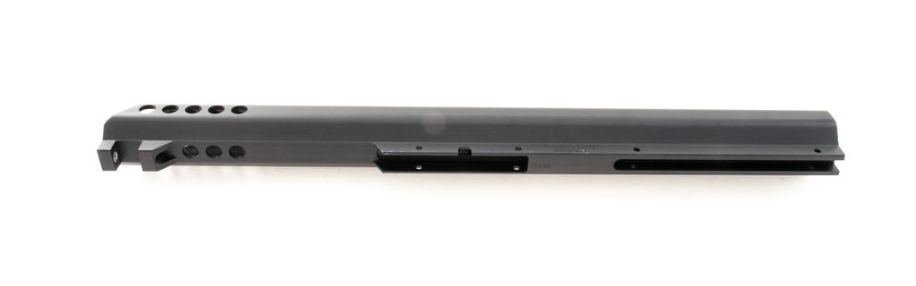 Bluegrass Armory VIPER XL Large Caliber Rifle Frame, single shot bolt action, #10258, black anodized finish. Integral 30 MOA Picatinny style rail. Frame is all one piece, no welded parts or components. Appears to be new-old stock in very good condition, with small marks from handling along side of frame and edges. There is a dent to rear bottom corner of frame and a mark in the finish on edge of bolt slot. Est.: $600-$800. (Modern)