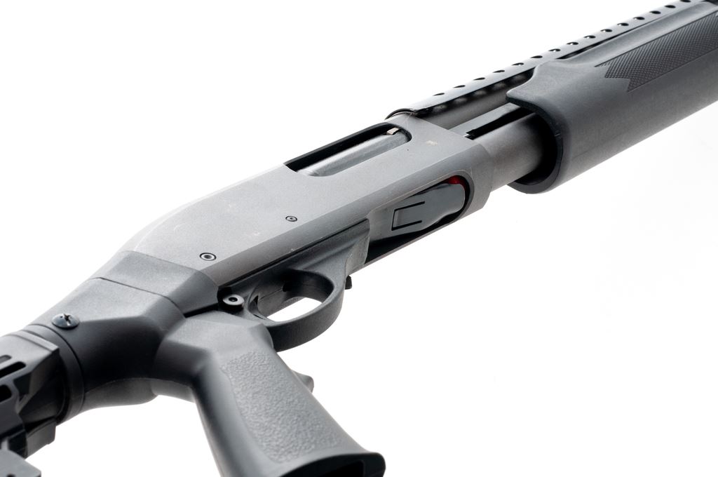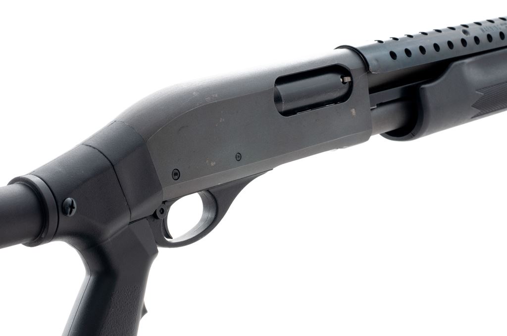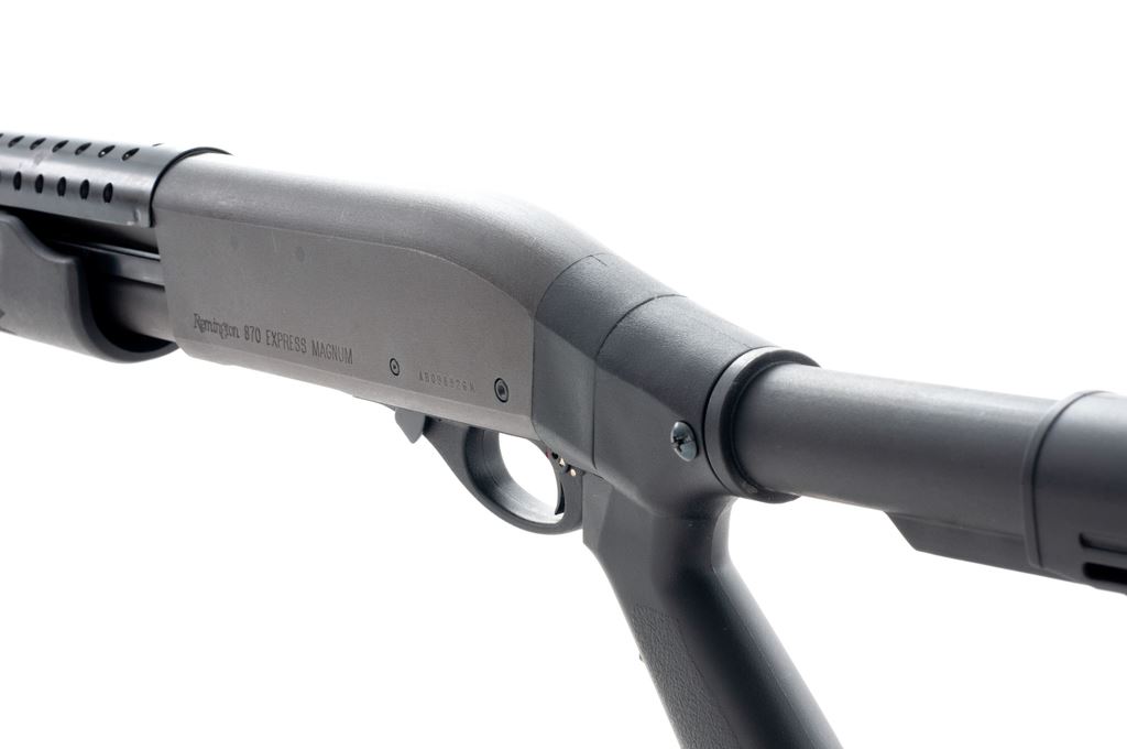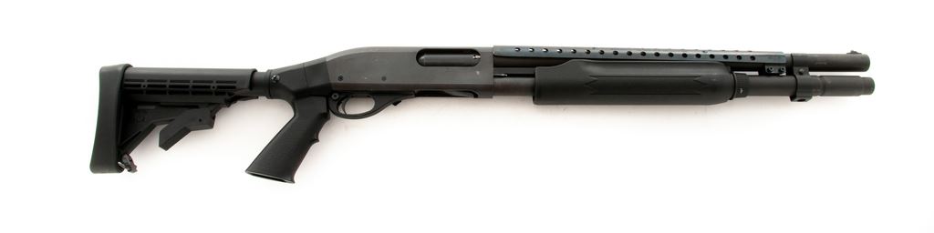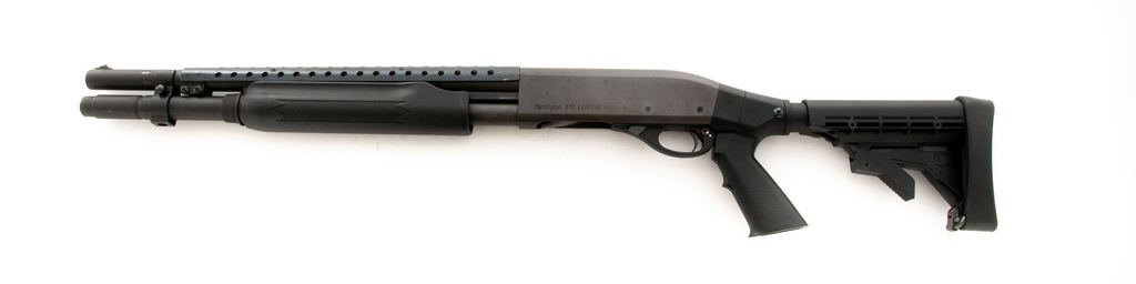 Remington Model 870 Express Magnum Pump Action Shotgun, #AB098926M, 12 ga., 3'' chamber, 15.5'' barrel choked IC, with matte finish. Black synthetic ATI stock with full pistol grip, and buttstock is adjustable to six-positions. Also featuring a vented metal heatshield and silver bead front sight. Included are two Remington ''J-Lock'' keys. Overall condition is very good showing normal signs of handling and moderate use. Metal retains approx. 97% original matte finish with a few spots of finish loss to right side of receiver. Forend with general slight surface scuffs, ATI stock is excellent. Heatshield with one small spot of fine pitting. Excellent crisp action and bore. Est.: $200-$400. (Modern)