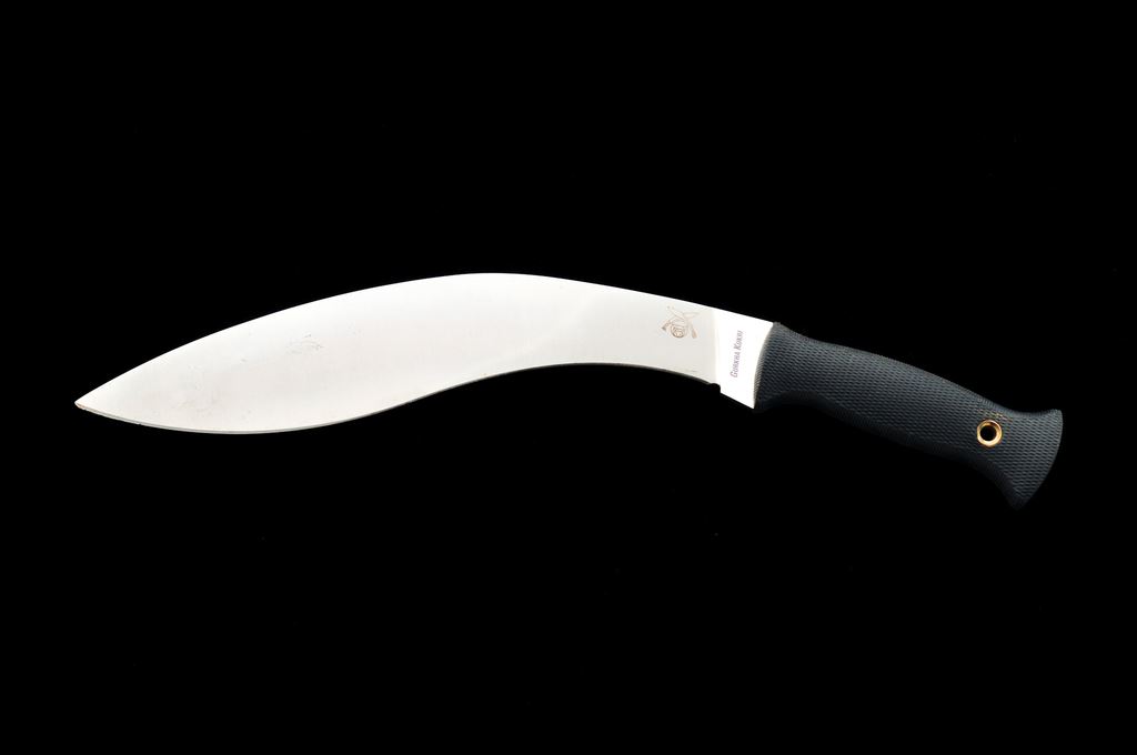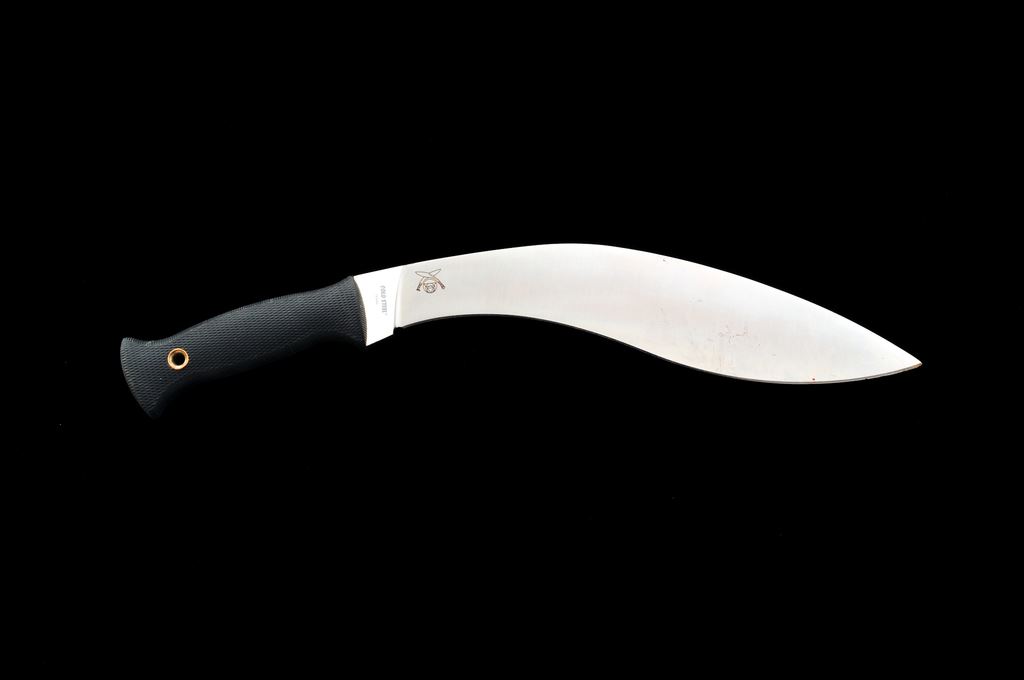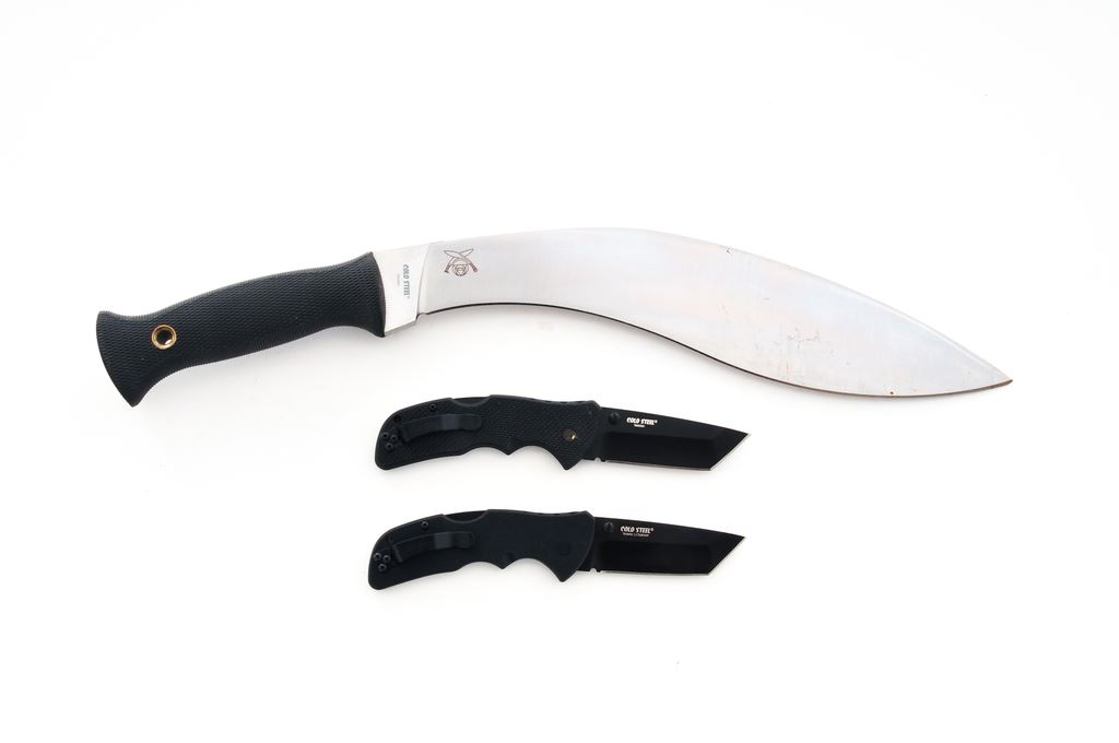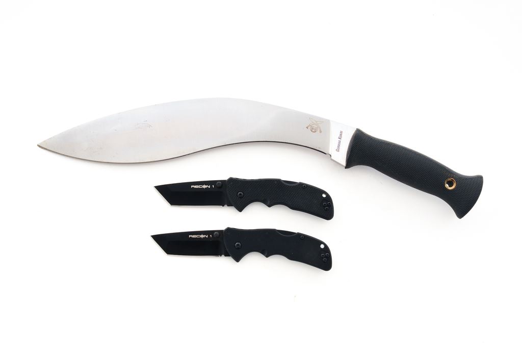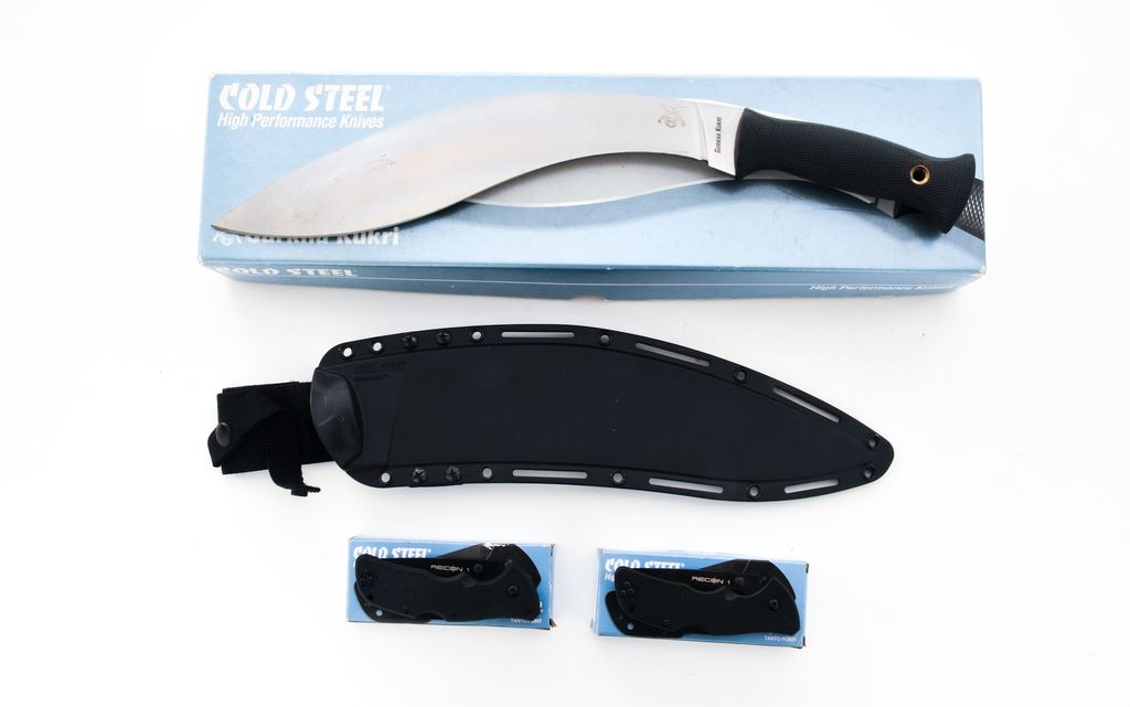Lot of Two (2) Folding Knives & One (1) Gurkha Kukri, by Cold Steel: 1.) Model #39LGKT, Gurkha Kukri, 12'' blade, 17'' overall, checkered black rubber handle, with black kydex sheath, in original box. In very good overall condition. Blade shows signs of moderate wear with a sharp cutting edge; flat sides with scuffs and scratches and a few tiny nicks within the first 2'' of the cutting surface. 2.) Model #27TMCT, Mini Recon 1, 3'' tanto point blade, G10 handle, with original box. In excellent as new condition; never carried or sharpened. 3.) Model #27TMT, Mini Recon 1, 3'' tanto point blade, checkered black G10 handle, with original box. In excellent as new condition; never carried or sharpened. Est.: $200-$400/lot.