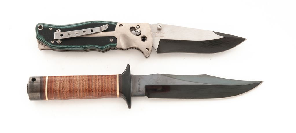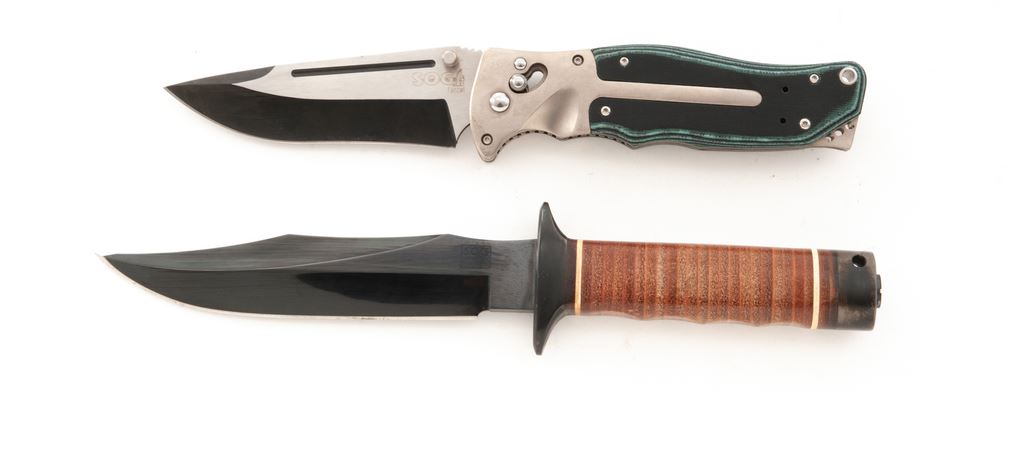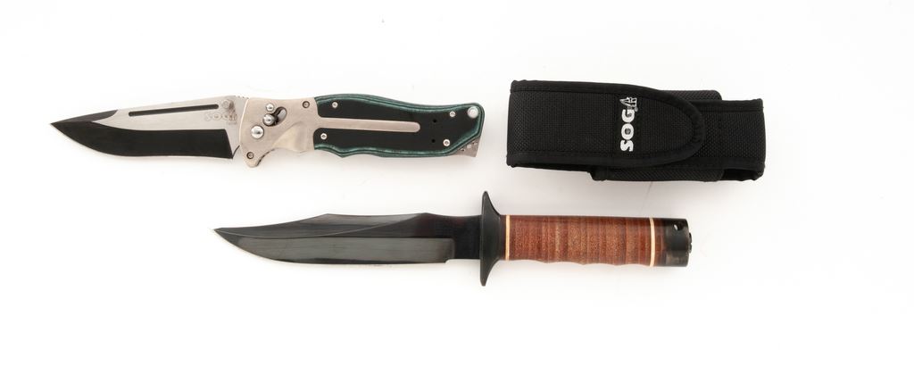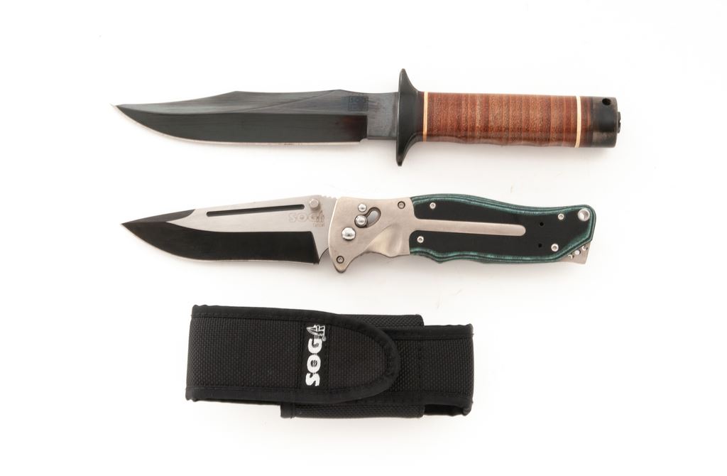 Lot of Two (2) SOG Knives: 1.) SOG Bowie Fixed Blade Knife, 6-1/4'' blued steel clip-point blade, 11-1/8'' overall, with a finger-grooved stacked leather washer handle. Made in Seki, Japan. Condition is excellent, blade with approx. 99% blue finish; top right edge with one tiny spot of finish loss. Guard and pommel show light toning. 2.) SOG Fatcat folding knife, 4-1/2'' drop point blade with dual tone black TiNi and satin finish, dual thumb studs, 5-1/2'' overall closed length, black and green G10 handle, titanium frame, ARC-LOCK system, with carry clip, and black nylon cordura SOD carry pouch. Made in Seki, Japan. Knife was carried and one of the upper frame screws on the right side is missing. Overall in very good used condition showing general moderate scuffs and scratches to metal surfaces; cutting edge is original, clean, and sharp, with no chips or additional sharpening. G10 shows only minor handling marks. Carry pouch is like new. Est.: $300-$400/lot.