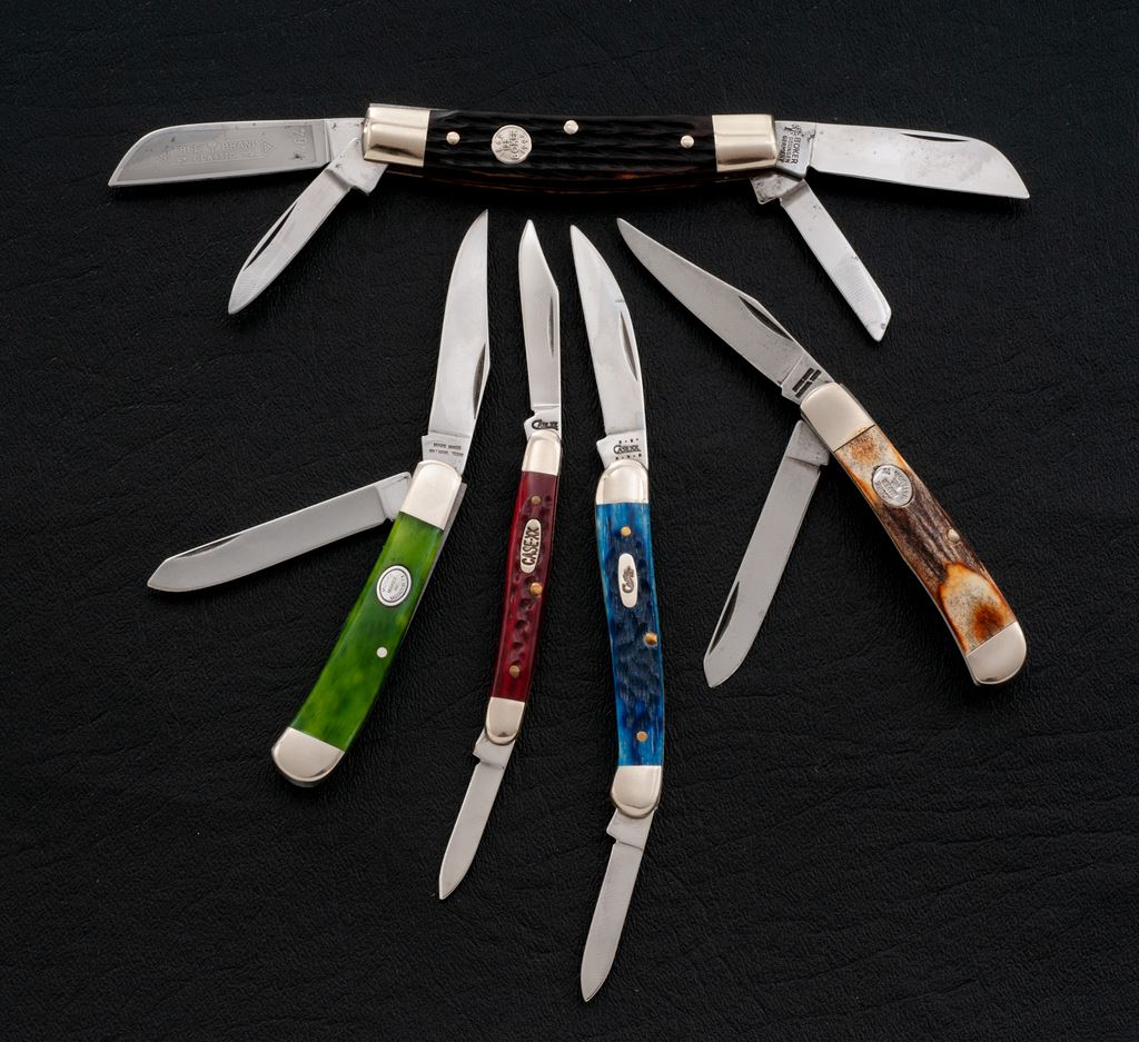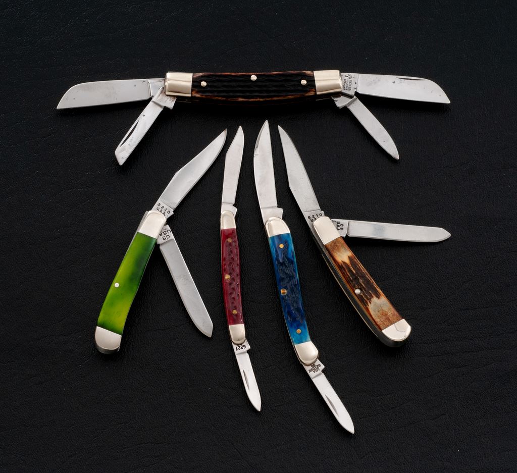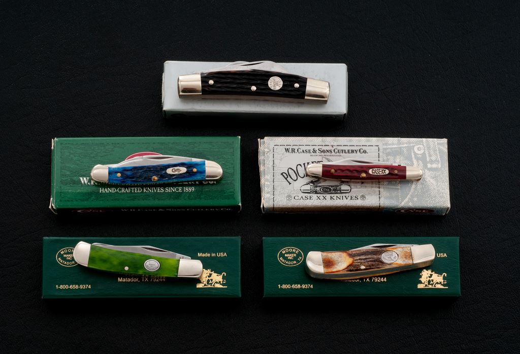 Lot of Five (5) Folding Knives, by Case, Moore Maker, and Boker: 1.) Case #6227 SS, ''Pen'' pattern, red bone handles. In original box, mfg'd 1999. 2.) Case #62109W SS, ''Mini Copperhead'' pattern, blue bone handles. In original box with folding pamphlet, mfg'd 2000. 3.) Moore Maker #5210, ''Small Trapper'' pattern, smooth green bone handles. In original box with warranty paperwork. 4.) Moore Maker #6210, ''Trapper'' pattern, stag handle. In original box with warranty paperwork. 5.) Boker #5464, ''Medium Congress'' pattern, brown bone handles, with round silver Boker ''1869-1994'' shield. In original box. All of the knives with the original factory edges, never carried or sharpened. Boker with a couple of small dark spots on each of the blades; otherwise the remaining knives rate excellent overall, with a few showing very minor handling marks. Est.: $150-$250/lot.