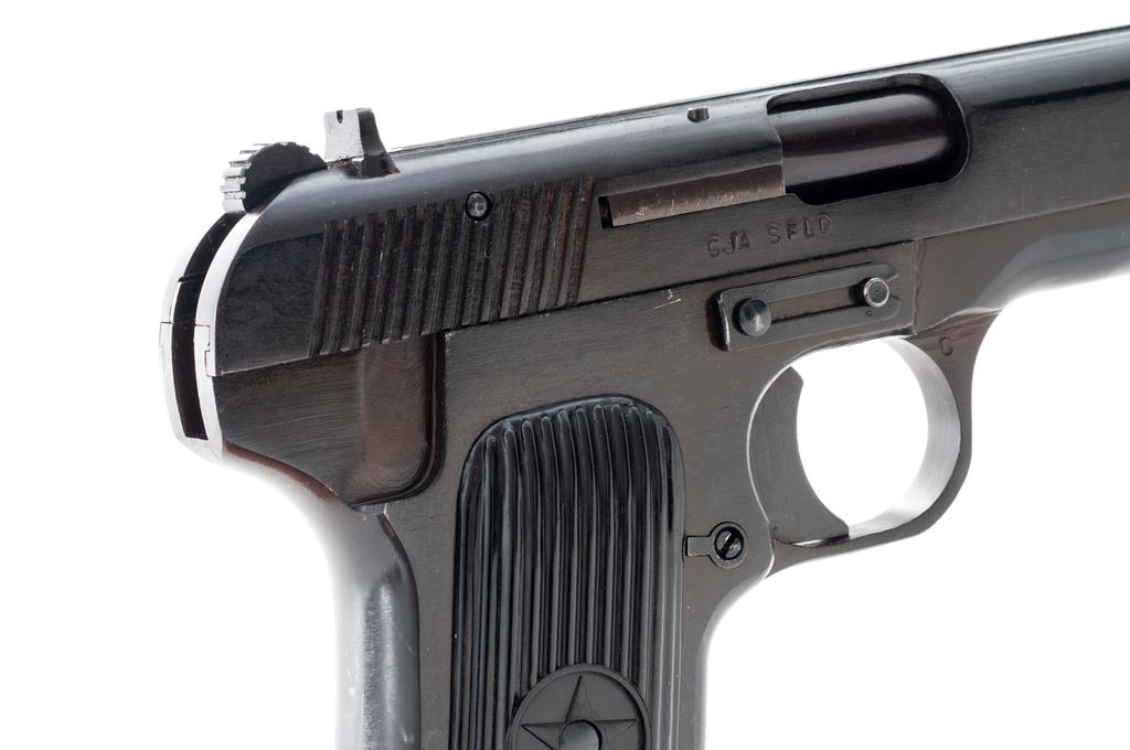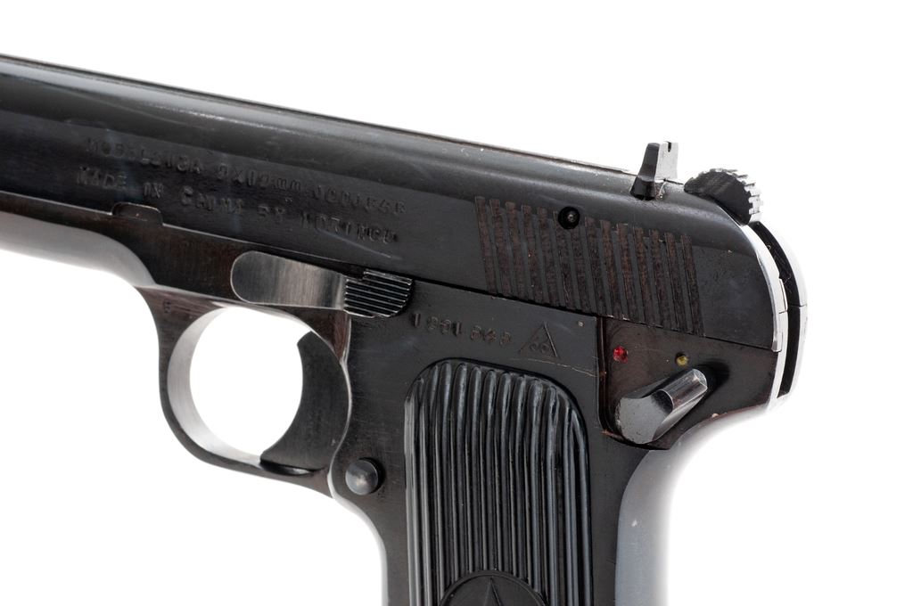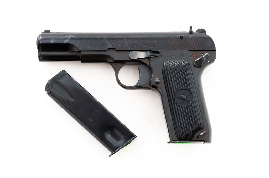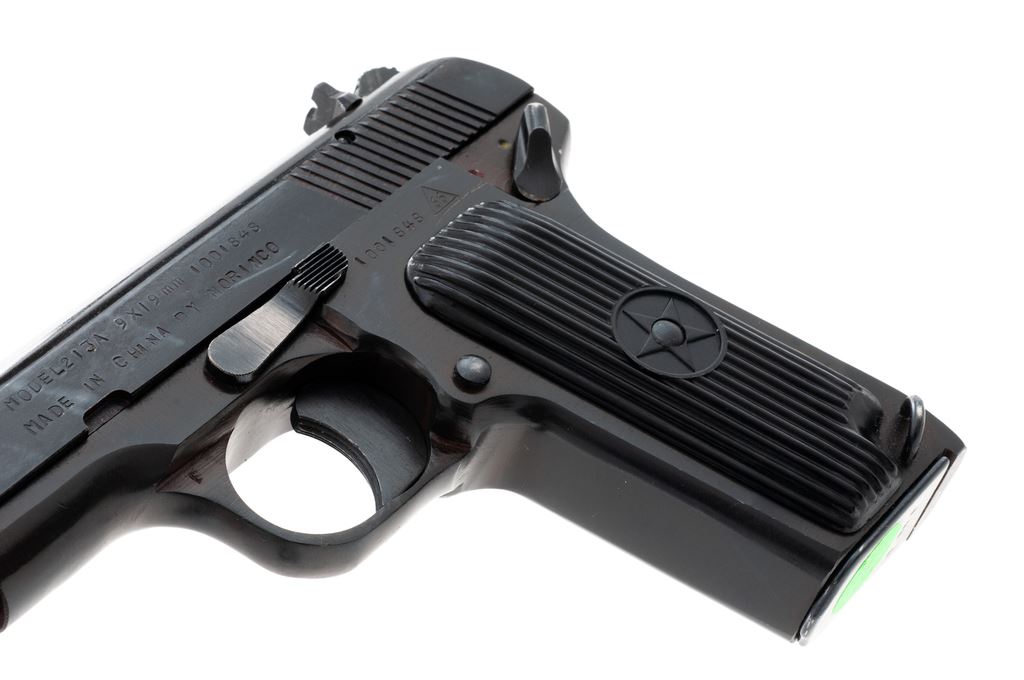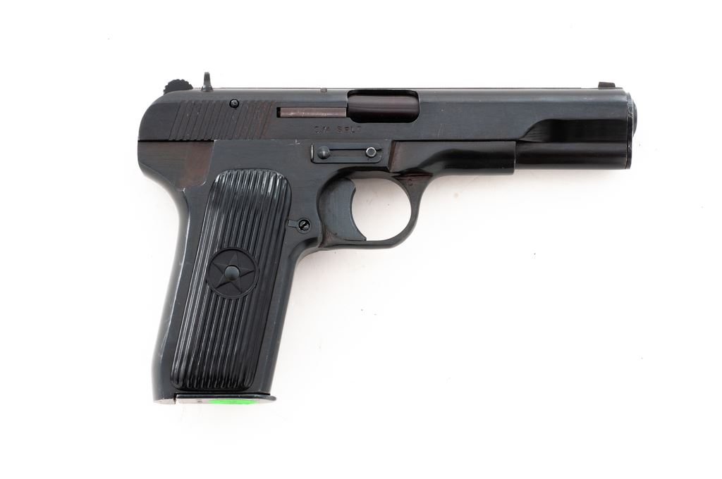 Norinco Model 213A Tokarev Semi-Automatic Pistol, #1001848, 9mm cal., 4.5'' barrel, blue finish, factory black plastic ''star pattern'' grips, with standard fixed sights, manual safety, lower left side of frame with lanyard ring, and includes two (2) 14-round magazines, one that is numbered to the gun. In plain white box that is also numbered to the gun with styrofoam insert and cleaning rod. Frame and slide with visible matching numbers; left side of frame with ''factory 66'' mark; right side of slide is import marked. Although the finish is a little rough, which is common, overall condition is excellent with approx. 98%+ remaining blue; factory lettering shows no visible wear. Grips are also excellent showing only light handling marks. Action is smooth; bore is mirror bright with strong rifling. Est.: $250-$400. (Modern/PPT) (High-cap mags not available to Calif. residents.)