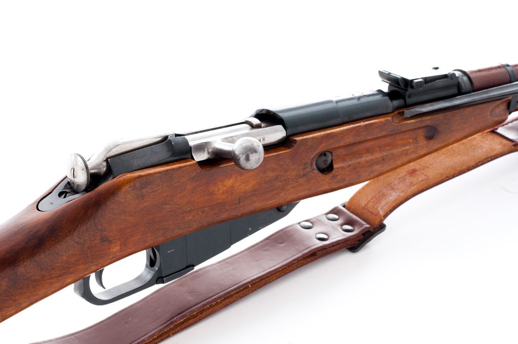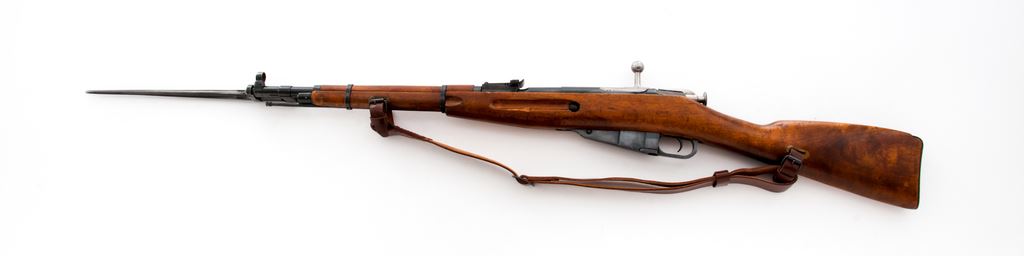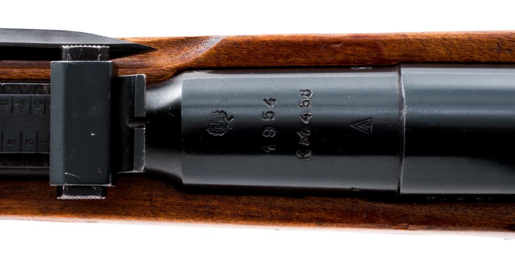 Romanian M44 Mosin-Nagant Bolt Action Carbine, with side folding bayonet, #KM458, 7.62x54R cal., 20.25'' barrel, blued finish, wood stock, hooded post front sight, adjustable tangent rear sight, cleaning rod, and reddish brown leather sling. Romanian marked on barrel shank and dated ''1954''. Top edge of buttstock near the buttplate with the number ''6'' stamped into the surface. Barrel, receiver, bolt, and buttplate with matching numbers; triggerguard does not match. Left side of barrel is import marked. Condition overall is very good with approx. 93%-95% blued finish remaining on metal surfaces; a majority of the finish loss occurs on the buttplate. Stock with scattered shallow impressions and handling marks as well as a little larger impression at the left finger groove; wood with an added coat of finish. Factory lettering is clear. Action is smooth with an excellent bright and shiny bore. Bayonet is near excellent with some scattered nicks to the edges; operates smoothly. Sling is excellent showing light age and wear. Est.: $200-$300. (C&R)