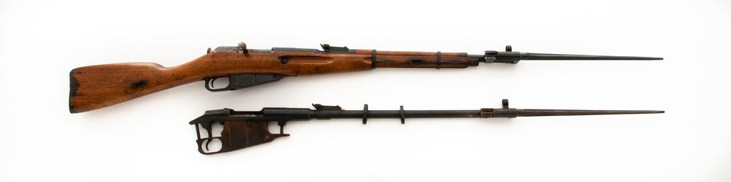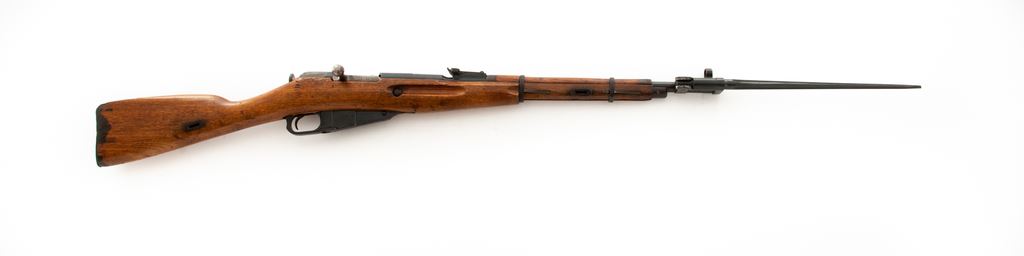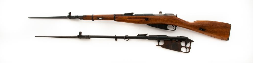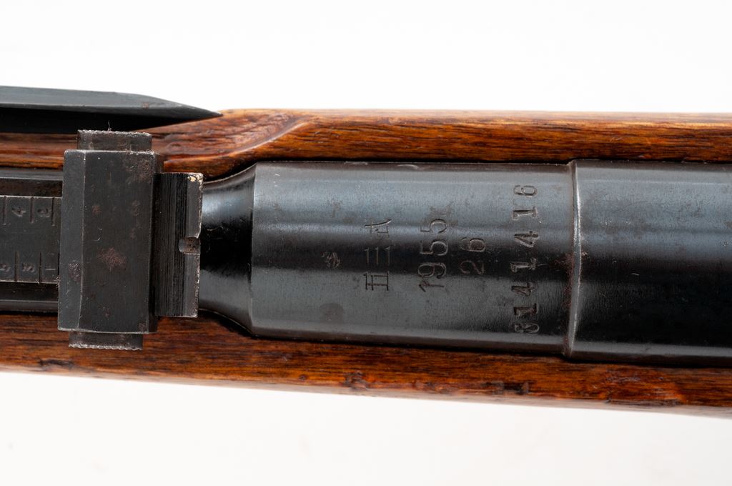 Lot of Two (2) Chinese Type 53 Mosin-Nagant Bolt Action Carbines, with folding bayonets: (1) #3141416, 7.62x54R mm cal., 20.4'' barrel, blued finish, hardwood stock, hooded post front sight and adjustable tangent rear sight. Marked on barrel shank with partial ''H/(Chinese characters)/1955/26''. Missing cleaning rod. Mismatched numbers on bolt assembly, matching numbers on magazine floorplate and buttplate. Buttplate shows extensive pitting, otherwise the condition overall is very good with metal retaining approx. 70% finish with patina and thinning on the bayonet mounting bar and collar. Wood has had added semi-gloss varnish applied and is in very good condition, with staining around the buttplate and overall scratches and handling marks. Action is smooth, bore has some roughness towards the muzzle, otherwise bright with very good rifling. No visible import stamps. (2) #1201523, 7.62x54R cal., 20.4'' barrel, blued finish, no stock, hooded post front sight and adjustable tangent rear sight. Marked on barrel shank with ''H/L296/(Chinese characters)/1954.10''. Barreled action with sights, trigger, magazine assembly, handguard bands, and folding bayonet assembly only. No bolt,stock, or other parts are included. Condition overall is fair with approx. 50% finish remaining on metal with extensive patina overall. Dark bore is poor with visible rifling. No visible import stamps. Est.: $300-$400. (C&R)