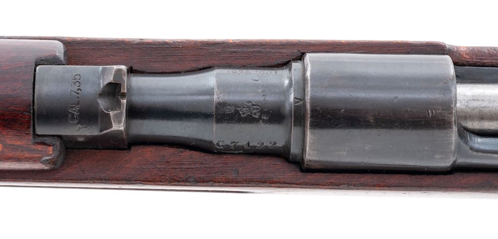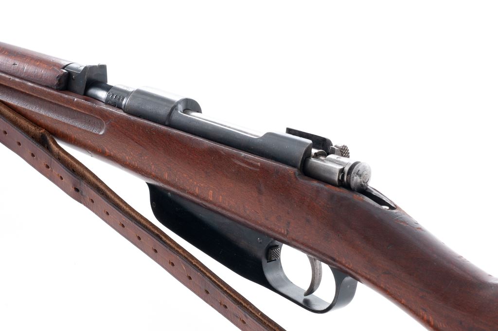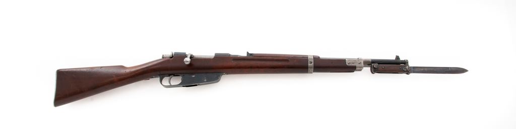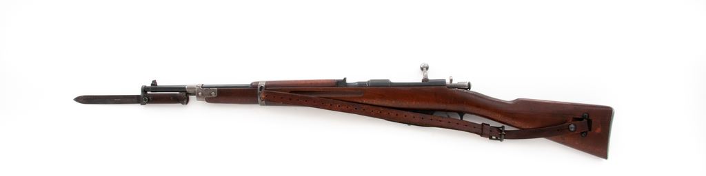 Italian Model 1938 Mannlicher Carcano Bolt Action Rifle, with folding bayonet, #G7122, 7.35x51mm cal., 20.9'' barrel, blued finish, hardwood stock, inverted ''V'' front sight and fixed notch rear sight. Marked on top of barrel shank with ''(crown)/RE/Terni''; Fascist ''1939 XVII'' on right side of barrel shank. Faint cartouche on left side of buttstock. Mismatched number stamped on left side of buttstock. Condition overall is very good with approx. 70% finish remaining on metal surfaces, with both barrel bands and buttplate bright. Barrel has been reblued over old pitting. Wood is very good showing liquid drip marks around right side of action and light chipping around the tang with overall handling marks. Action is smooth, bore is very good. No visible import stamps. Bayonet is good with no damage to edge of blade, showing overall patina and handling marks. Includes a brown leather Finnish sling stamped ''SA'' in good condition. Est.: $250-$350. (C&R)