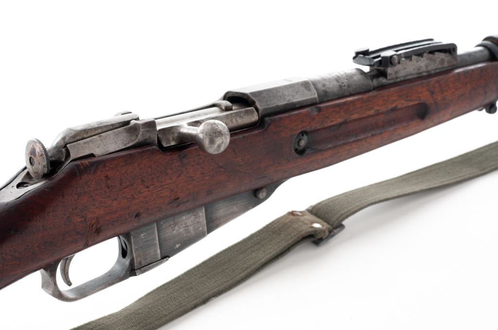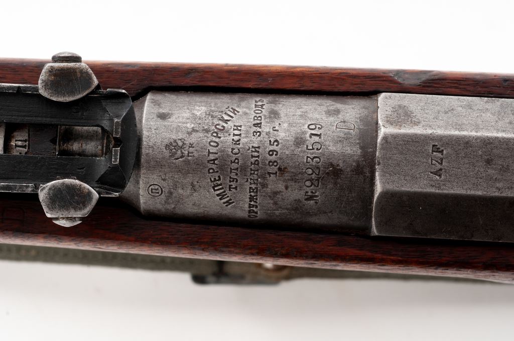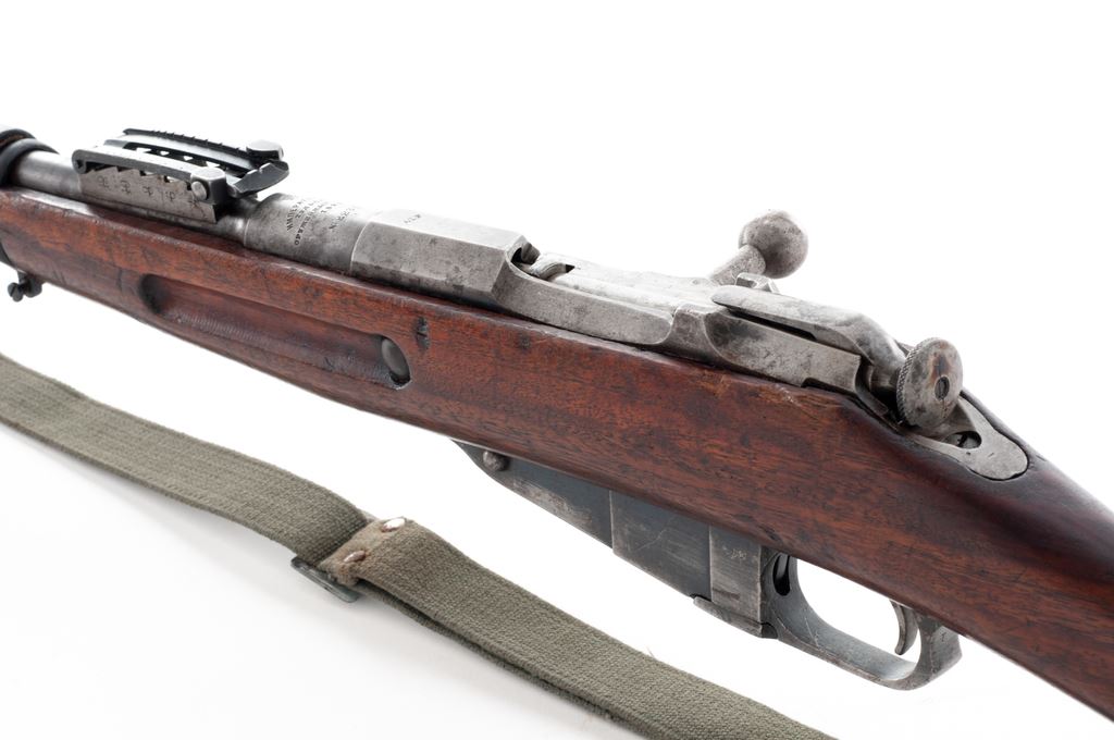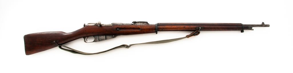 Russian M91 Mosin-Nagant Bolt Action Rifle, #223519, 7.62x54R cal., 31.6'' barrel, blued finish, walnut stock, blade front sight and adjustable Konovalov rear sight. Marked on receiver ring with the Czarist crest over three-line Cyrillic script indicating mfg. at the Tula Arsenal, over ''1895''. Stamped ''AZF'' on chamber flat indicating capture and re-issue by the Austro-Hungarian Empire. Stock is a replacement and is stamped with a partially intact cartouche of the New England Westinghouse Co. on left side of buttstock. Bolt has been re-numbered to match, other numbers are mismatched. Includes cleaning rod. Sling slots are filled in and sling swivels have been installed. Condition overall is good with approx. 30% finish remaining on metal surfaces, with fading and patina on receiver, barrel shank, bolt, and buttplate. There are cleaning scratches on both sides of the magazine and barrel. Wood is very good with an even dark color and overall bruises and scratches. Action is smooth, bore is dark with good rifling. No visible import stamps. Includes an unmarked green cotton sling in good condition. Est.: $300-$500. (Antique)