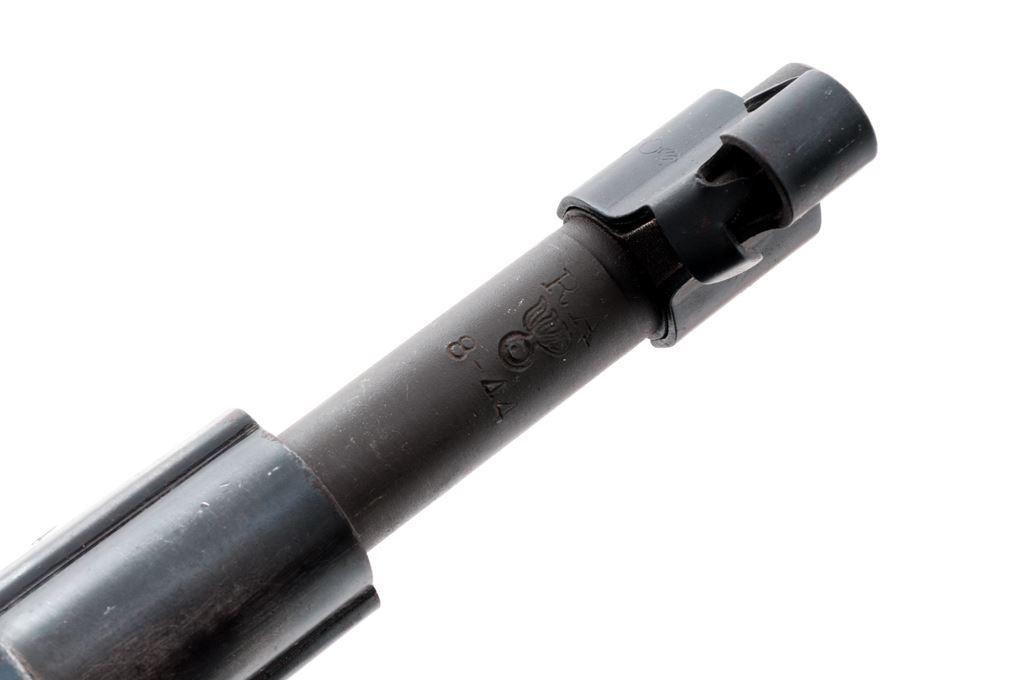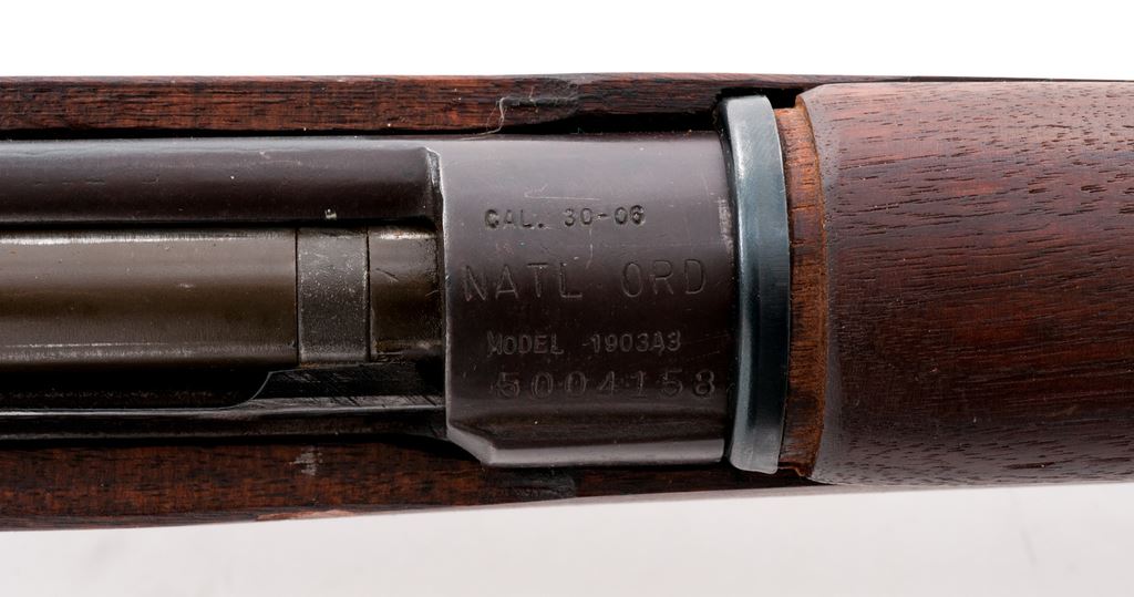 National Ordnance Model 1903-A3 Bolt Action Rifle, #5004158, .30-06 cal., 24'' barrel, blued/parkerized finish, walnut stock, blade front sight with added protector and adjustable aperture on ramp rear sight. Marked on receiver ring ''CAL. 30-06 NATL ORD MODEL 1903A3'', and on barrel behind front sight ''RA''/(flaming bomb)/8-44''. ''Scant'' type stock is unmarked. Rifle is a commercially made replica of a U.S. M1903-A3 using a new-made receiver and U.S.G.I. surplus parts. The handguard retaining ring does not fit properly and is loose. Condition overall is very good with metal surfaces retaining approx. 90% finish. Buttstock has a significant crack at the tang and a ink pen mark on the butt, with a gouge on right side at bolt channel, otherwise wood shows light handling marks. Bright two-groove barrel is excellent, action is smooth. Includes a commercial leather sling in very good condition. Est.: $300-$400. (Modern)