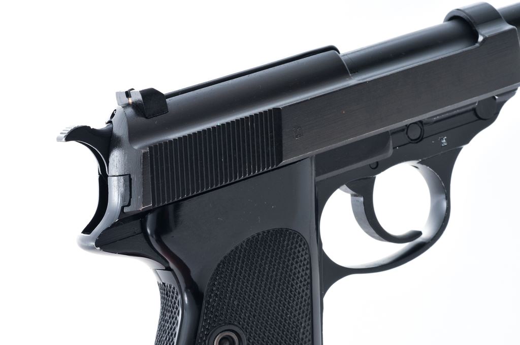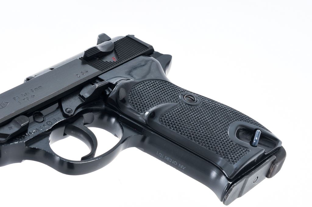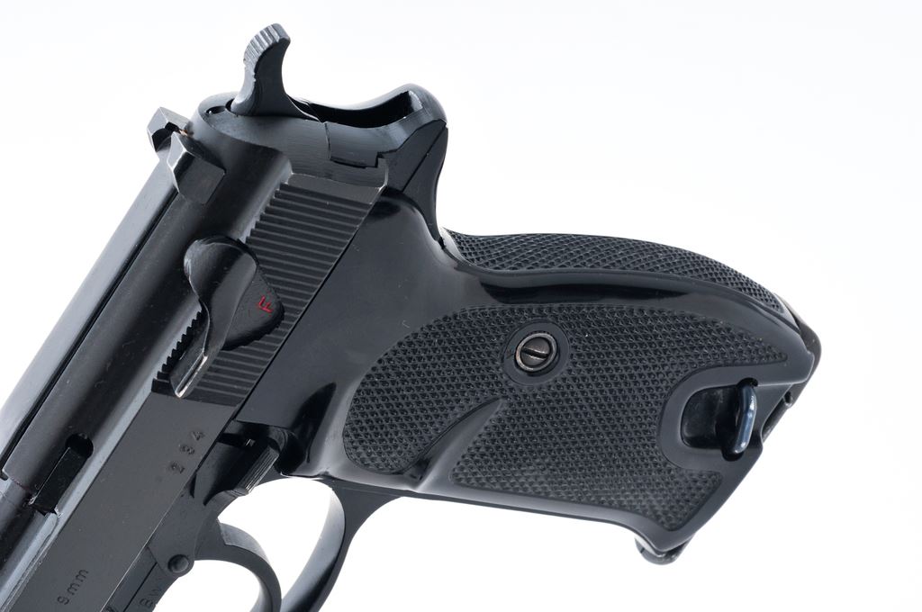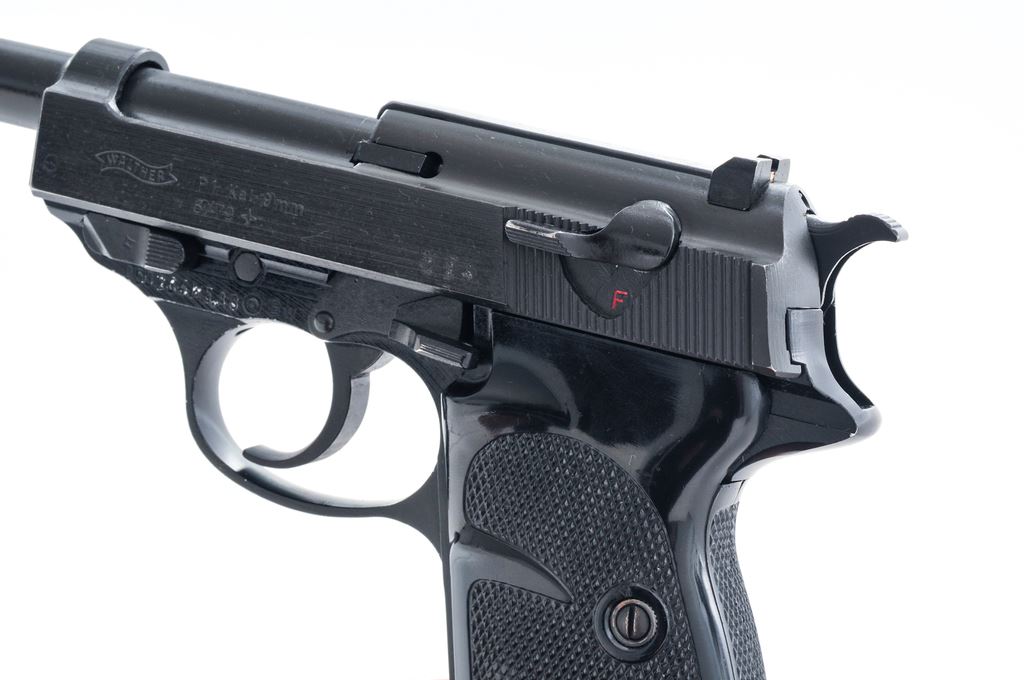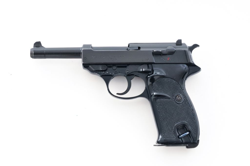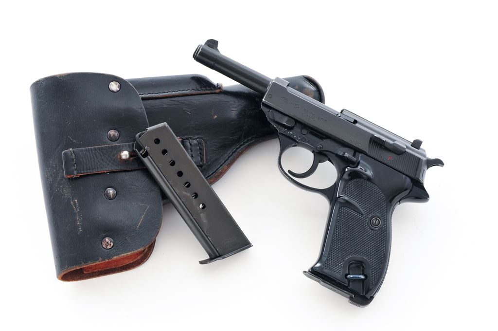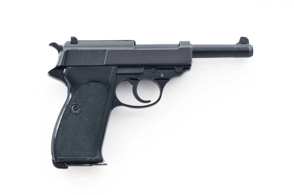 Walther P1 Semi-Automatic Pistol, with holster, #050234W5.83, 9mm, 5'' barrel, matte barrel and slide; aluminum frame with black finish, checkered black plastic grips, standard fixed sights, with two (2) Walther ''P1'' marked magazines. Left side of slide is dated 6/79; left side of frame has the serial number and rework date of ''5.83'', as well as ''BW'' federal defense mark; various ''(eagle)/413'' proofmarks can also be found on various parts of the pistol; front of the grip frame is import marked. Barrel, frame and slide with matching numbers. In a black leather holster that is dated ''4/77'' and also marked on the inside flap ''1537.B''. Approx. 97% finish remains, with high edgewear accounting for a majority of the finish loss. Factory lettering is clear. Grips show moderate wear; checkering is mostly sharp. Action is smooth with an excellent bright bore. Holster with some flaking to the black finish near the tip, stitching is sound, marks on the inside flap are clear. Est.: $300-$500. (C&R/PPT)