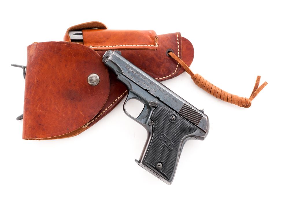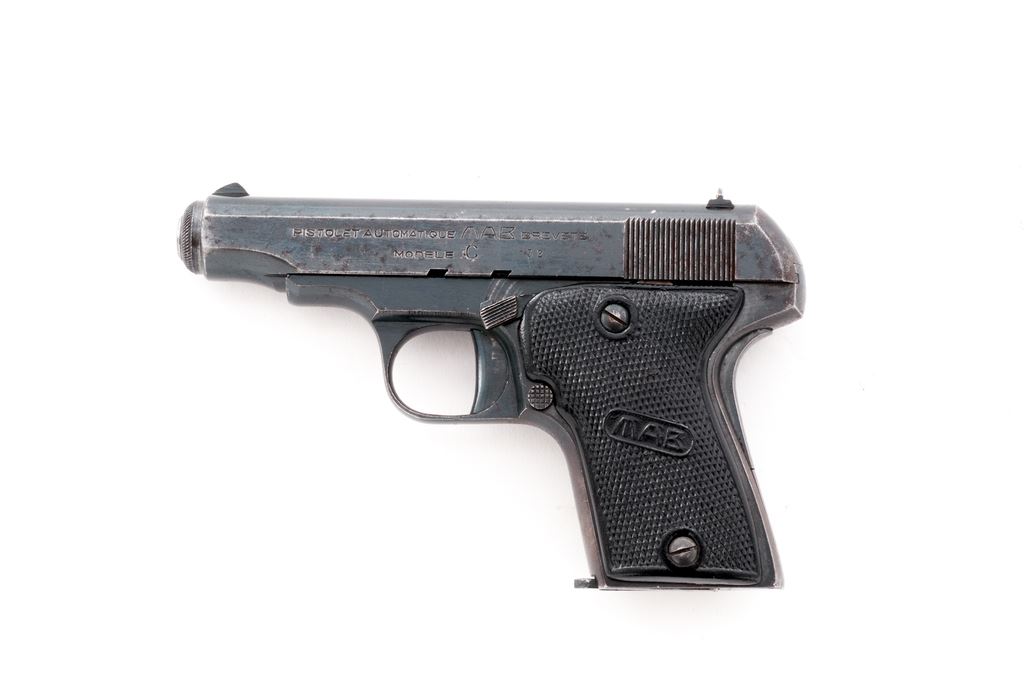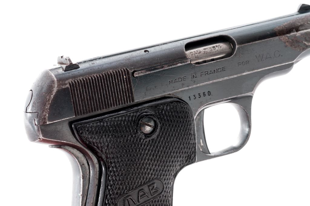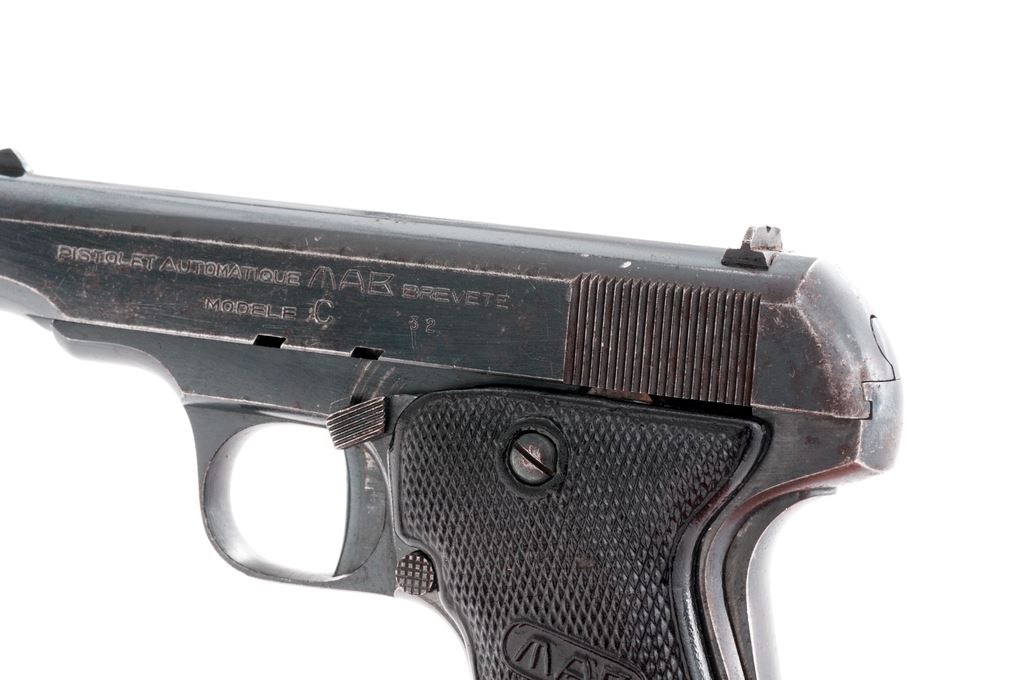 French MAB C Semi-Automatic Pistol, #13350, .32 Auto cal., 3 3/8'' barrel, blued finish, black plastic grips, blade front sight and fixed rear sight with ''U'' notch. Marked on left side of slide 'PISTOLET AUTOMATIQUE MAB BREVETE MODELE C'' and ''32''. Right side of slide is marked ''MADE IN FRANCE FOR W.A.C.''. Grip panels are marked ''MAB''. Barrel is marked ''CAL.7.65M/M''. Includes two (2) magazines that are not original or correct. Both have been crudely filed to adjust fit but both are difficult to remove. Condition overall is good, with right side of slide showing a rusted/cleaned area and left side with old pitting and overall fading and browning. Grips are excellent and may be replacements. Action is smooth, bore is worn and has a dark ring in the forward 1/3rd of barrel. No additional import marks. A French leather holster marked inside ''MAB 42'' inside the flap in very good condition is included. Est.: $200-$400. (C&R/PPT)