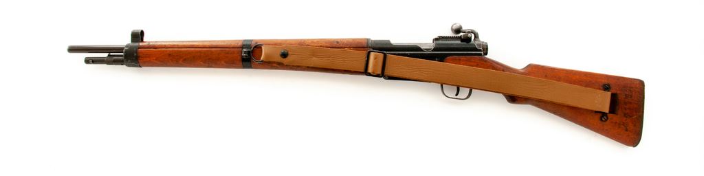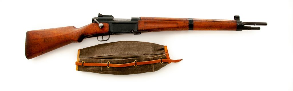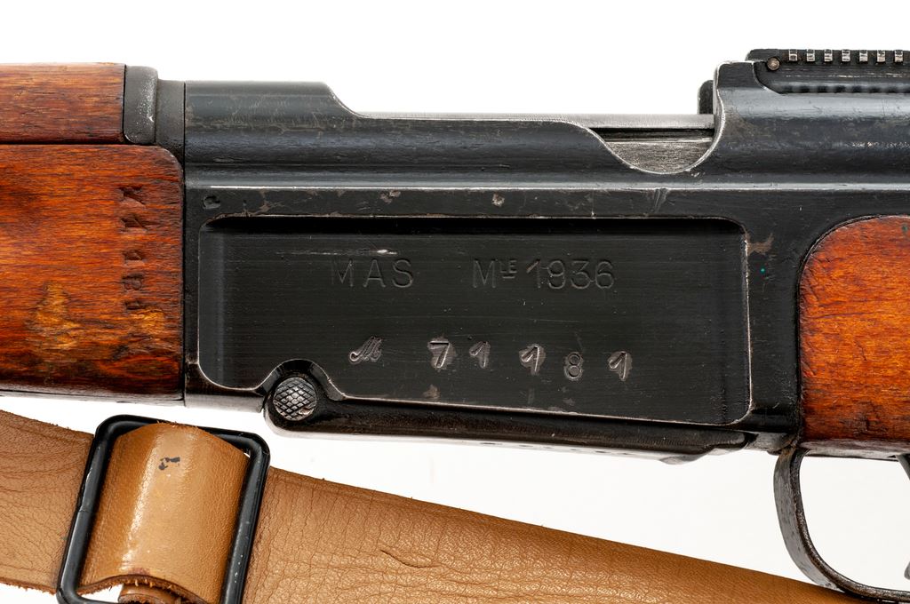 French MAS Model 1936 Bolt Action Rifle, with bayonet, #M71181, 7.5 French cal., 22.64'' barrel, blued/painted finish, hardwood stock, blade front sight with hooded protector and sliding aperture rear sight. Marked on left side of receiver ''MAS MLE 1936''. Faint cartouche on right side of buttstock. Matching numbers with arsenal re-number stamped on rear of bolt handle. Forend is slightly loose. Condition overall is very good with approx. 80% of the painted and blued finish remaining on receiver and barrel. Buttplate has areas of active rust around the edges. Wood is very good with scratches and some roughness on the forend. Action is smooth, bright bore is very good. Import stamped on right side of barrel. Bayonet is very good. Includes a French army leather sling and canvas and leather action cover in very good condition. Es.t :$250-$400. (C&R)