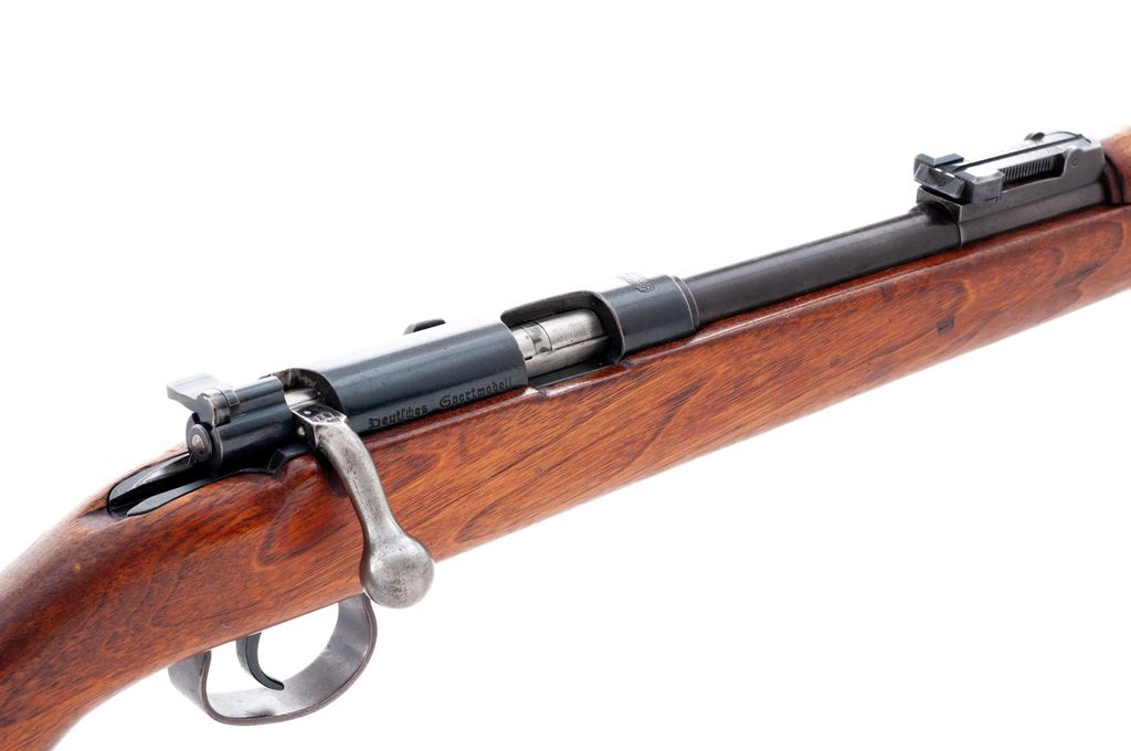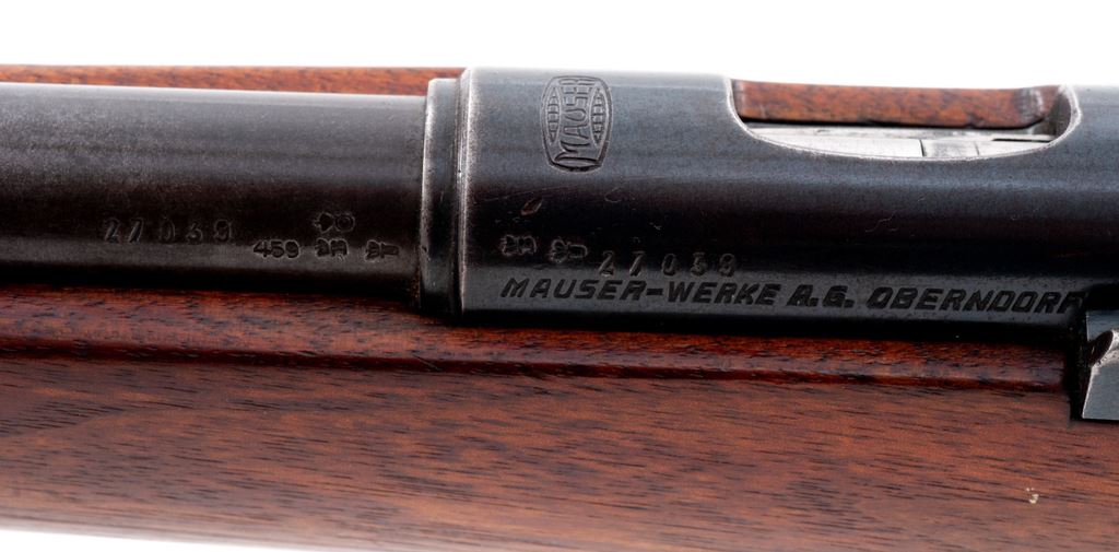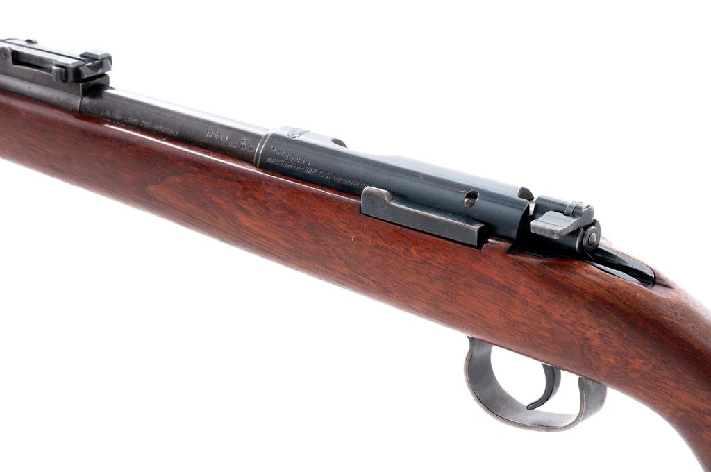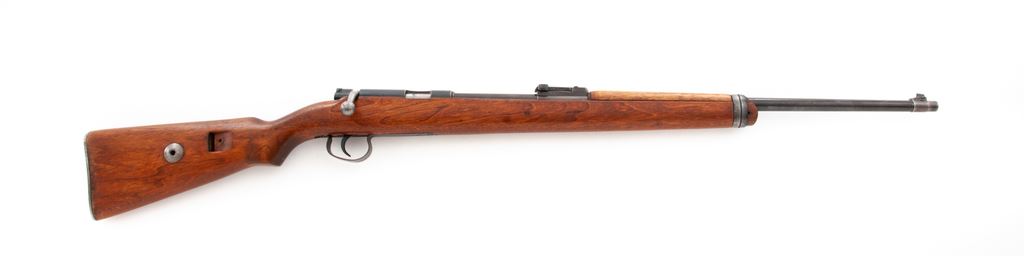 Pre-War Mauser Single Shot Sporter, #27039, .22 LR cal., 26'' barrel, blue finish, beechwood stock, with military rifle sights, steel butt cap, and BUG proofmarks. Condition is near excellent. Metal surfaces retain approx. 92% thinning blue. Stock appears to have been shortened at one point. Good action, fine bore. Est.: $300-$500. (C&R)