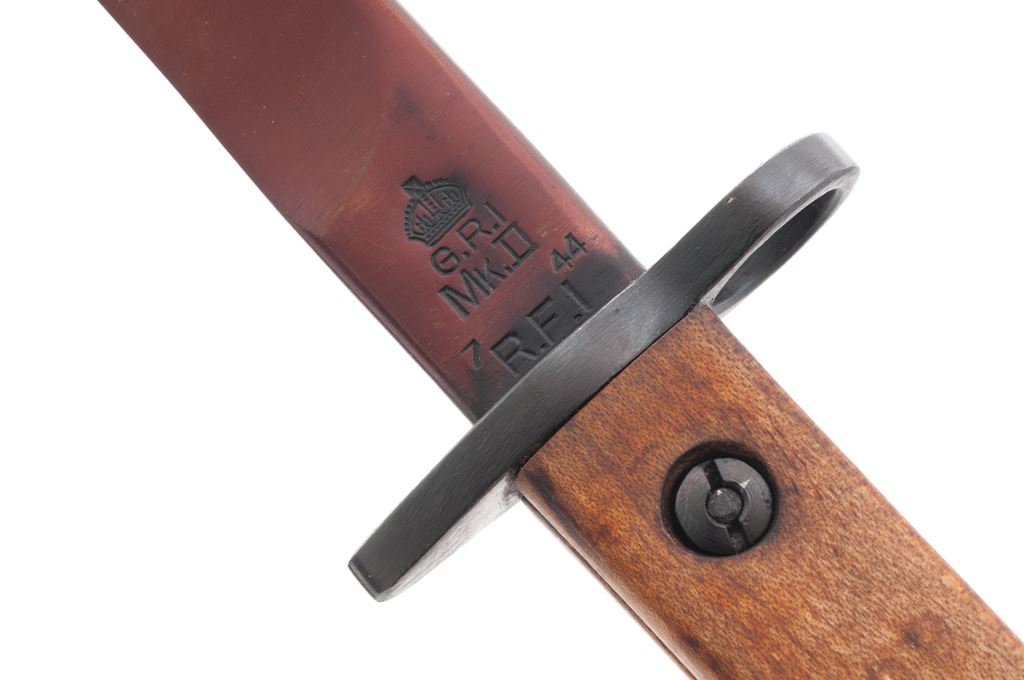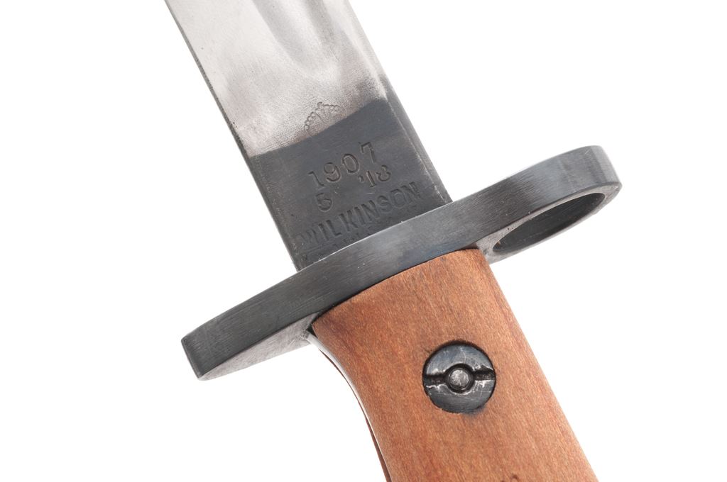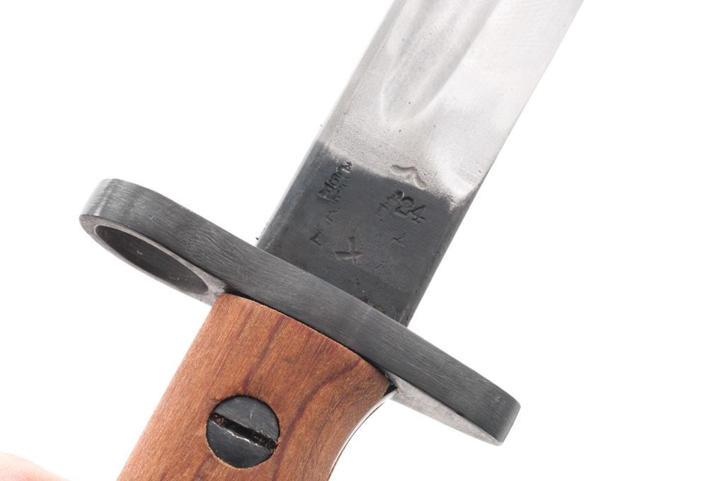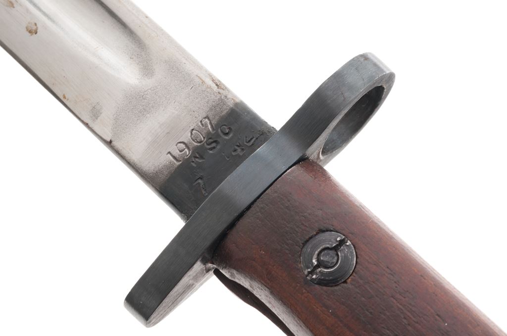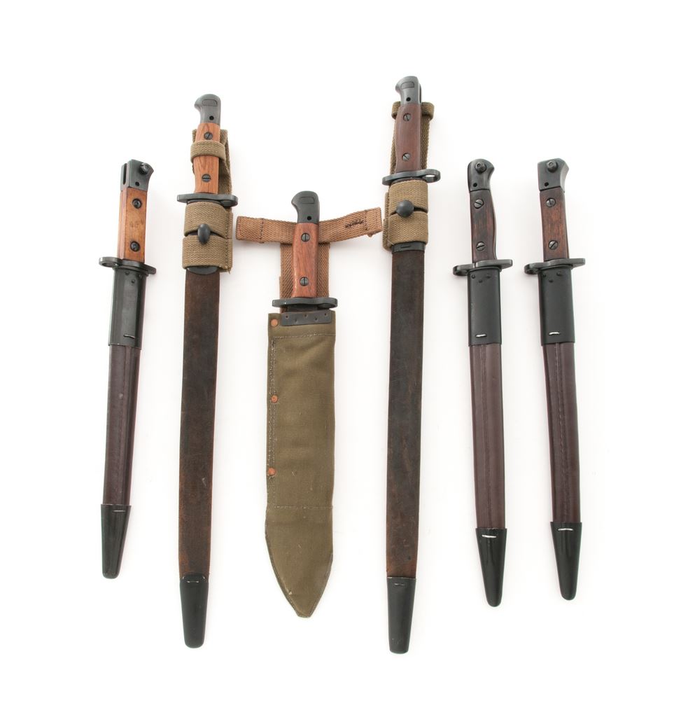 Lot of Six (6) SMLE Bayonets: 1.) Pattern 1907, 17-3/8'' blade re-stamped ''WSC'' and ''7 42'', with steel tipped leather scabbard, and repro. frog. Condition is very good as refurbished, no chips to the blade. Scabbard shows moderate wear and darkening from age. 2.) Pattern 1907, 17'' blade re-stamped ''Wilkinson'' and ''5 18'', wood grips are stamped ''SLAZ42'', with steel tipped leather scabbard, and repro. frog. Condition is very good as refurbished, no chips to the blade, grips look new. Scabbard shows moderate wear and darkening from age. 3.) Refinished Indian No. 1 Mk. II, 11-7/8'' blade is marked ''G.R.I'', ''R.F.I.'', and ''2 42'', with repro. scabbard. Condition is very good as refurbished, blade is plum colored. 4.) Refinished Indian No. 1 Mk. III, 11-3/4'' blade is marked ''G.R.I'', ''R.F.I.'', and ''7 44'', with repro. scabbard. Condition is very good as refurbished, blade is plum colored. 5.) Refinished Indian No. 1 Mk. III Drill Purpose, 12'' blade is marked ''G.R.I'', ''R.F.I.'', and ''9 43'', and is also stamped ''DP'' in two places, with scabbard. Condition is very good as refurbished, blade is plum colored. Scabbard may be original but at the very least has been repainted. 5.) Repro Australian M-1944 Machete Bayonet, 11-1/4'' blade, matte finish, walnut grips, with canvas scabbard. In excellent overall condition, blade shows normal light sheath wear to the highpoints, grips are as new. Scabbard with a small hole near the tip. Est.: $250-$400/lot.
