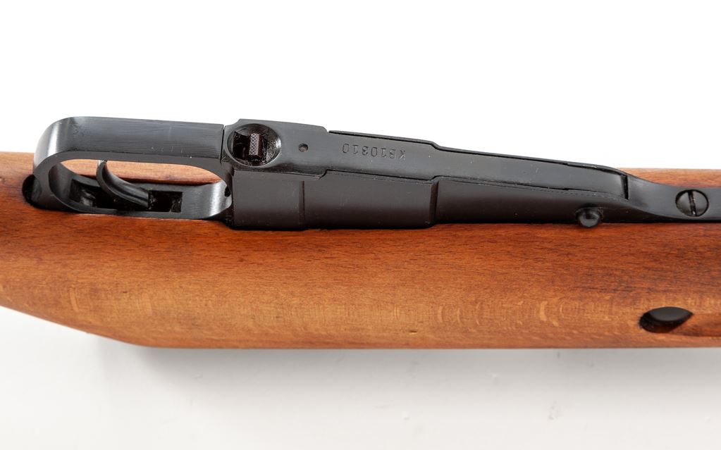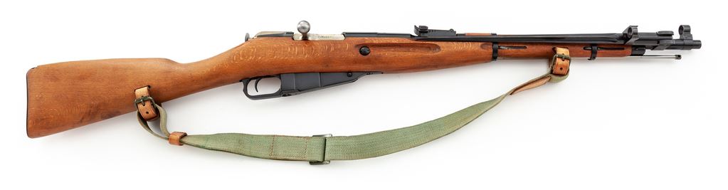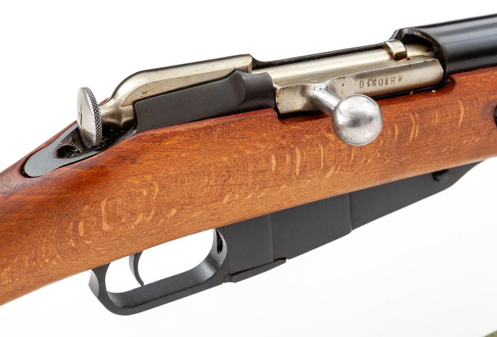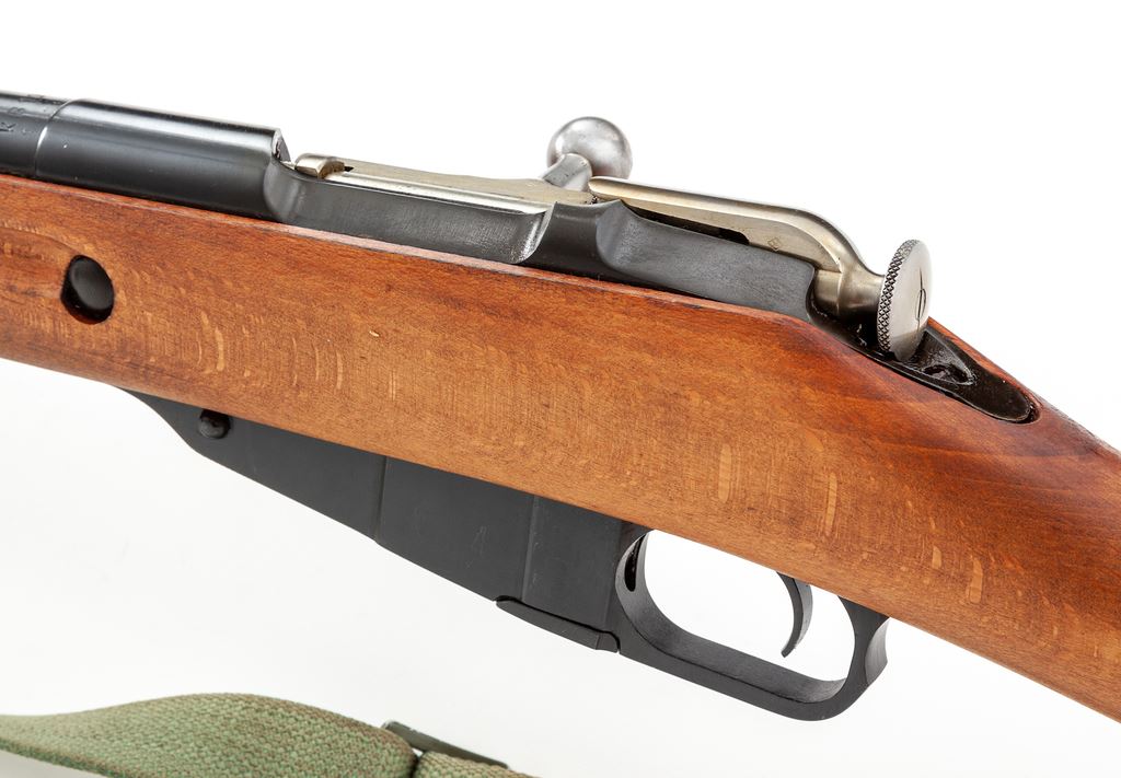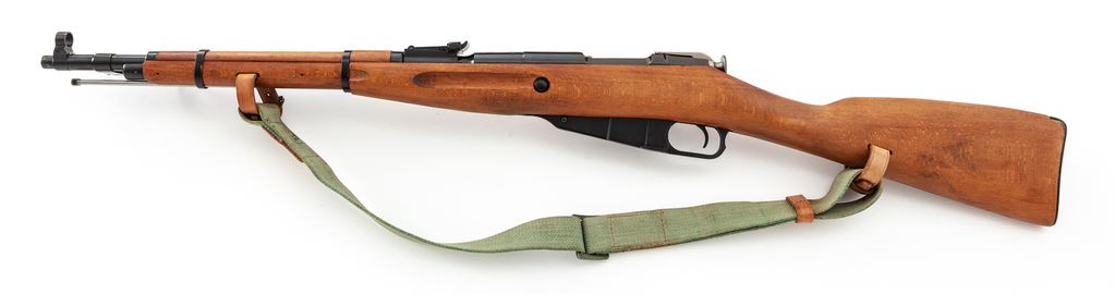 Polish M44 Mosin-Nagant Bolt Action Carbine, with folding bayonet, #KB10310, 7.62x54Rmm cal., 20.4'' barrel, blued finish, hardwood stock, hooded post front sight and adjustable tangent rear sight. Marked on barrel shank with the ''(circle)11'' mark of the Radom factory over ''1953''. ''OW'' inside diamond stamp on right side of buttstock. Matching numbers, with cleaning rod. Condition overall is excellent, with almost all of the dark blue finish remaining on the metal showing light wear to the muzzle area caused by affixing the bayonet. Bolt assembly and cleaning rod are bright. Wood is also excellent with just a couple tiny handling marks and oil darkening around the action. Action is smooth, bright bore is excellent. No visible import stamps. Bayonet is excellent and functions smoothly. Includes a cotton and leather Polish military sling in very good condition. Est.: $400-$600. (C&R)
