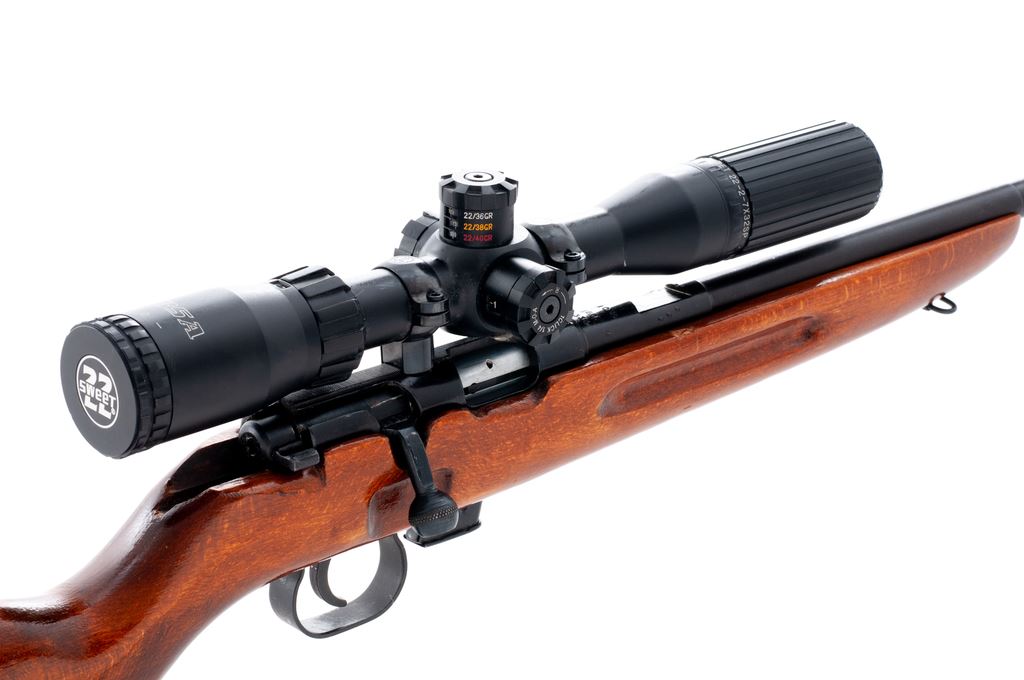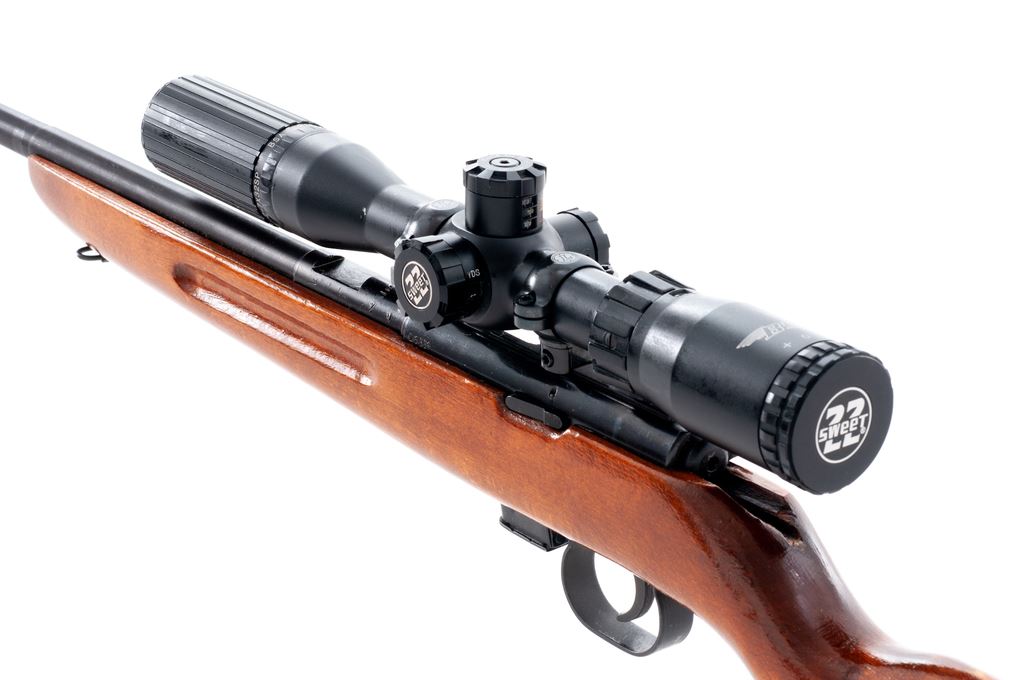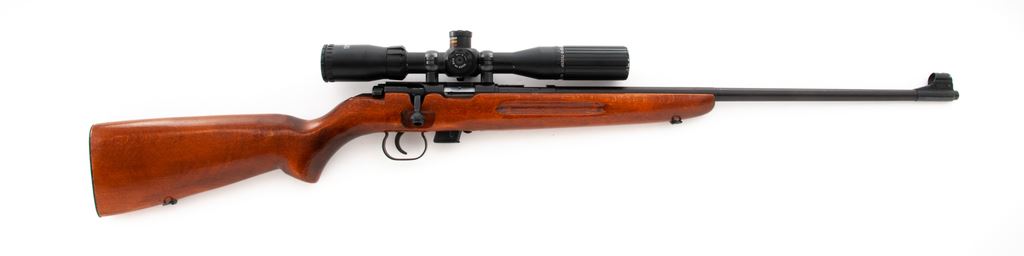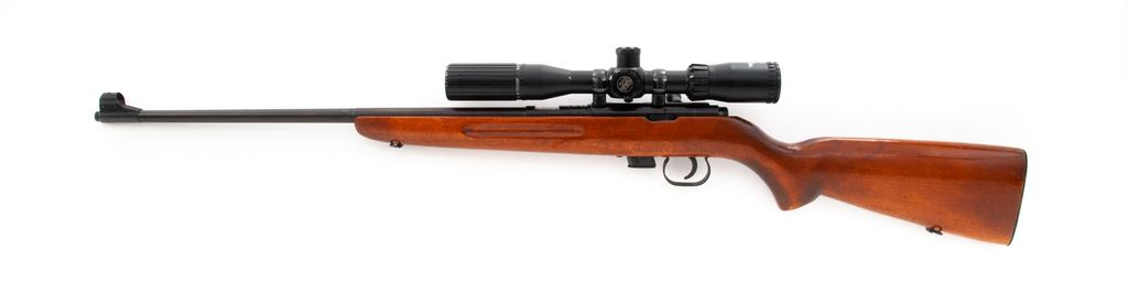Romanian IMC-2 Model 69 Bolt Action Training Rifle, with scope, #L6334, .22 LR, 23'' barrel, blue finish, one-piece pistol-grip wood stock with grooved forend, hooded silver bead front sight, rear sight has been removed, factory grooved receiver. Topped with a BSA Sweet 22 2-7x32SP scope with threaded lens covers; scope with duplex reticle. Included is one magazine. Bottom of barrel is import marked. Most of the blue finish remains, some of which was applied over small nicks and scratches on the receiver; factory lettering is clear. Wood with scattered moderate handling marks, with an added coat of varnish. Good action, bright bore with excellent rifling. Scope is also excellent with a few small marks to the exterior; optics are clear. Est.: $125-$225. (Modern)