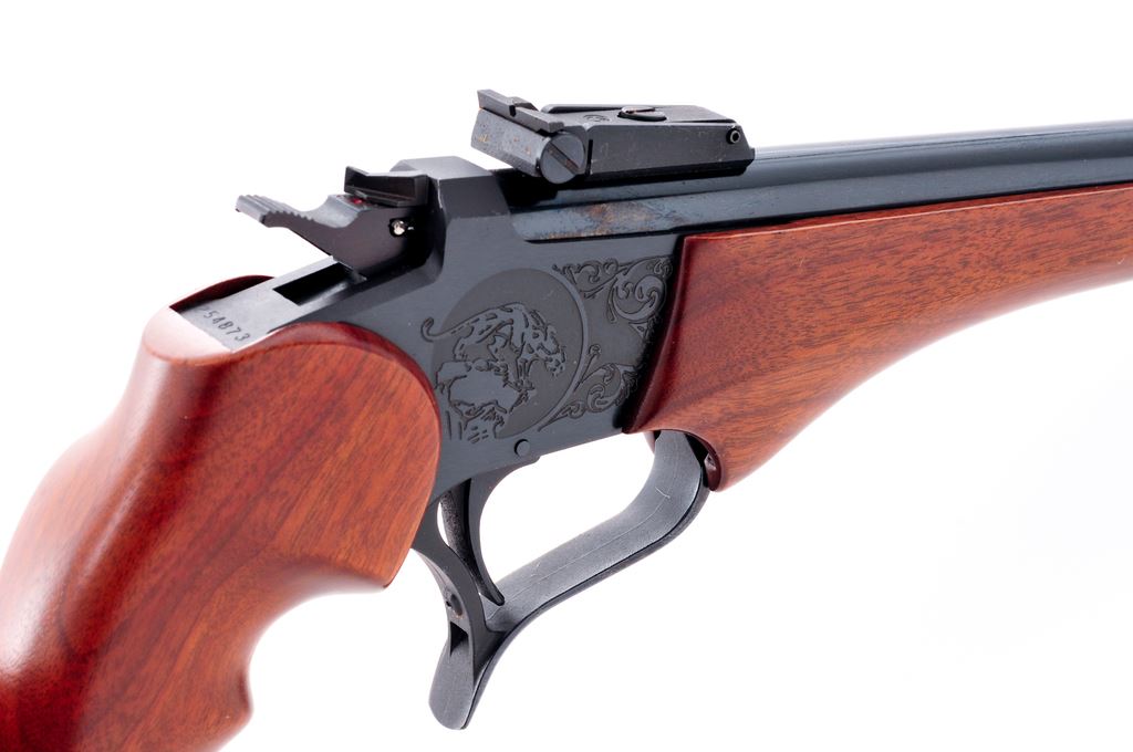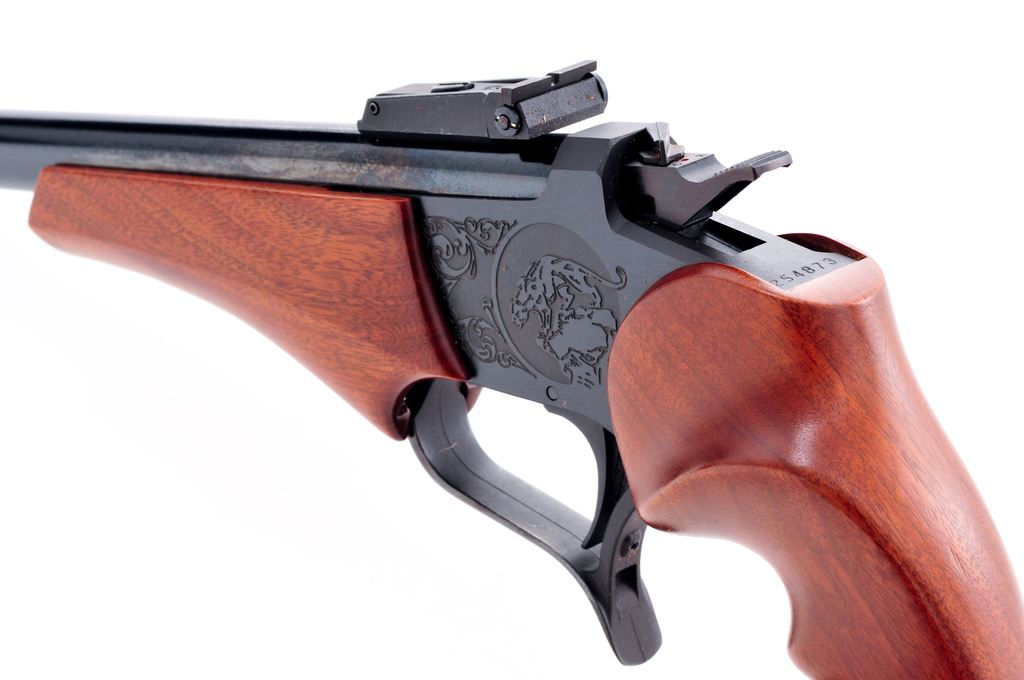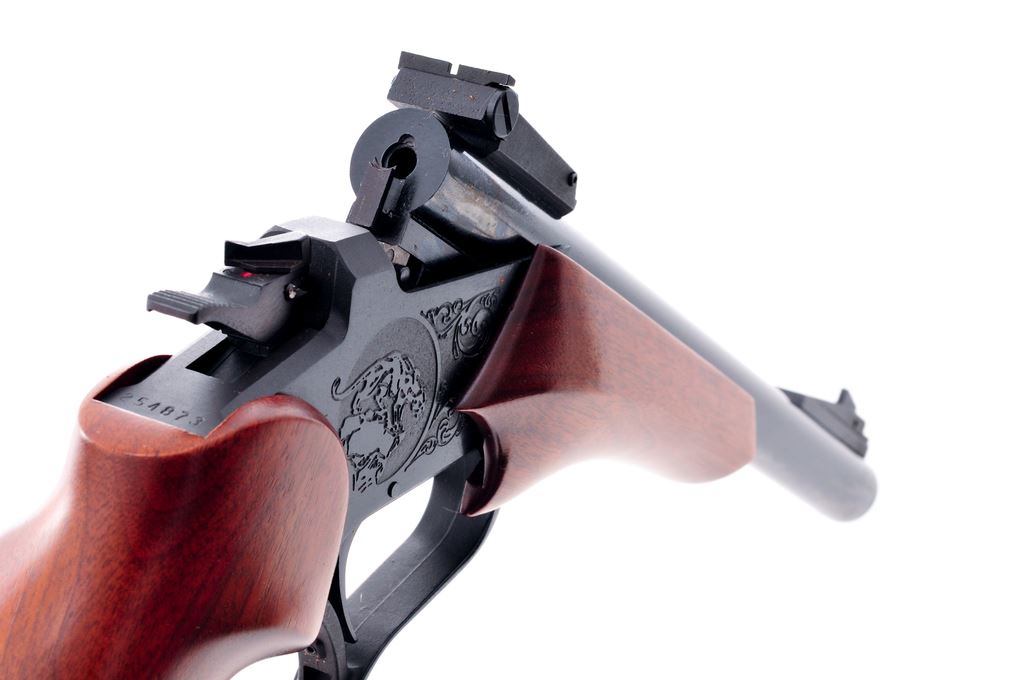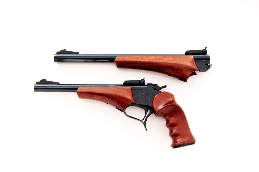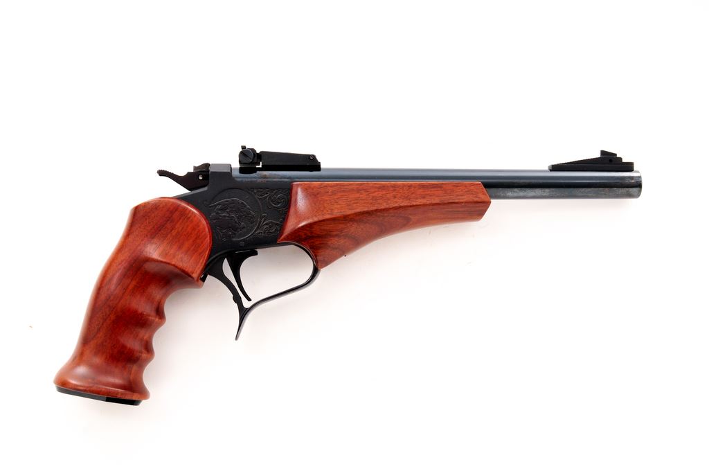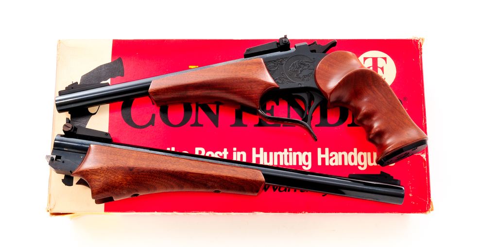 Boxed Thompson Center Arms Contender Single Shot Pistol, with additional barrel, #254873, .22 LR cal., 10'' barrel, blue finish, finger-grooved walnut thumbrest grip, walnut forend, fixed blade front sight and fully adjustable square notched rear sight. In Thompson Center box that is hand numbered to the gun, with ''TC'' styrofoam insert, owner's manual, and other misc. factory paperwork. Also included is an additional .44 magnum ''Super 14'' barrel with factory sights and walnut forend; barrel also comes in the original box. Both the pistol and additional barrel are in excellent overall condition showing only a few minor handling marks. Neither appear to have been used very often. Action is excellent with a smooth hammer, trigger, and break-open action. Both bores are bright. Est.: $450-$650. (Modern/PPT)