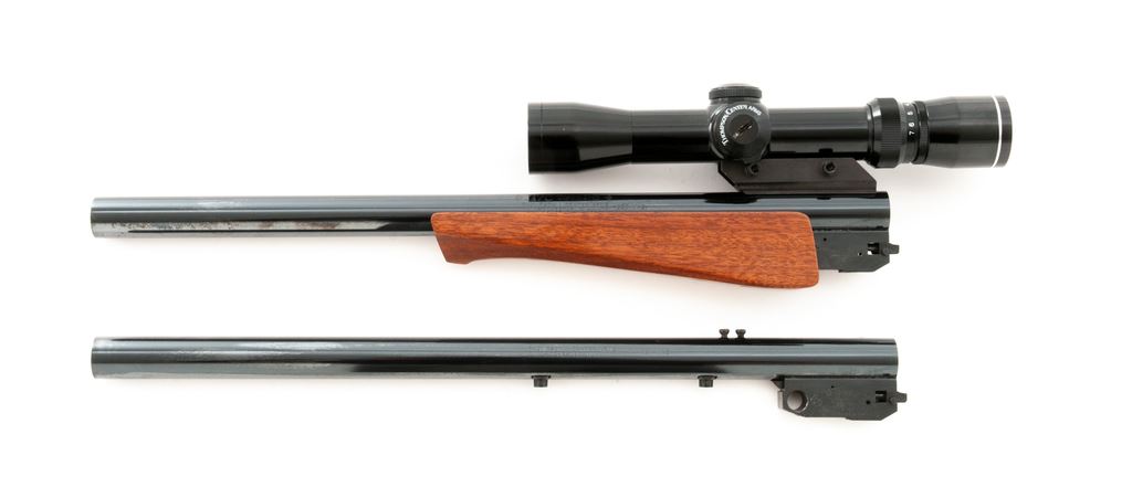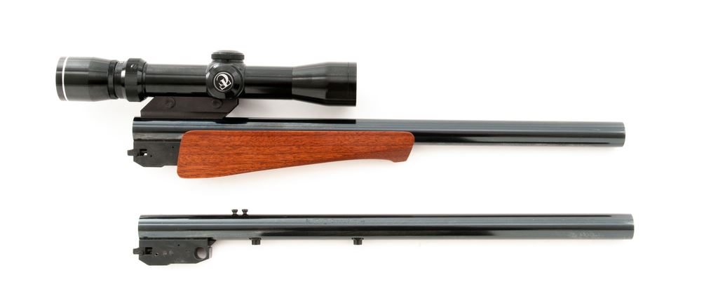 Lot of Two (2) Thompson Center Arms Custom Shop Contender Barrels: 1.) 15'' barrel marked ''T/C Custom Shop'', .357 mag. cal., blue finish, walnut forend, came from the factory without a front sight, topped with Thompson Center Arms 2.5-7x scope with duplex reticle. Condition is excellent showing a few minor handling marks. Bore is bright with sharp rifling. 2.) 15'' barrel is marked ''T/C Custom Shop, .44 mag. cal., no forend or rear sight, came from the factory without a front sight. In near excellent used condition; top with a light profile mark from a previous scope base. Bore is bright with excellent rifling. Est.: $350-$550/lot.