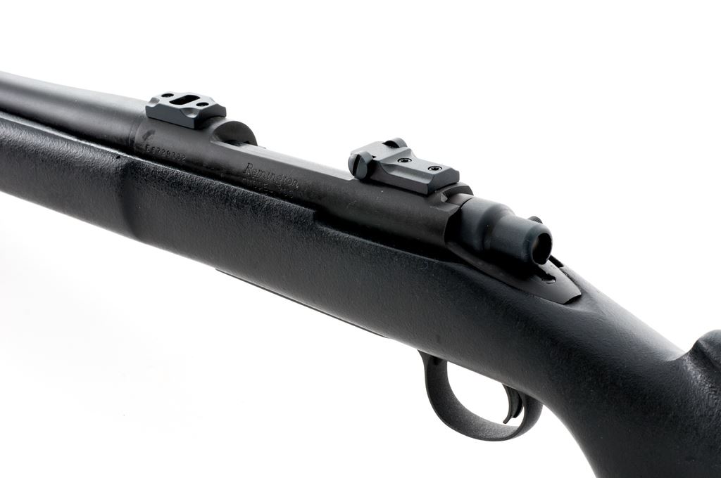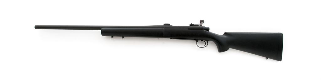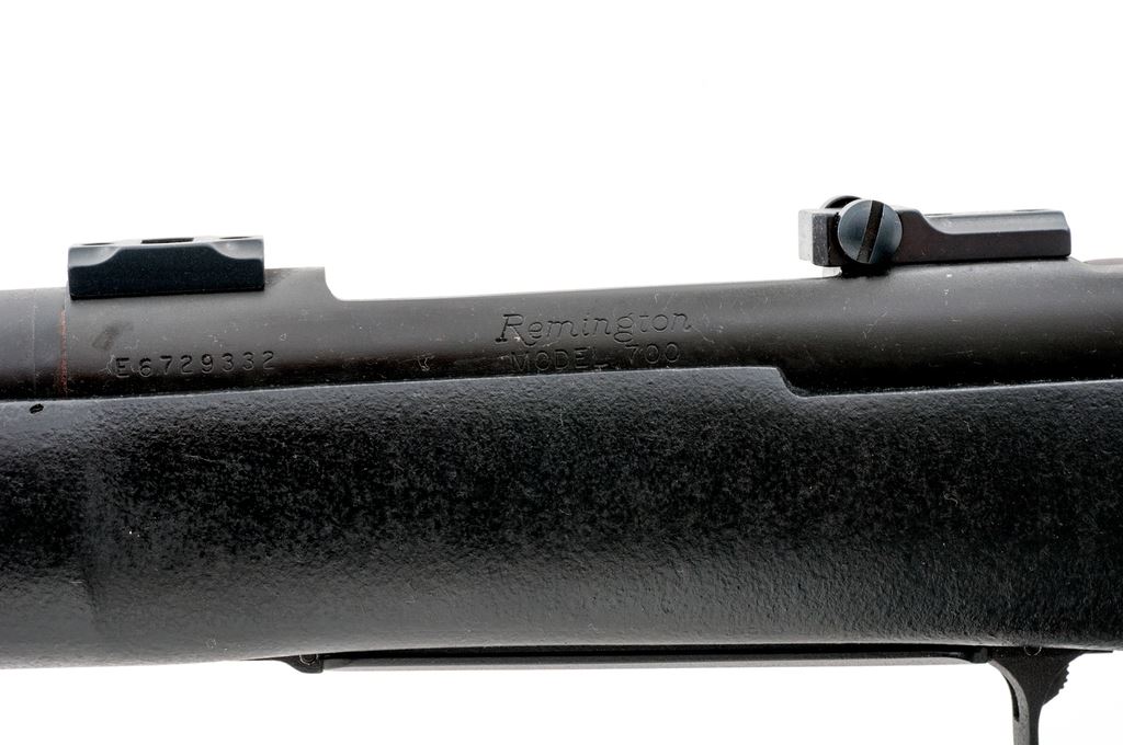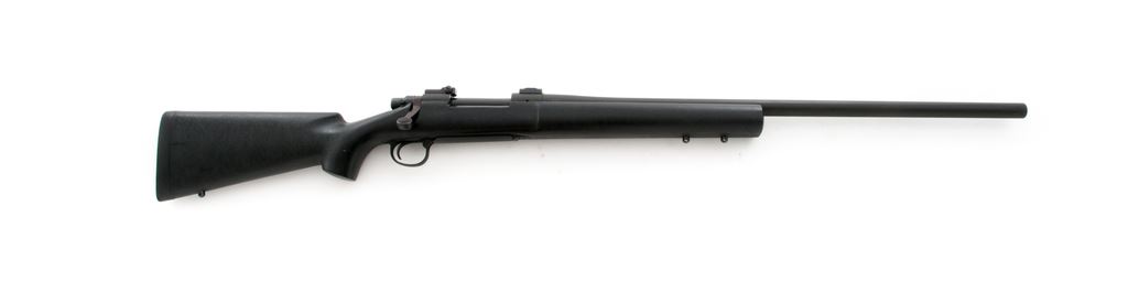 Remington Model 700 ''Police'' Bolt Action Rifle, #E6729332, 7mm Rem. mag. cal., 26'' heavy barrel, matte black finish, black composite pistol-grip stock with black rubber Remington recoil pad, and a total of three (3) sling swivel studs. Barrel came from the factory without sights; receiver with two-piece scope base. In original box with matching end label and owner's manual. Condition is near excellent. Top of barrel at about the mid-point with a small spot of concentrated scratches. Stock with normal slight scuffs and a few small handling marks. Factory lettering is crisp and clear. Action is smooth; bore is bright with excellent rifling. Est.: $500-$700. (Modern)