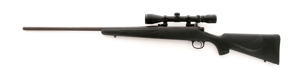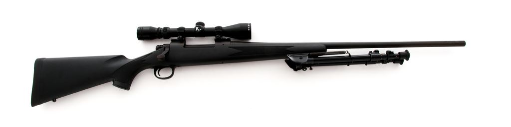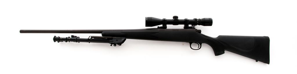 Remington Model 700 Bolt Action Rifle, #G6583670, .300 Win. mag. , 26'' barrel, matte blue finish, checkered black synthetic pistol-grip stock with cheekpiece, Harris Model 25 bipod, black rubber Remington recoil pad, sling swivel studs, and topped with a Remington 3-9x40 scope with duplex reticle. Rifle is in excellent overall condition showing only a few normal slight handling marks to the stock and metal. Factory lettering and stock checkering is clean and sharp. Action is smooth with a mirror bright bore. Scope also appears near new with bright, clear optics. Est.: $350-$500. (Modern)