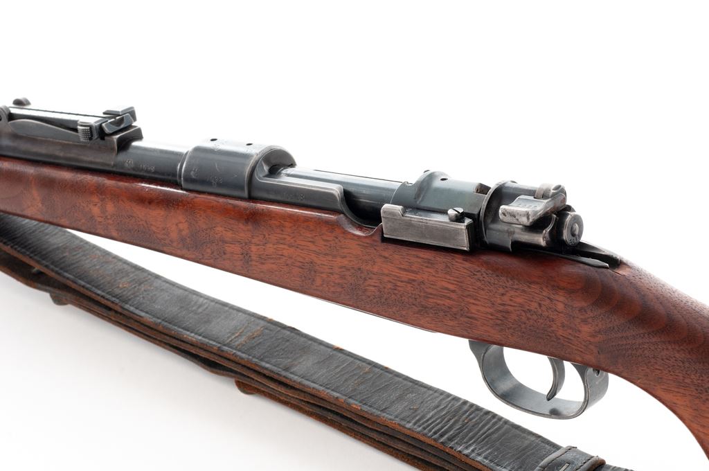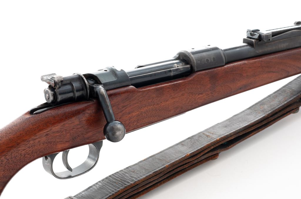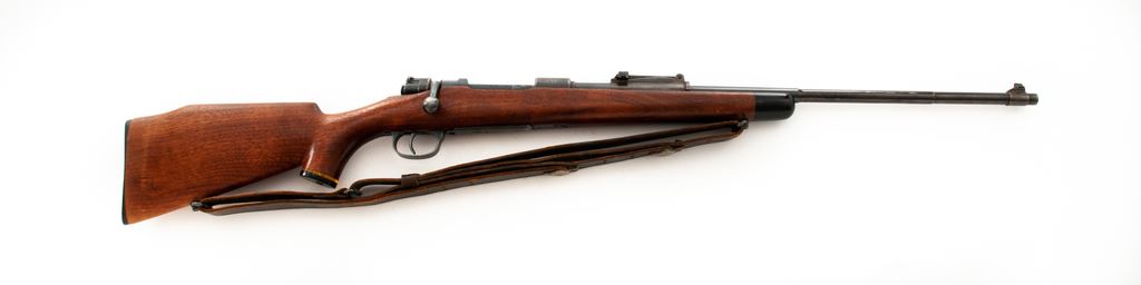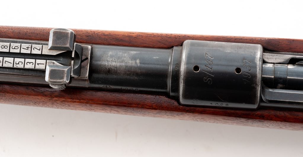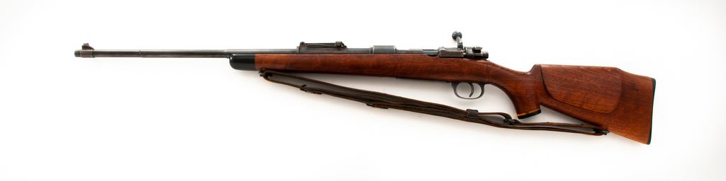 Sporterized German WWII 98K Bolt Action Rifle, #1098p, 8mm, 24'' barrel, blue finish, custom walnut cheekpiece stock, ebony forend and pistol grip cap, with standard military sight. Chamber area marked ''S/147'' and dated 1937. Includes American M1907 sling. Condition is near fine as modified. Although metal has not been cut, three scope mount holes have been drilled and tapped in upper portion of frame. All visible matching numbers. Stock is near excellent with only the smallest pressure dings at cheekpiece. Good action, very good bore that should clean. Est.: $300-$500. (Modern)